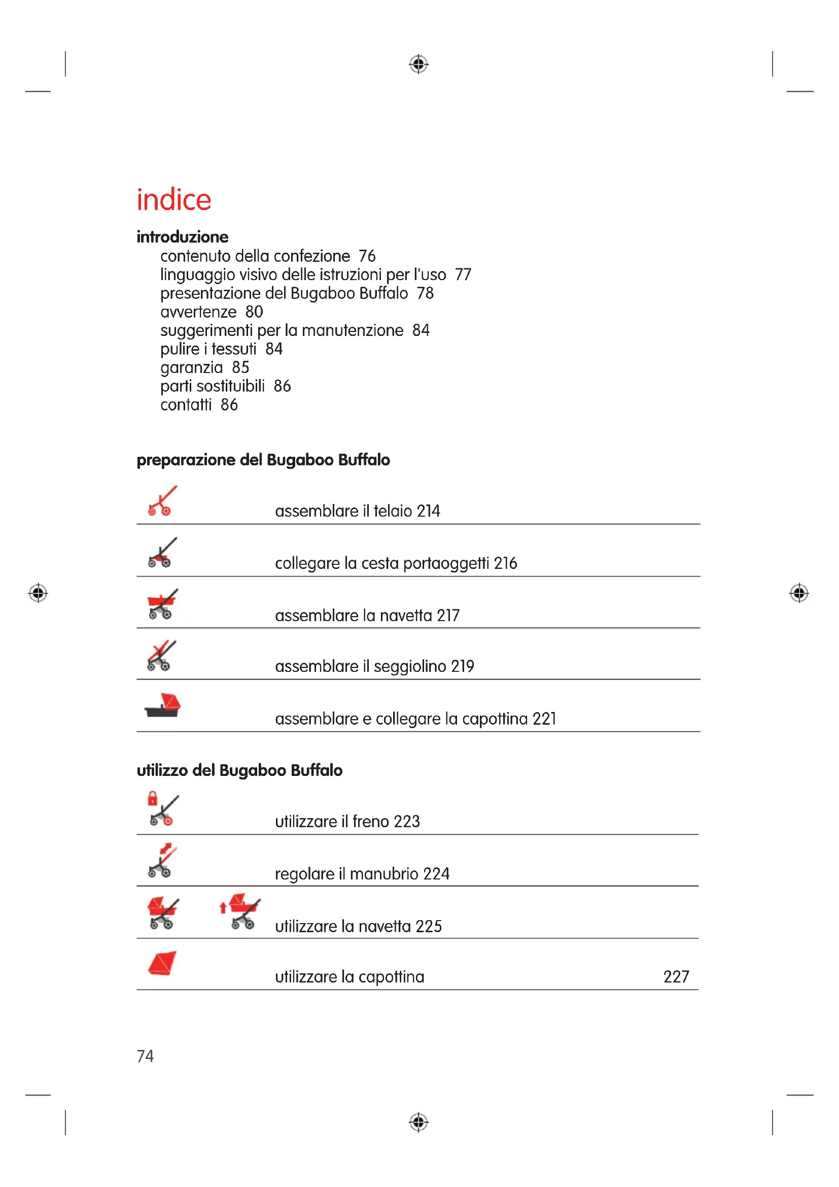 TRindice introduzione contenuto della confezione 76 linguaggio visivo delle istruzioni per l'uso 77 presentazione del Bugaboo Buffalo 78 avvertenze 80 suggerimenti per la manutenzione 84 pulire i tessuti 84 garanzia 85 parti sostituibili 86 contatti 86 preparazione del Bugaboo Buffalo assemblare il telaio 214 collegare la cesta portaoggetti 216 assemblare la navetta 217 assemblare il seggiolino 219 assemblare e collegare la capottina 221 utilizzo del Bugaboo Buffalo utilizzare il freno 223 regolare il manubrio 224 utilizzare la navetta 225 utilizzare la capottina 227 74utilizzare il seggiolino 228 utilizzare la cintura di sicurezza 231 utilizzare il manico 232 utilizzare una borsa sul manubrio 233 ripiegare in un solo elemento con la navetta rivolta verso il genitore 234 ripiegare in un solo elemento con il seggiolino rivolto verso il genitore 236 ripiegare in un solo elemento con il seggiolino rivolto verso l'esterno 238 aprire il passeggino ripiegato in un solo elemento 240 ripiegare il telaio 241 ripiegare la navetta 242 utilizzare la cinghia da polso 244 bloccare/sbloccare le ruote piroettanti per terreni accidentati 245 utilizzare la posizione a due ruote su sabbia e neve 246 rimuovere le ruote 248 utilizzare il parapioggia 249
