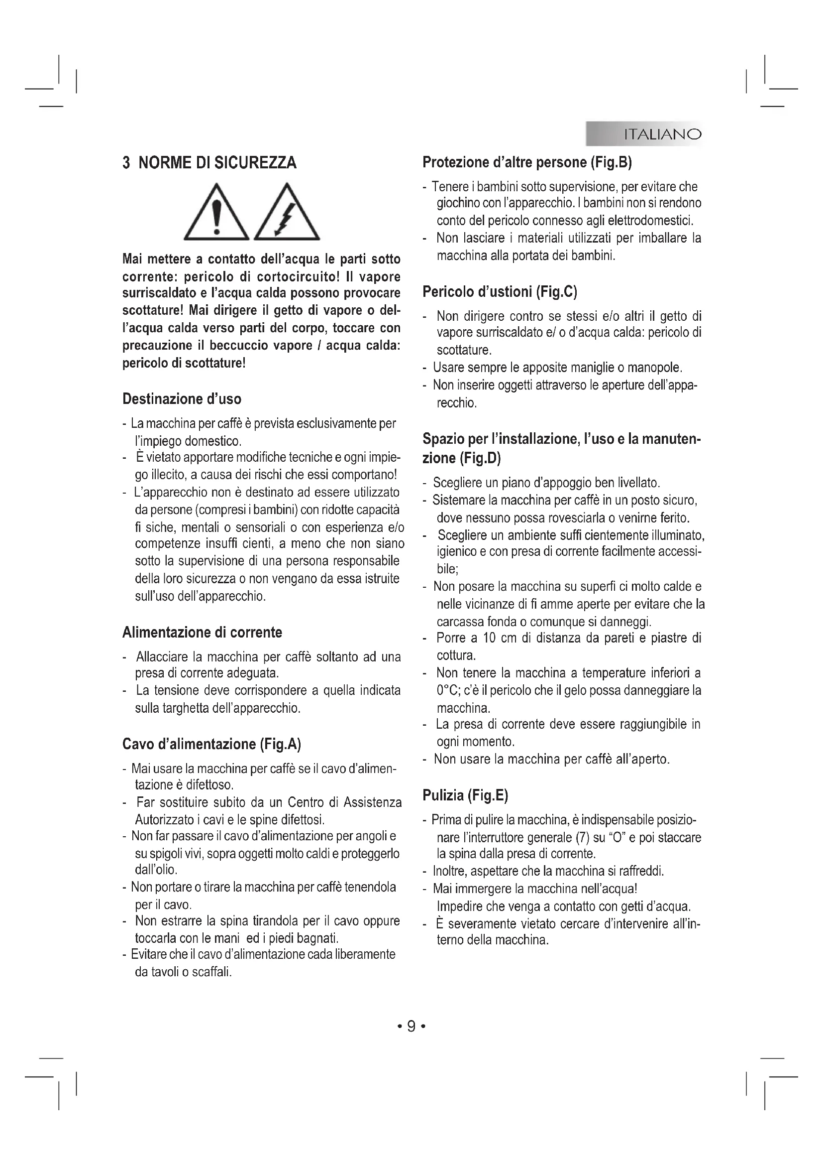 Mai mettere a contatto dell’acqua le parti sotto corrente: pericolo di cortocircuito! Il vapore surriscaldato e l’acqua calda possono provocare scottature! Mai dirigere il getto di vapore o del- l’acqua calda verso parti del corpo, toccare con precauzione il beccuccio vapore / acqua calda: pericolo di scottature! Destinazione d’uso - La macchina per caffè è prevista esclusivamente per l’impiego domestico. - È vietato apportare modifi che tecniche e ogni impie- go illecito, a causa dei rischi che essi comportano! - L’apparecchio non è destinato ad essere utilizzato da persone (compresi i bambini) con ridotte capacità fi siche, mentali o sensoriali o con esperienza e/o competenze insuffi cienti, a meno che non siano sotto la supervisione di una persona responsabile della loro sicurezza o non vengano da essa istruite sull’uso dell’apparecchio. Alimentazione di corrente - Allacciare la macchina per caffè soltanto ad una presa di corrente adeguata. - La tensione deve corrispondere a quella indicata sulla targhetta dell’apparecchio. Cavo d’alimentazione (Fig.A) - Mai usare la macchina per caffè se il cavo d’alimen- tazione è difettoso. - Far sostituire subito da un Centro di Assistenza Autorizzato i cavi e le spine difettosi. - Non far passare il cavo d’alimentazione per angoli e su spigoli vivi, sopra oggetti molto caldi e proteggerlo dall’olio. - Non portare o tirare la macchina per caffè tenendola per il cavo. - Non estrarre la spina tirandola per il cavo oppure toccarla con le mani ed i piedi bagnati. - Evitare che il cavo d’alimentazione cada liberamente da tavoli o scaffali. Protezione d’altre persone (Fig.B) - Tenere i bambini sotto supervisione, per evitare che giochino con l’apparecchio. I bambini non si rendono conto del pericolo connesso agli elettrodomestici. - Non lasciare i materiali utilizzati per imballare la macchina alla portata dei bambini. Pericolo d’ustioni (Fig.C) - Non dirigere contro se stessi e/o altri il getto di vapore surriscaldato e/ o d’acqua calda: pericolo di scottature. - Usare sempre le apposite maniglie o manopole. - Non inserire oggetti attraverso le aperture dell’appa- recchio. Spazio per l’installazione, l’uso e la manuten- zione (Fig.D) - Scegliere un piano d’appoggio ben livellato. - Sistemare la macchina per caffè in un posto sicuro, dove nessuno possa rovesciarla o venirne ferito. - Scegliere un ambiente suffi cientemente illuminato, igienico e con presa di corrente facilmente accessi- bile; - Non posare la macchina su superfi ci molto calde e nelle vicinanze di fi amme aperte per evitare che la carcassa fonda o comunque si danneggi. - Porre a 10 cm di distanza da pareti e piastre di cottura. - Non tenere la macchina a temperature inferiori a 0°C; c’è il pericolo che il gelo possa danneggiare la macchina. - La presa di corrente deve essere raggiungibile in ogni momento. - Non usare la macchina per caffè all’aperto. Pulizia (Fig.E) - Prima di pulire la macchina, è indispensabile posizio- nare l’interruttore generale (7) su “O” e poi staccare la spina dalla presa di corrente. - Inoltre, aspettare che la macchina si raffreddi. - Mai immergere la macchina nell’acqua! Impedire che venga a contatto con getti d’acqua. - È severamente vietato cercare d’intervenire all’in- terno della macchina.ITALIANO