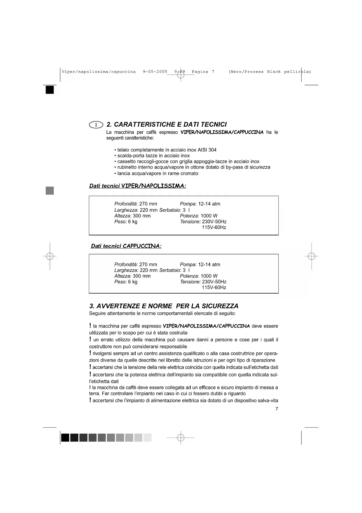 Seguire attentamente le norme comportamentali elencate di seguito: ! la macchina per caffè espresso VIPER/NAPOLISSIMA/CAPPUCCINA deve essere utilizzata per lo scopo per cui è stata costruita ! un errato utilizzo della macchina può causare danni a persone e cose per i quali il costruttore non può considerarsi responsabile ! rivolgersi sempre ad un centro assistenza qualificato o alla casa costruttrice per opera- zioni diverse da quelle descritte nel libretto delle istruzioni e per ogni tipo di riparazione ! accertarsi che la tensione della rete elettrica coincida con quella indicata sull’etichetta dati ! accertarsi che la potenza elettrica dell’impianto sia compatibile con quella indicata sul- l’etichetta dati ! la macchina da caffè deve essere collegata ad un efficace e sicuro impianto di messa a terra. Far controllare l’impianto nel caso in cui ci fossero dubbi a riguardo ! accertarsi che l’impianto di alimentazione elettrica sia dotato di un dispositivo salva-vita Viper/napolissima/capuccina 9-05-2005 9:29 Pagina 7 (Nero/Process Black pellicola)8 ben funzionante e di una sezione dei conduttori adeguata alla potenza di assorbimento ! per ogni tipo di anomalia o inconveniente non specificato, staccare la spina dalla cor- rente, astenersi da interventi diretti di verifica e/o riparazione e rivolgersi ad un centro assistenza qualificato o alla casa costruttrice ! non riempire il serbatoio di acqua quando la macchina è collegata alla rete elettrica ! verificare la presenza dell’acqua nel serbatoio quando la macchina è in funzione ! non dimenticare, dopo aver utilizzato il vapore, di disattivare l’interruttore vapore ! non porre le mani ad altre parti del corpo nella direzione della lancia acqua/vapore. L’acqua e il vapore possono provocare gravi ustioni ! non introdurre mani, parti del corpo ed oggetti all’interno della macchina se collegata elettricamente ! non toccare la macchina con mani o piedi bagnati o umidi ! non toccare le parti roventi della macchina (parte inferiore del gruppo erogatore caffè e lancia acqua/vapore) ! prima di effettuare qualsiasi operazione di manutenzione ordinaria accertarsi di avere scollegato la spina dalla rete elettrica, facendo attenzione a non tirare il cavo di alimen- tazione, o di aver disattivato l’interruttore generale ! se il cavo di alimentazione dovesse essere danneggiato esso dovrà essere sostituito da un nuovo cavo disponibile presso l’azienda costruttrice e/o il suo centro assistenza ! non immergere la macchina da caffè in nessun tipo di liquido ! non utilizzare detersivi o sostanze abrasive per la pulizia della macchina ! non lasciare la macchina esposta agli agenti atmosferici ! non lasciare la macchina a portata di bambini e di persone incapaci di utilizzarla ! tenere la macchina da caffè lontana da ogni fonte di calore
