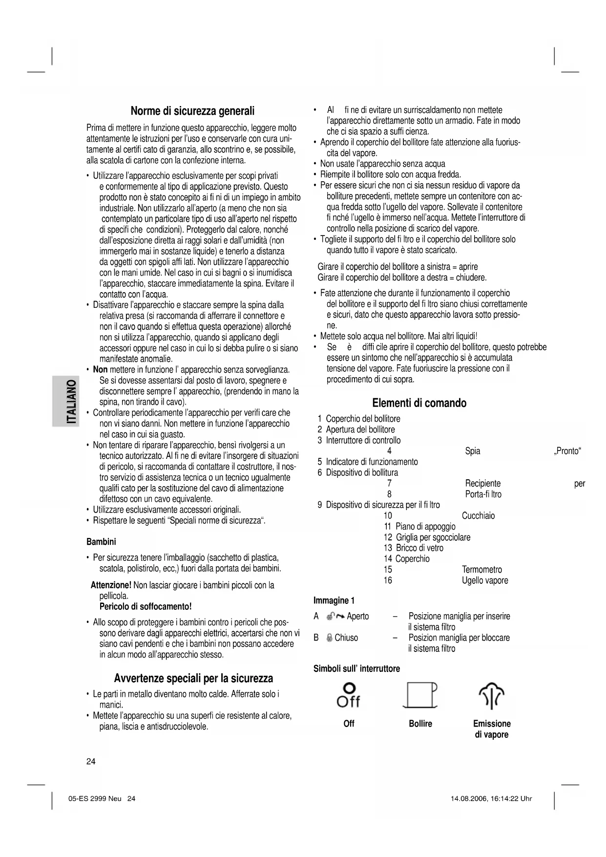 - Se è diffi cile aprire il coperchio del bollitore, questo potrebbe essere un sintomo che nell’apparecchio si è accumulata tensione del vapore. Fate fuoriuscire la pressione con il procedimento di cui sopra. Elementi di comando 1 Coperchio del bollitore 2 Apertura del bollitore 3 Interruttore di controllo 4 Spia „Pronto“ 5 Indicatore di funzionamento 6 Dispositivo di bollitura 7 Recipiente per fi ltro 8 Porta-fi ltro 9 Dispositivo di sicurezza per il fi ltro 10 Cucchiaio 11 Piano di appoggio 12 Griglia per sgocciolare 13 Bricco di vetro 14 Coperchio 15 Termometro 16 Ugello vapore Immagine 1 A Aperto – Posizione maniglia per inserire il sistema fi ltro B Chiuso – Posizion maniglia per bloccare il sistema fi ltro Simboli sull’ interruttore Off Bollire Emissione di vapore 05-ES 2999 Neu 24 14.08.2006, 16:14:22 UhrITALIANO