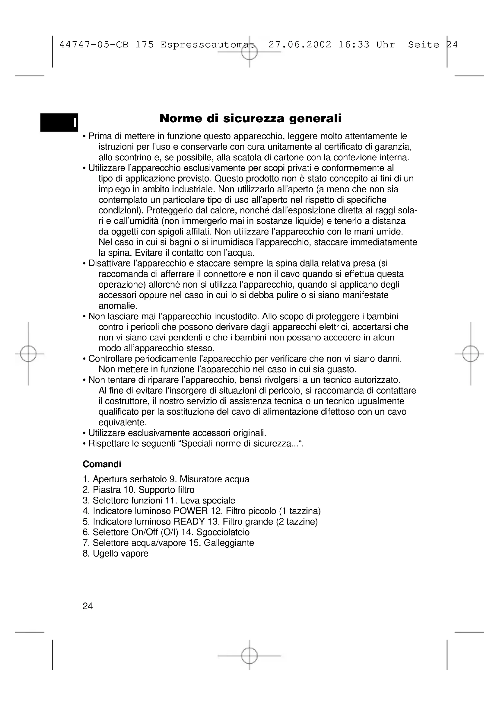 44747-05-CB 175 Espressoautomat 27.06.2002 16:33 Uhr Seite 24Prima della messa in funzione Con cautela togliere la macchina per espresso dall’imballaggio. Estrarre tutti gli accessori e il materiale di imballaggio. Lavare gli accessori in acqua e detergente per stoviglie. Prima di preparare il primo espresso, lavare l’apparecchio facendovi scorrere acqua fresca, come descritto nei punti 1 - 8 “Preparazione dell’espresso”, tuttavia senza caffè. Preparazione dell’espresso
