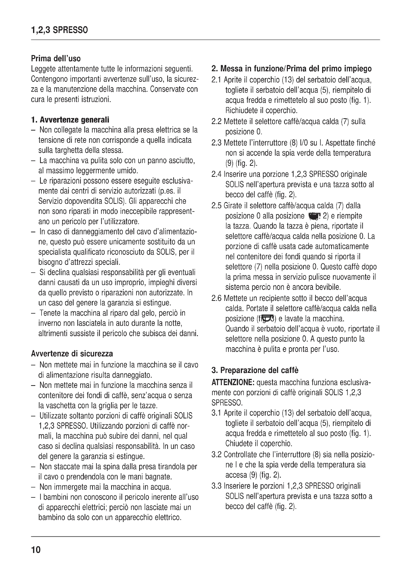 – Non collegate la macchina alla presa elettrica se la tensione di rete non corrisponde a quella indicata sulla targhetta della stessa. – La macchina va pulita solo con un panno asciutto, al massimo leggermente umido. – Le riparazioni possono essere eseguite esclusiva- mente dai centri di servizio autorizzati (p.es. il Servizio dopovendita SOLIS). Gli apparecchi che non sono riparati in modo ineccepibile rappresent- ano un pericolo per l’utilizzatore. – In caso di danneggiamento del cavo d’alimentazio- ne, questo può essere unicamente sostituito da un specialista qualificato riconosciuto da SOLIS, per il bisogno d’attrezzi speciali. – Si declina qualsiasi responsabilità per gli eventuali danni causati da un uso improprio, impieghi diversi da quello previsto o riparazioni non autorizzate. In un caso del genere la garanzia si estingue. – Tenete la macchina al riparo dal gelo, perciò in inverno non lasciatela in auto durante la notte, altrimenti sussiste il pericolo che subisca dei danni. Avvertenze di sicurezza – Non mettete mai in funzione la macchina se il cavo di alimentazione risulta danneggiato. – Non mettete mai in funzione la macchina senza il contenitore dei fondi di caffè, senz’acqua o senza la vaschetta con la griglia per le tazze. – Utilizzate soltanto porzioni di caffè originali SOLIS 1,2,3 SPRESSO. Utilizzando porzioni di caffè nor- mali, la macchina può subire dei danni, nel qual caso si declina qualsiasi responsabilità. In un caso del genere la garanzia si estingue. – Non staccate mai la spina dalla presa tirandola per il cavo o prendendola con le mani bagnate. – Non immergete mai la macchina in acqua. – I bambini non conoscono il pericolo inerente all’uso di apparecchi elettrici; perciò non lasciate mai un bambino da solo con un apparecchio elettrico.