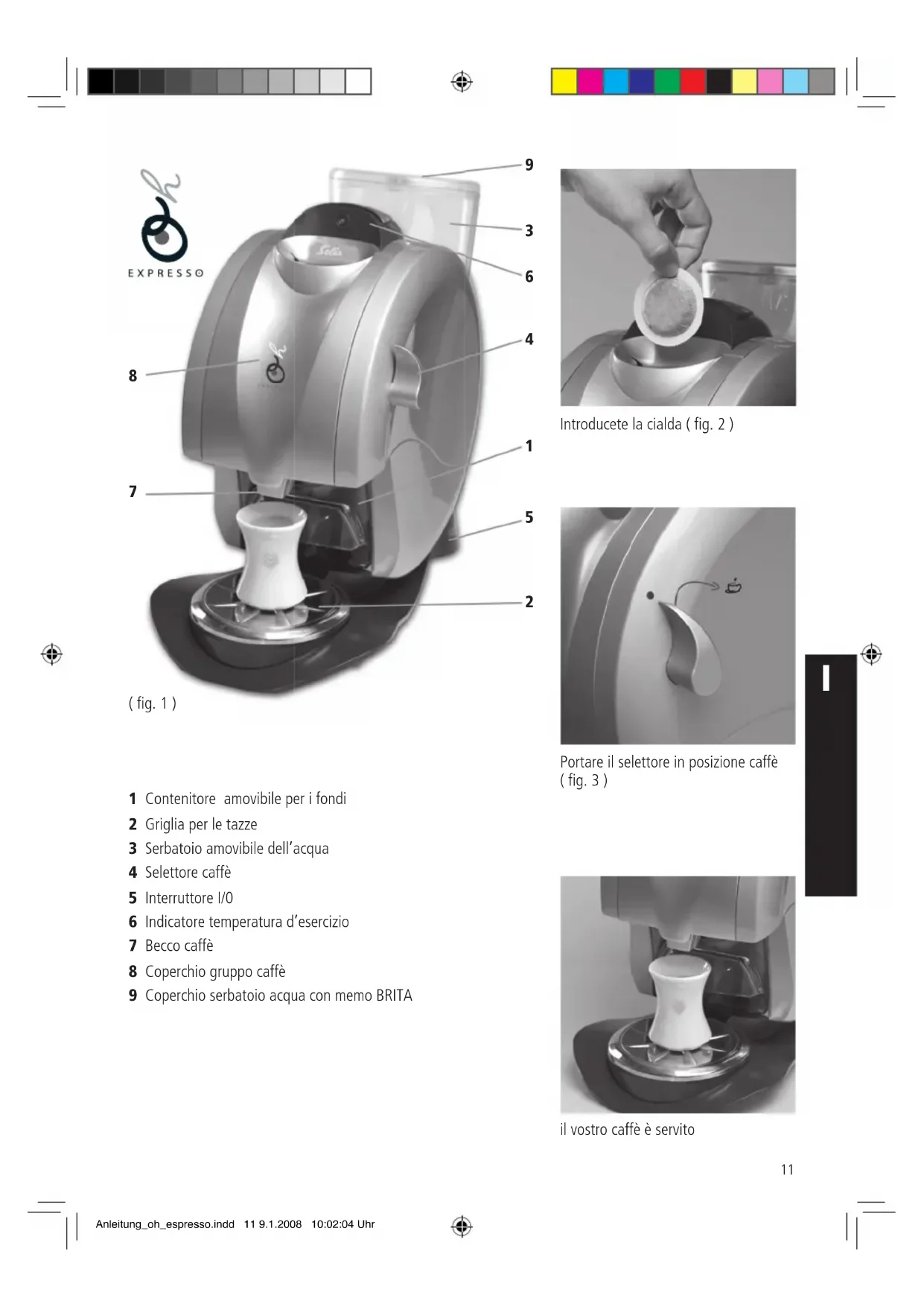 1 Contenitore amovibile per i fondi 2 Griglia per le tazze 3 Serbatoio amovibile dell’acqua 4 Selettore caffè 5 Interruttore I/0 6 Indicatore temperatura d’esercizio 7 Becco caffè 8 Coperchio gruppo caffè 9 Coperchio serbatoio acqua con memo BRITA Introducete la cialda ( fig. 2 ) Portare il selettore in posizione caffè ( fig. 3 ) il vostro caffè è servito ( fig. 1 ) Anleitung_oh_espresso.indd 11 9.1.2008 10:02:04 UhrI Prima dell’uso Leggete attentamente tutte le informazioni se- guenti. Contengono importanti avvertenze sull’uso, la sicurezza e la manutenzione della macchina. Conservate con cura le presenti istruzioni.