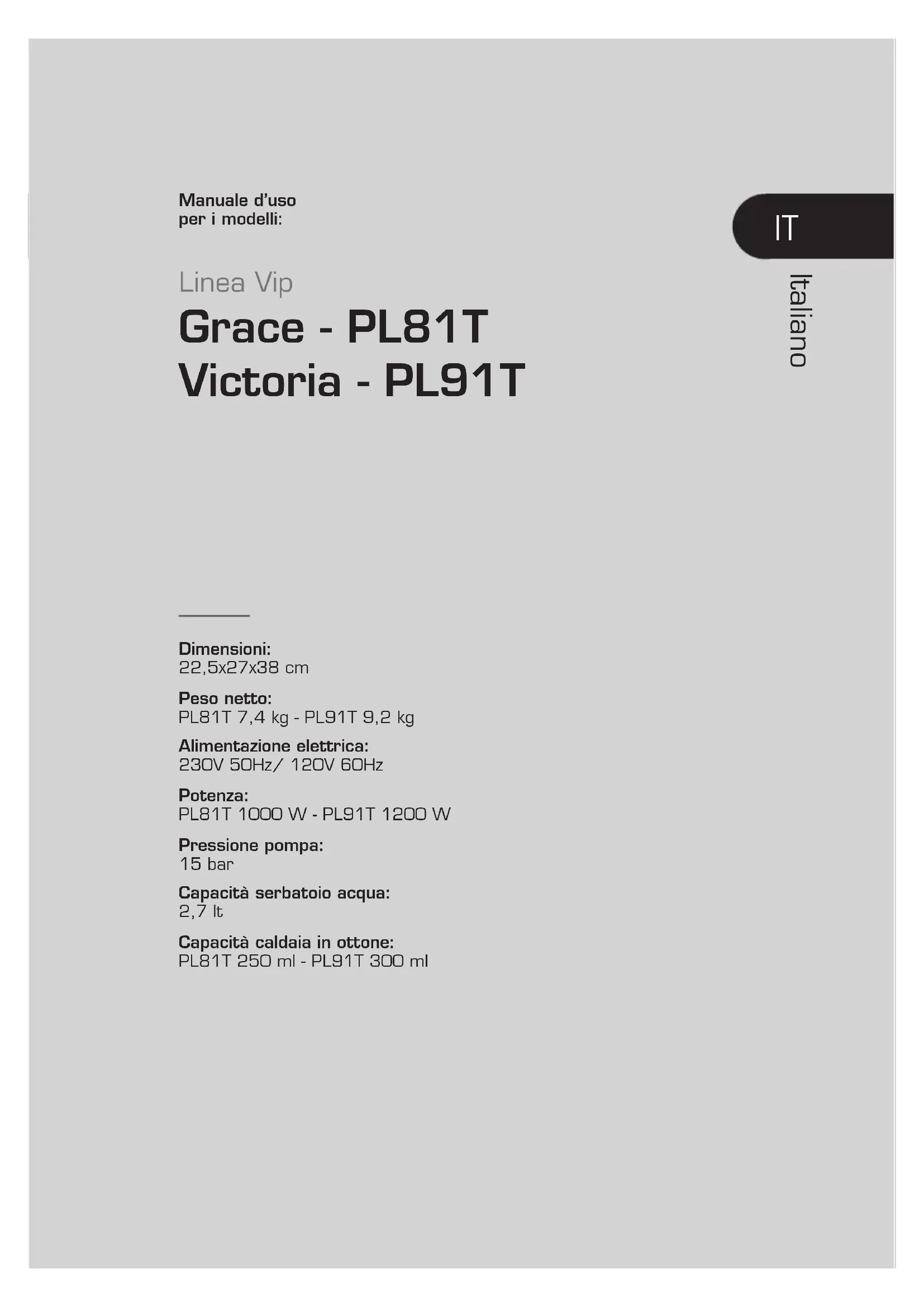 27VIP Line - Grace - PL81T · Victoria - PL91T 28Dimensioni: 22,5x27x38 cm Peso netto: PL81T 7,4 kg - PL91T 9,2 kg Alimentazione elettrica: 230V 50Hz/ 120V 60Hz Potenza: PL81T 1000 W - PL91T 1200 W Pressione pompa: 15 bar Capacità serbatoio acqua: 2,7 lt Capacità caldaia in ottone: PL81T 250 ml - PL91T 300 ml Linea Vip Grace - PL81T Victoria - PL91T Manuale d’uso per i modelli: Italiano ITLinea VIP - Grace - PL81T · Victoria - PL91T