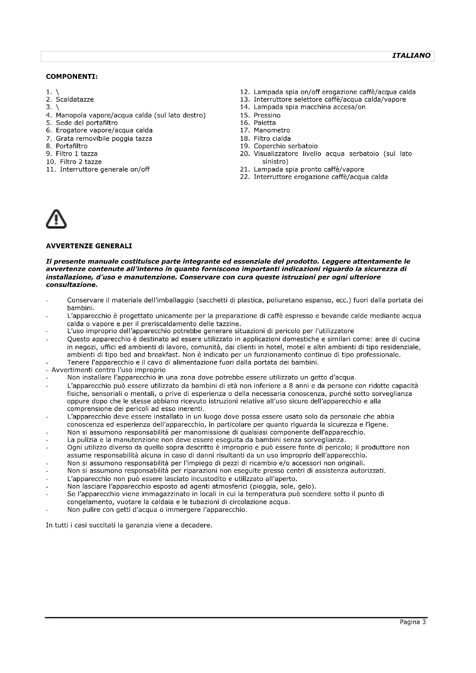 AVVERTENZE GENERALI Il presente manuale costituisce parte integrante ed essenziale del prodotto. Leggere attentamente le avvertenze contenute all’interno in quanto forniscono importanti indicazioni riguardo la sicurezza di installazione, d’uso e manutenzione. Conservare con cura queste istruzioni per ogni ulteriore consultazione. - Conservare il materiale dell’imballaggio (sacchetti di plastica, poliuretano espanso, ecc.) fuori dalla portata dei bambini. - L’apparecchio è progettato unicamente per la preparazione di caffè espresso e bevande calde mediante acqua calda o vapore e per il preriscaldamento delle tazzine. - L’uso improprio dell’apparecchio potrebbe generare situazioni di pericolo per l’utilizzatore - Questo apparecchio è destinato ad essere utilizzato in applicazioni domestiche e similari come: aree di cucina in negozi, uffici ed ambienti di lavoro, comunità, dai clienti in hotel, motel e altri ambienti di tipo residenziale, ambienti di tipo bed and breakfast. Non è indicato per un funzionamento continuo di tipo professionale. - Tenere l'apparecchio e il cavo di alimentazione fuori dalla portata dei bambini. - Avvertimenti contro l’uso improprio - Non installare l’apparecchio in una zona dove potrebbe essere utilizzato un getto d’acqua. - L’apparecchio può essere utilizzato da bambini di età non inferiore a 8 anni e da persone con ridotte capacità fisiche, sensoriali o mentali, o prive di esperienza o della necessaria conoscenza, purché sotto sorveglianza oppure dopo che le stesse abbiano ricevuto istruzioni relative all’uso sicuro dell’apparecchio e alla comprensione dei pericoli ad esso inerenti. - L’apparecchio deve essere installato in un luogo dove possa essere usato solo da personale che abbia conoscenza ed esperienza dell’apparecchio, in particolare per quanto riguarda la sicurezza e l’igene. - Non si assumono responsabilità per manomissione di qualsiasi componente dell’apparecchio. - La pulizia e la manutenzione non deve essere eseguita da bambini senza sorveglianza. - Ogni utilizzo diverso da quello sopra descritto è improprio e può essere fonte di pericolo; il produttore non assume responsabilità alcuna in caso di danni risultanti da un uso improprio dell’apparecchio. - Non si assumono responsabilità per l’impiego di pezzi di ricambio e/o accessori non originali. - Non si assumono responsabilità per riparazioni non eseguite presso centri di assistenza autorizzati. - L’apparecchio non può essere lasciato incustodito e utilizzato all’aperto. - Non lasciare l’apparecchio esposto ad agenti atmosferici (pioggia, sole, gelo). - Se l’apparecchio viene immagazzinato in locali in cui la temperatura può scendere sotto il punto di congelamento, vuotare la caldaia e le tubazioni di circolazione acqua. - Non pulire con getti d’acqua o immergere l’apparecchio. In tutti i casi succitati la garanzia viene a decadere.Pagina 4 ITALIANO