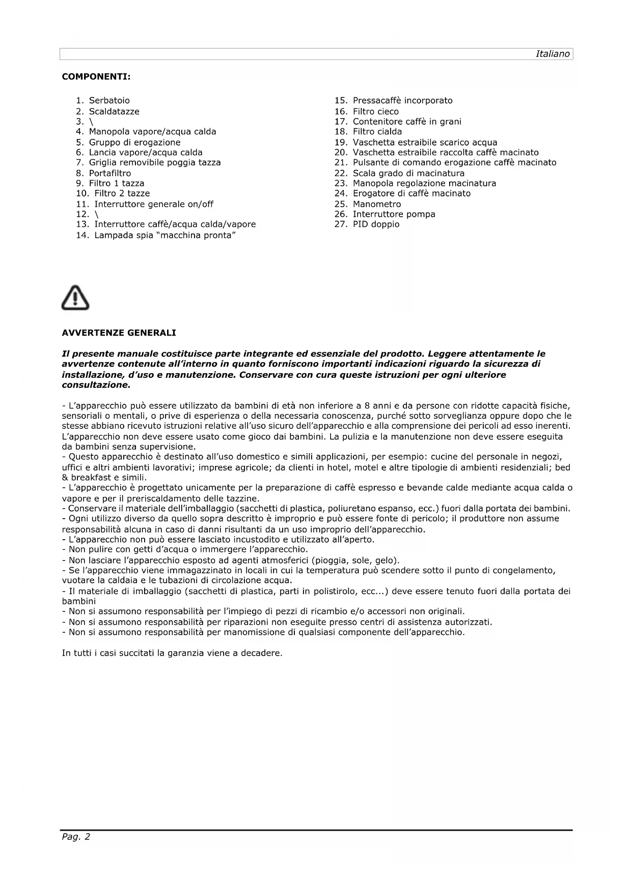 AVVERTENZE GENERALI Il presente manuale costituisce parte integrante ed essenziale del prodotto. Leggere attentamente le avvertenze contenute all’interno in quanto forniscono importanti indicazioni riguardo la sicurezza di installazione, d’uso e manutenzione. Conservare con cura queste istruzioni per ogni ulteriore consultazione. - L’apparecchio può essere utilizzato da bambini di età non inferiore a 8 anni e da persone con ridotte capacità fisiche, sensoriali o mentali, o prive di esperienza o della necessaria conoscenza, purché sotto sorveglianza oppure dopo che le stesse abbiano ricevuto istruzioni relative all’uso sicuro dell’apparecchio e alla comprensione dei pericoli ad esso inerenti. L’apparecchio non deve essere usato come gioco dai bambini. La pulizia e la manutenzione non deve essere eseguita da bambini senza supervisione. - Questo apparecchio è destinato all’uso domestico e simili applicazioni, per esempio: cucine del personale in negozi, uffici e altri ambienti lavorativi; imprese agricole; da clienti in hotel, motel e altre tipologie di ambienti residenziali; bed & breakfast e simili. - L’apparecchio è progettato unicamente per la preparazione di caffè espresso e bevande calde mediante acqua calda o vapore e per il preriscaldamento delle tazzine. - Conservare il materiale dell’imballaggio (sacchetti di plastica, poliuretano espanso, ecc.) fuori dalla portata dei bambini. - Ogni utilizzo diverso da quello sopra descritto è improprio e può essere fonte di pericolo; il produttore non assume responsabilità alcuna in caso di danni risultanti da un uso improprio dell’apparecchio. - L’apparecchio non può essere lasciato incustodito e utilizzato all’aperto. - Non pulire con getti d’acqua o immergere l’apparecchio. - Non lasciare l’apparecchio esposto ad agenti atmosferici (pioggia, sole, gelo). - Se l’apparecchio viene immagazzinato in locali in cui la temperatura può scendere sotto il punto di congelamento, vuotare la caldaia e le tubazioni di circolazione acqua. - Il materiale di imballaggio (sacchetti di plastica, parti in polistirolo, ecc...) deve essere tenuto fuori dalla portata dei bambini - Non si assumono responsabilità per l’impiego di pezzi di ricambio e/o accessori non originali. - Non si assumono responsabilità per riparazioni non eseguite presso centri di assistenza autorizzati. - Non si assumono responsabilità per manomissione di qualsiasi componente dell’apparecchio. In tutti i casi succitati la garanzia viene a decadere.Pag. 3 Italiano