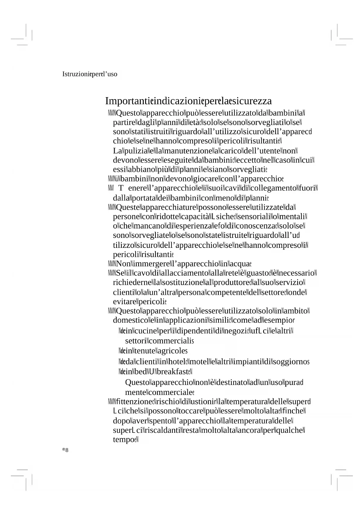 - Questo apparecchio può essere utilizzato da bambini a partire dagli 8 anni di età, solo se sono sorvegliati o se sono stati istruiti riguardo all’utilizzo sicuro dell’apparec- chio e se ne hanno compreso i pericoli risultanti. La pulizia e la manutenzione a carico dell’utente non devono essere eseguite da bambini, eccetto nel caso in cui essi abbiano più di 8 anni e siano sorvegliati.