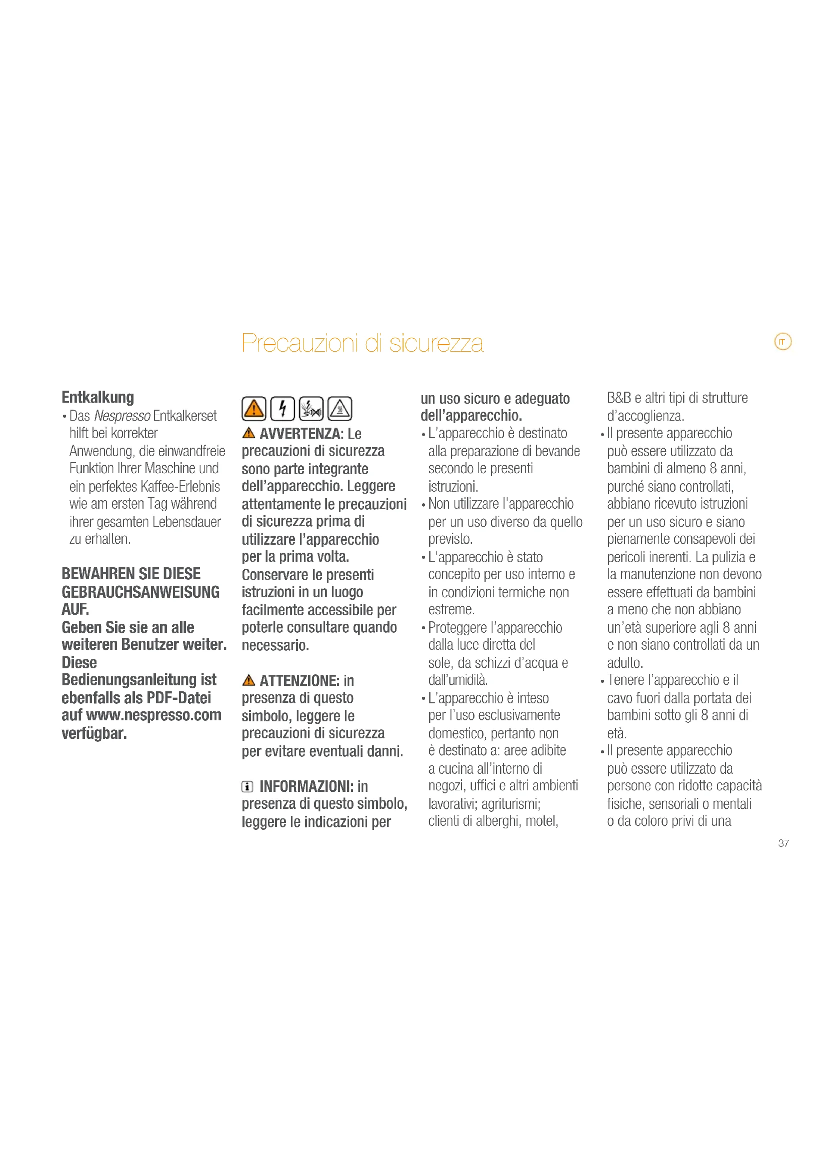 sulla propria macchina dalla macchina stessa: - Ripristinare le impostazioni di fabbrica. Vedere il paragrafo "Ripristino delle impostazioni di fabbrica". I pulsanti caffè non si illuminano. - La macchina si spegne automaticamente. Vedere paragrafo "Risparmio energetico". - Controllare l’alimentazione: presa, tensione, fusibile. Niente caffè, niente acqua, erogazione del caffè anomala. - Controllare che il serbatoio dell’acqua sia nella giusta posizione; se è vuoto riempirlo con acqua potabile. - Se necessario, eseguire la decalcificazione. Il caffè non è abbastanza caldo. - Preriscaldare la tazzina. - Se necessario, eseguire la decalcificazione. La finestra scorrevole non si chiude completamente o l'erogazione non si avvia. - Svuotare il contenitore delle capsule. - Controllare che non vi siano capsule bloccate all’interno della macchina. (Nota: non inserire le dita all'interno della macchina). Perdite (acqua sotto la macchina). - Svuotare il vassoio raccogligocce se pieno. - Se il problema persiste, contattare il Nespresso Club. Spia della manutenzione accesa. - Svuotare il contenitore delle capsule e verificare che non vi siano capsule bloccate. - Controllare il serbatoio dell'acqua. Se vuoto, riempirlo con acqua potabile e preparare un caffè. - Se il problema persiste, contattare il Nespresso Club. Spia Nespresso accesa. - Significa che la disponiobilità di capsule è terminata. Può ordinare le capsule mediante l'App o sul sito Nespresso. I 3 pulsanti del caffè lampeggiano rapidamente. - Per uscire dalla modalità di decalcificazione, tenere premuti contemporaneamente i 3 pulsanti per 6 secondi fino al segnale sonoro di conferma. - Se il problema persiste, contattare il Nespresso Club, oppure controllare l'App per ulteriori informazioni. L'erogazione di acqua o di caffè non si interrompe anche premendo un qualunque pulsante del caffè. - Spostare delicatamente la finestra scorrevole verso la parte posteriore della macchina per interrompere l'erogazione. Il caffè non viene erogato, l'acqua va direttamente nel vassoio raccogligocce (anche se la capsula è inserita). - Verificare che la finestra scorrevole sia ben chiusa. - Se il problema persiste, contattare il Nespresso Club. La macchina si spegne. - Per risparmiare energia, la macchina si spegne automaticamente dopo 9 minuti di inutilizzo. - Vedere paragrafo "Risparmio energetico". - Premere uno dei pulsanti di erogazione del caffè per accenderla oppure aprire la finestra scorrevole.DE