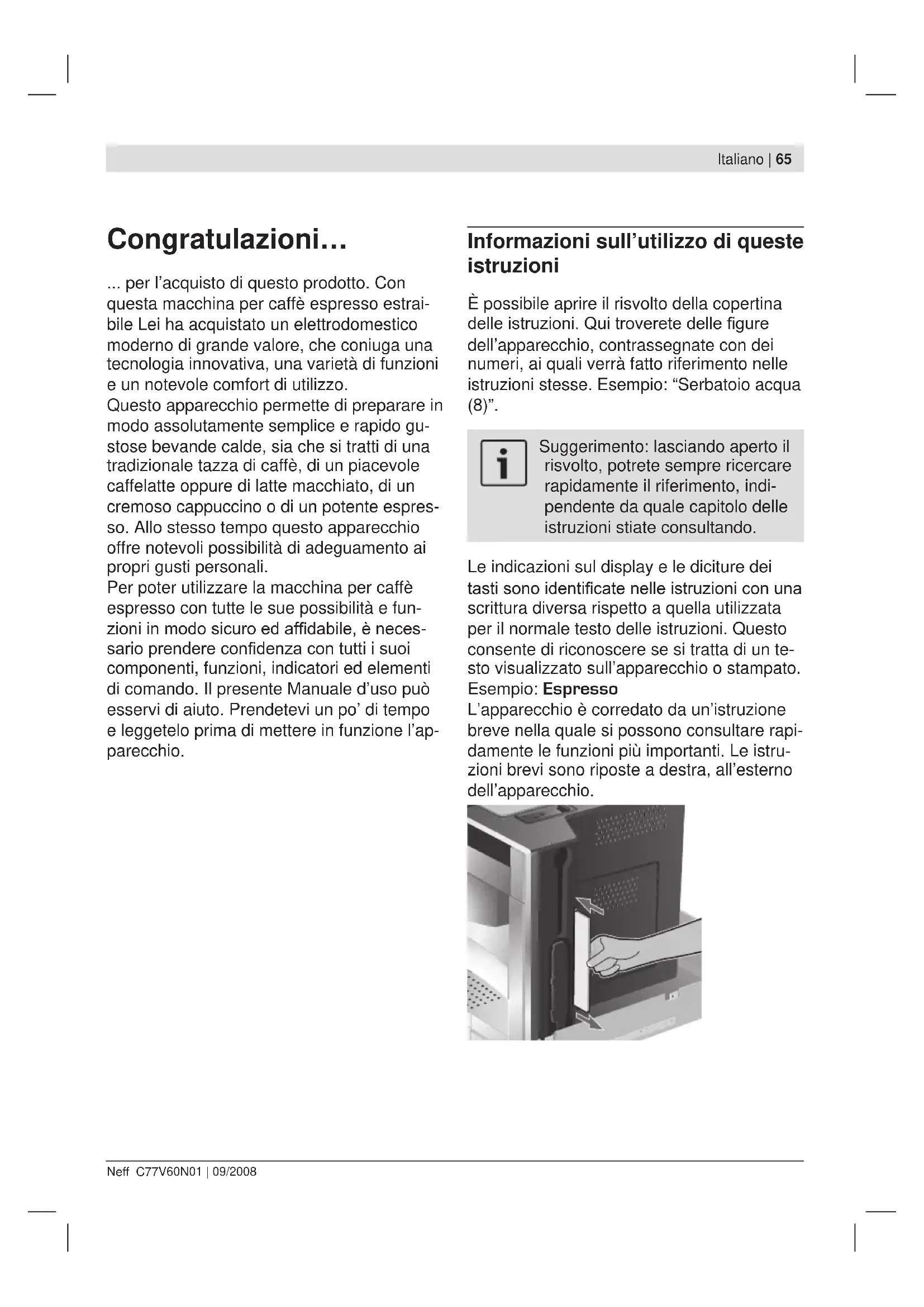 4.Italiano | 65 Neff C77V60N01 | 09/2008 Congratulazioni… ... per l’acquisto di questo prodotto. Con questa macchina per caffè espresso estrai- bile Lei ha acquistato un elettrodomestico moderno di grande valore, che coniuga una tecnologia innovativa, una varietà di funzioni e un notevole comfort di utilizzo. Questo apparecchio permette di preparare in modo assolutamente semplice e rapido gu- stose bevande calde, sia che si tratti di una tradizionale tazza di caffè, di un piacevole caffelatte oppure di latte macchiato, di un cremoso cappuccino o di un potente espres- so. Allo stesso tempo questo apparecchio offre notevoli possibilità di adeguamento ai propri gusti personali. Per poter utilizzare la macchina per caffè espresso con tutte le sue possibilità e fun- zioni in modo sicuro ed afdabile, è neces- sario prendere condenza con tutti i suoi componenti, funzioni, indicatori ed elementi di comando. Il presente Manuale d’uso può esservi di aiuto. Prendetevi un po’ di tempo e leggetelo prima di mettere in funzione l’ap- parecchio. Informazioni sull’utilizzo di queste istruzioni È possibile aprire il risvolto della copertina delle istruzioni. Qui troverete delle gure dell’apparecchio, contrassegnate con dei numeri, ai quali verrà fatto riferimento nelle istruzioni stesse. Esempio: “Serbatoio acqua (8)”. Suggerimento: lasciando aperto il risvolto, potrete sempre ricercare rapidamente il riferimento, indi- pendente da quale capitolo delle istruzioni stiate consultando. Le indicazioni sul display e le diciture dei tasti sono identicate nelle istruzioni con una scrittura diversa rispetto a quella utilizzata per il normale testo delle istruzioni. Questo consente di riconoscere se si tratta di un te- sto visualizzato sull’apparecchio o stampato. Esempio: Espresso L’apparecchio è corredato da un’istruzione breve nella quale si possono consultare rapi- damente le funzioni più importanti. Le istru- zioni brevi sono riposte a destra, all’esterno dell’apparecchio.66 | Italiano Neff C77V60N01 | 09/2008 Indice 67 Istruzioni di sicurezza 67 Struttura e componenti 68 Elementi di comando e indicatori 68 Interruttore di rete O/I 68 Menu e display 69 Sistema di estrazione 70 Accessori 70 Messaggi sul display 71 Messa in esercizio 71 Informazioni generali 71 Avviare l’apparecchio 72 Preparazione delle bevande 72 Selezione della bevanda 72 Un esempio 73 Preparazione con caffè in polvere 74 Preparazione con latte 75 Preparazione di due tazze contemporaneamente 75 My coffee 76 Preparazione della schiuma latte e del latte caldo 76 Prelievo di acqua calda 77 Informazioni ed impostazioni 77 Informazioni sul display 77 Impostazioni sul display 78 Regolazione del grado di macinatura 79 Determinare e impostare la durezza dell’acqua 79 Suggerimenti per risparmiare energia 79 Cura e pulizia giornaliera 79 Cura giornaliera 80 Pulizia del sistema latte 80 Pulire l’unità di infusione 81 Programmi di servizio 82 Decalcicare 83 Pulire 83 Calc‘n‘Clean 84 Accessori, deposito, smaltimento, garanzia 84 Accessori 85 Deposito 85 Smaltimento 85 Garanzia 85 Soluzione dei problemi più sempliciItaliano | 67 Neff C77V60N01 | 09/2008 Istruzioni di sicurezza Prima di utilizzare l’apparecchio, leggere attentamente il Manuale d’uso, attenetevi a quanto prescritto e conservatelo. Attener- si anche alle allegate Istruzioni brevi, che vengono riposte in uno speciale apposito scomparto a destra sul lato esterno dell’ap- parecchio. La macchina automatica per espresso è de- stinata all’utilizzo domestico e per preparare quantità normali nell’utilizzo quotidiano e non è pensata per l’utilizzo commerciale. Nel- l’apparecchio si possono inserire solo acqua pulita e le sostanze descritte nelle presenti istruzioni (caffè liquido detergente/decalci- cante). Utilizzare l’apparecchio solo in ambienti interni ed a temperatura ambiente. Non la- sciare che l’apparecchio venga utilizzato da bambini o da persone con ridotte capacità di percezione sica o ridotte facoltà psichiche oppure che non dispongano della necessaria esperienza o conoscenze, a meno che non siano sorvegliate o abbiano ricevuto un’istru- zione sull’uso dell’apparecchio da parte di una persona responsabile della loro sicurez- za. Tenere l’apparecchio fuori dalla portata dei bambini. Sorvegliare i bambini, per evita- re che giochino con l’apparecchio. Pericolo di scossa elettrica! Collegare e utilizzare l’apparecchio solo in confor- mità con i dati indicati sulla targhetta identicativa. Usare l’apparecchio solo se il cavo di alimentazione e l’apparecchio stesso non presentano danni. In caso di guasto staccare im- mediatamente l’apparecchio dalla rete mediante l’apposito interruttore. Quindi staccare la spina. Non aprire né smon- tare l’apparecchio. Non immergere mai il cavo di alimentazione in acqua. Per evitare danni, eventuali riparazio- ni dell’apparecchio, quali ad esempio una linea di alimentazione danneggiata, possono essere eseguite solo dal nostro servizio di assistenza clienti. Pericolo di lesione! Non inserire le dita nel macina- caffè. Pericolo di ustione! L’innesto schiuma per latte/acqua calda si riscalda molto. Dopo l’utilizzo, prima di toccare l’apparecchio, lasciarlo raffreddare. Pericolo di lesioni! Estrarre e inserire l’apparecchio dal mobile di incasso usando la dovuta cautela per evitare che le dita restino incastrate. Struttura e componenti (Ved. illustrazione sul risvolto interno della copertina delle presenti istruzioni) 1 Tasto i (Informazioni/Impostazioni) 2 Selettore (verso l‘alto)(verso l‘alto) 3 Display 4 Pulsante basculante a scomparsa 5 Selettore (verso il basso) 6 Tasto Start/Stop 7 Interruttore di rete O/I 8 Serbatoio acqua estraibile 9 Serbatoio dei chicchi di caffè con coper- chio salvaroma 10 Cassetto per caffè in polvere (caffè maci- nato/compressa di detergente) 11 Selettore per il grado di macinatura 12 Flessibile del latte 13 Dosatore 