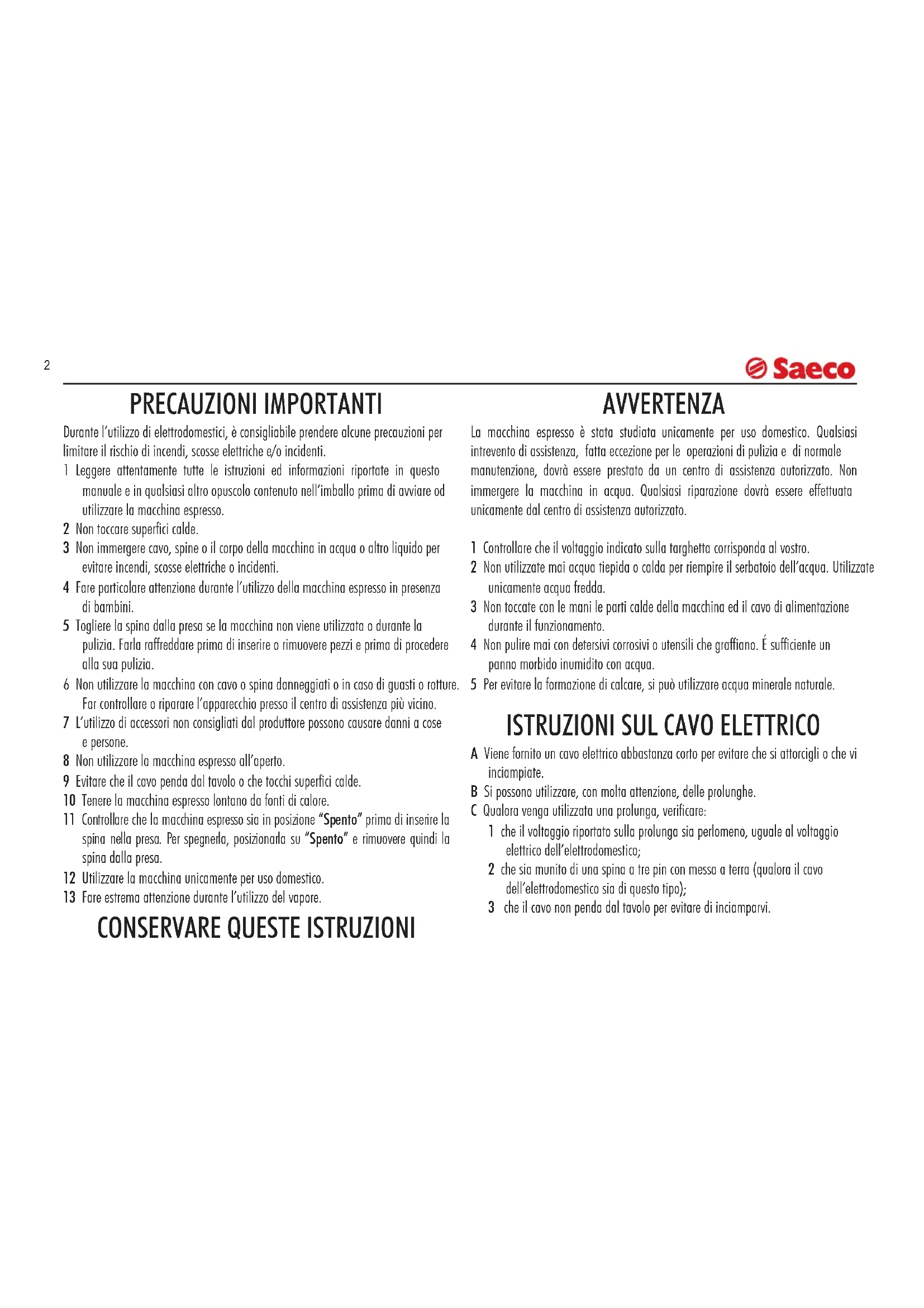 Afgifte te weinig of afwezig. Maling te fi jn en SBS-knop naar rechts gedraaid. Zorg voor een grovere instelling van de maling (draai de knop tegen de wijzers van de klok in). Draai de SBS-knop naar links. NEDERLAND 141OPMERKING 142OPMERKING 143PRECAUZIONI IMPORTANTI Durante l’utilizzo di elettrodomestici, è consigliabile prendere alcune precauzioni per limitare il rischio di incendi, scosse elettriche e/o incidenti. 1 Leggere attentamente tutte le istruzioni ed informazioni riportate in questo manuale e in qualsiasi altro opuscolo contenuto nell’imballo prima di avviare od utilizzare la macchina espresso. 2 Non toccare superfici calde. 3 Non immergere cavo, spine o il corpo della macchina in acqua o altro liquido per evitare incendi, scosse elettriche o incidenti. 4 Fare particolare attenzione durante l’utilizzo della macchina espresso in presenza di bambini. 5 Togliere la spina dalla presa se la macchina non viene utilizzata o durante la pulizia. Farla raffreddare prima di inserire o rimuovere pezzi e prima di procedere alla sua pulizia. 6 Non utilizzare la macchina con cavo o spina danneggiati o in caso di guasti o rotture. Far controllare o riparare l’apparecchio presso il centro di assistenza più vicino. 7 L’utilizzo di accessori non consigliati dal produttore possono causare danni a cose e persone. 8 Non utilizzare la macchina espresso all’aperto. 9 Evitare che il cavo penda dal tavolo o che tocchi superfici calde. 10 Tenere la macchina espresso lontano da fonti di calore. 11 Controllare che la macchina espresso sia in posizione “Spento” prima di inserire la spina nella presa. Per spegnerla, posizionarla su “Spento” e rimuovere quindi la spina dalla presa. 12 Utilizzare la macchina unicamente per uso domestico. 13 Fare estrema attenzione durante l’utilizzo del vapore.
