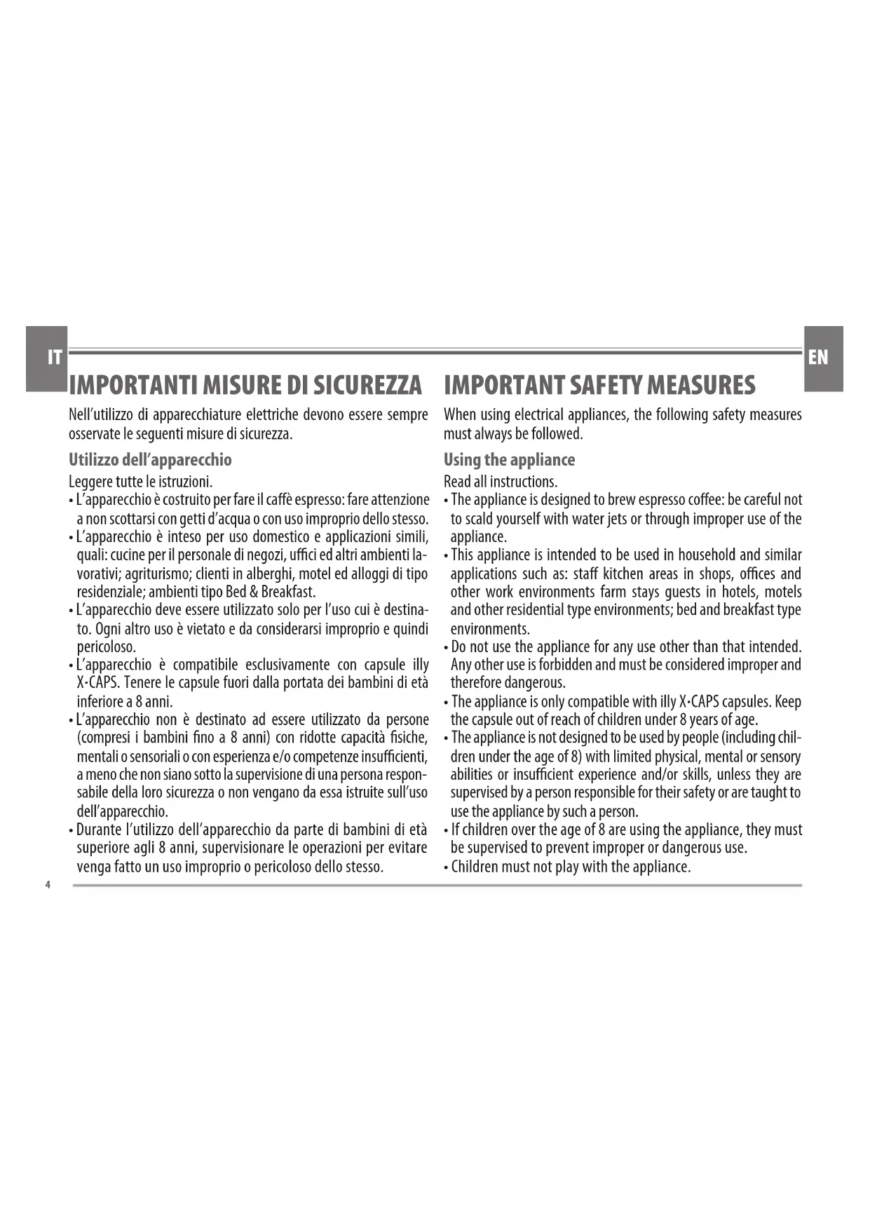 - L’apparecchio è compatibile esclusivamente con capsule illy X·CAPS. Tenere le capsule fuori dalla portata dei bambini di età inferiore a 8 anni.