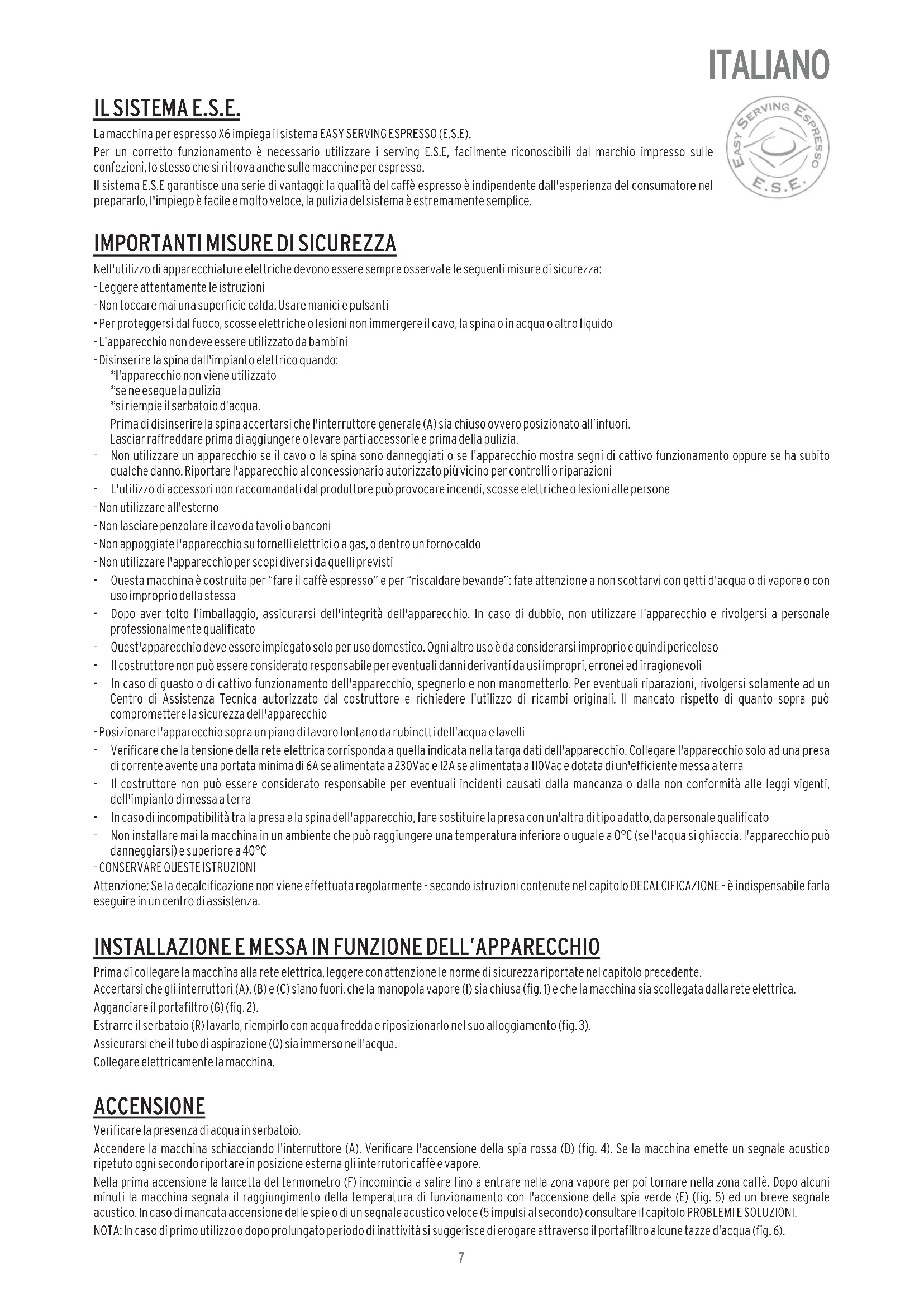 Attenzione: Se la decalcificazione non viene effettuata regolarmente - secondo istruzioni contenute nel capitolo DECALCIFICAZIONE - è indispensabile farla eseguire in un centro di assistenza. IL SISTEMA E.S.E. La macchina per espresso X6 impiega il sistema EASY SERVING ESPRESSO (E.S.E). Per un corretto funzionamento è necessario utilizzare i serving E.S.E, facilmente riconoscibili dal marchio impresso sulle confezioni, lo stesso che si ritrova anche sulle macchine per espresso. Il sistema E.S.E garantisce una serie di vantaggi: la qualità del caffè espresso è indipendente dall'esperienza del consumatore nel prepararlo, l'impiego è facile e molto veloce, la pulizia del sistema è estremamente semplice.