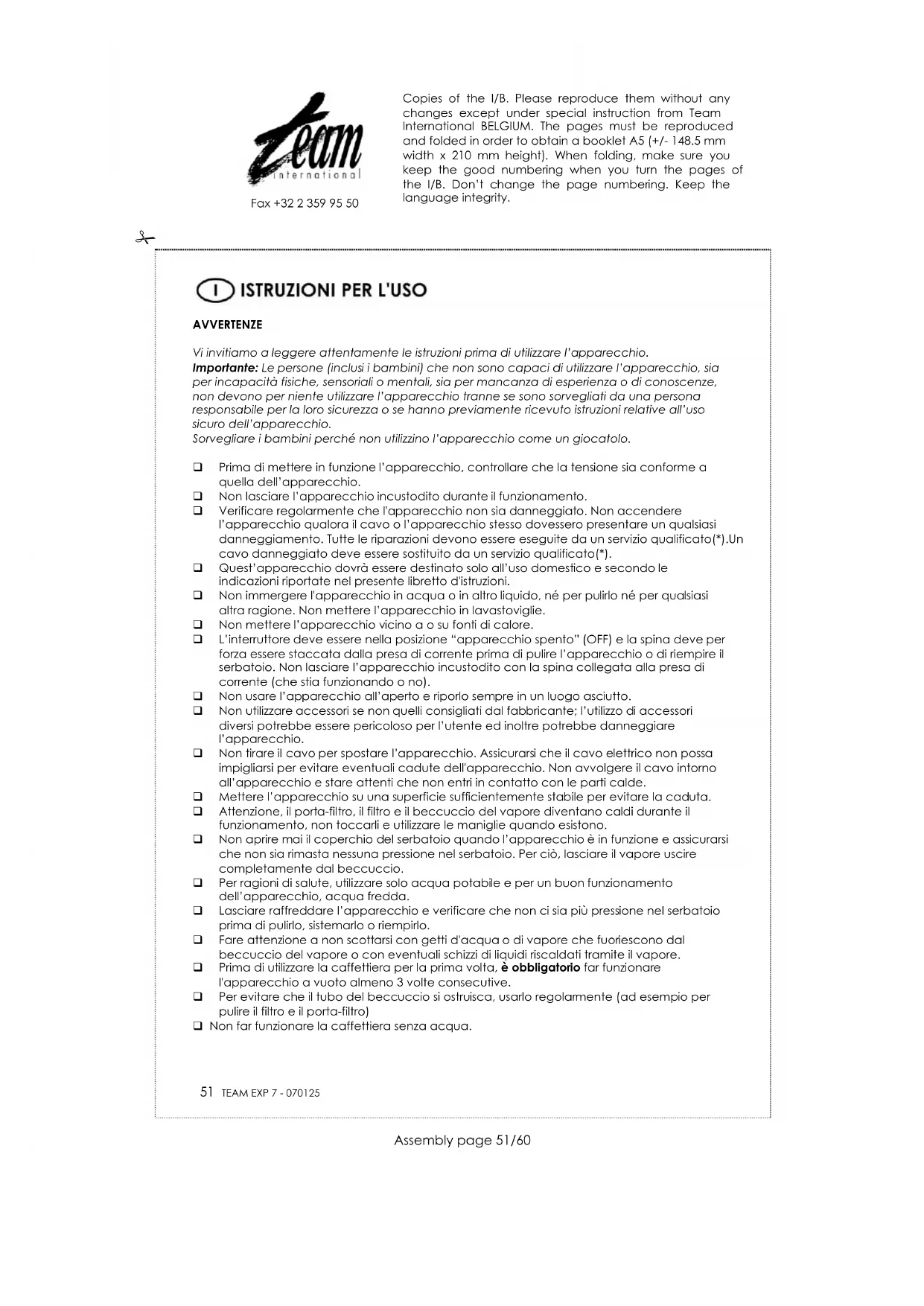 Scarica le istruzioni per il tuo Macchina da caffè in formato PDF gratuitamente! Trova il tuo manuale EXP 7 - TEAM e riprendi in mano il tuo dispositivo elettronico. In questa pagina sono pubblicati tutti i documenti necessari per l'utilizzo del tuo dispositivo. EXP 7 del marchio TEAM.