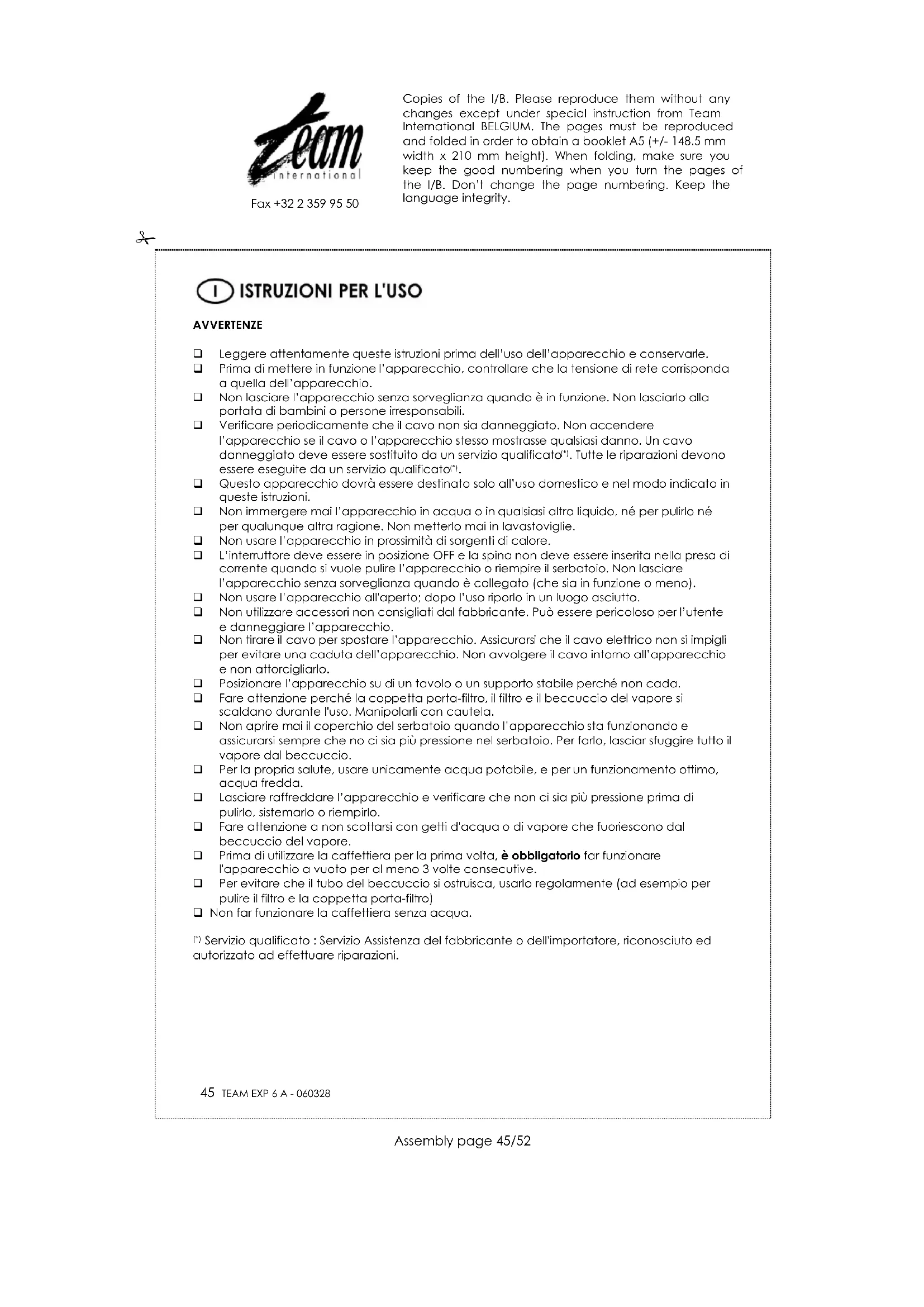 DIRETTIVA 2002/96/CE SULLO SMALTIMENTO DI APPARECCHI ELETTRICI ED ELETTRONICI Per preservare l'ambiente e la nostra salute, l'eliminazione dei vecchi apparecchi elettrici ed elettronici non più utilizzati, va fatta secondo la direttiva sopra citata che impone l'obbligo al costruttore, al commerciante e all’utilizzatore di consegnare gli apparecchi ai centri di raccolta specializzati, i quali saranno in grado di smaltire e riciclare i vecchi prodotti come la legge prescrive. Per questa ragione troverete apposto sull’etichetta segnaletica il simbolo che indica di non gettare il vecchio apparecchio non più utilizzato, in pattumiera o nel cassonetto delle immondizie. Per eliminare il vecchio apparecchio non più utilizzato, potete consegnarlo al rivenditore il cambio di quello nuovo acquistato, o direttamente nei centri di raccolta specializzati messi a disposizione dal vostro comune di residenza. Copies of the I/B. Please reproduce them without any changes except under special instruction from Team International BELGIUM. The pages must be reproduced and folded in order to obtain a booklet A5 (+/- 148.5 mm width x 210 mm height). When folding, make sure you keep the good numbering when you turn the pages of the I/B. Don’t change the page numbering. Keep the language integrity.