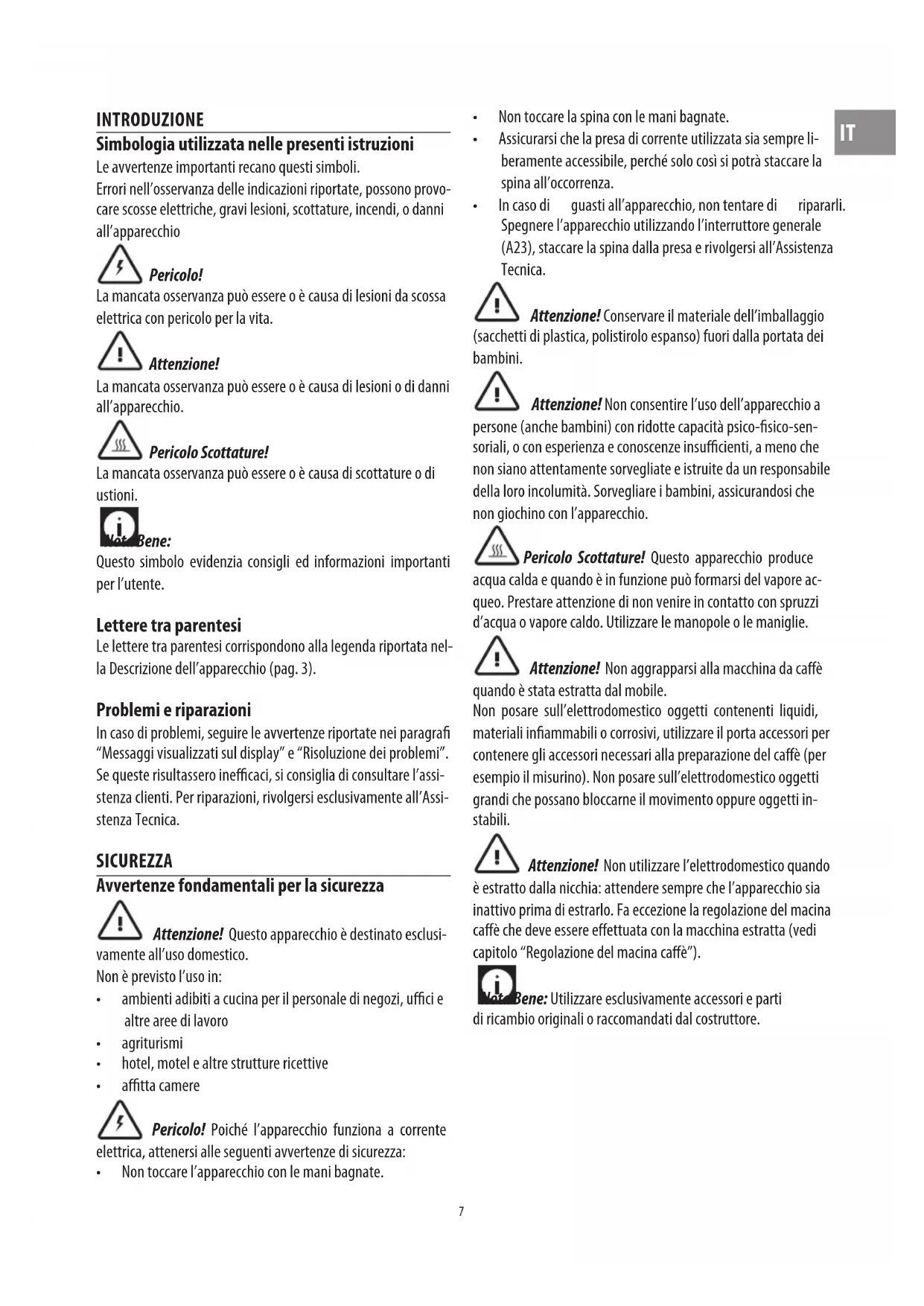 INTRODUZIONE Simbologia utilizzata nelle presenti istruzioni Le avvertenze importanti recano questi simboli. Errori nell’osservanza delle indicazioni riportate, possono provo- care scosse elettriche, gravi lesioni, scottature, incendi, o danni all’apparecchio Pericolo! La mancata osservanza può essere o è causa di lesioni da scossa elettrica con pericolo per la vita. Attenzione! La mancata osservanza può essere o è causa di lesioni o di danni all’apparecchio. Pericolo Scottature! La mancata osservanza può essere o è causa di scottature o di ustioni. Nota Bene: Questo simbolo evidenzia consigli ed informazioni importanti per l’utente. Lettere tra parentesi Le lettere tra parentesi corrispondono alla legenda riportata nel- la Descrizione dell’apparecchio (pag. 3). Problemi e riparazioni In caso di problemi, seguire le avvertenze riportate nei paragra “Messaggi visualizzati sul display” e “Risoluzione dei problemi”. Se queste risultassero inecaci, si consiglia di consultare l’assi- stenza clienti. Per riparazioni, rivolgersi esclusivamente all’Assi- stenza Tecnica. SICUREZZA Avvertenze fondamentali per la sicurezza Attenzione! Questo apparecchio è destinato esclusi- vamente all’uso domestico. Non è previsto l’uso in: