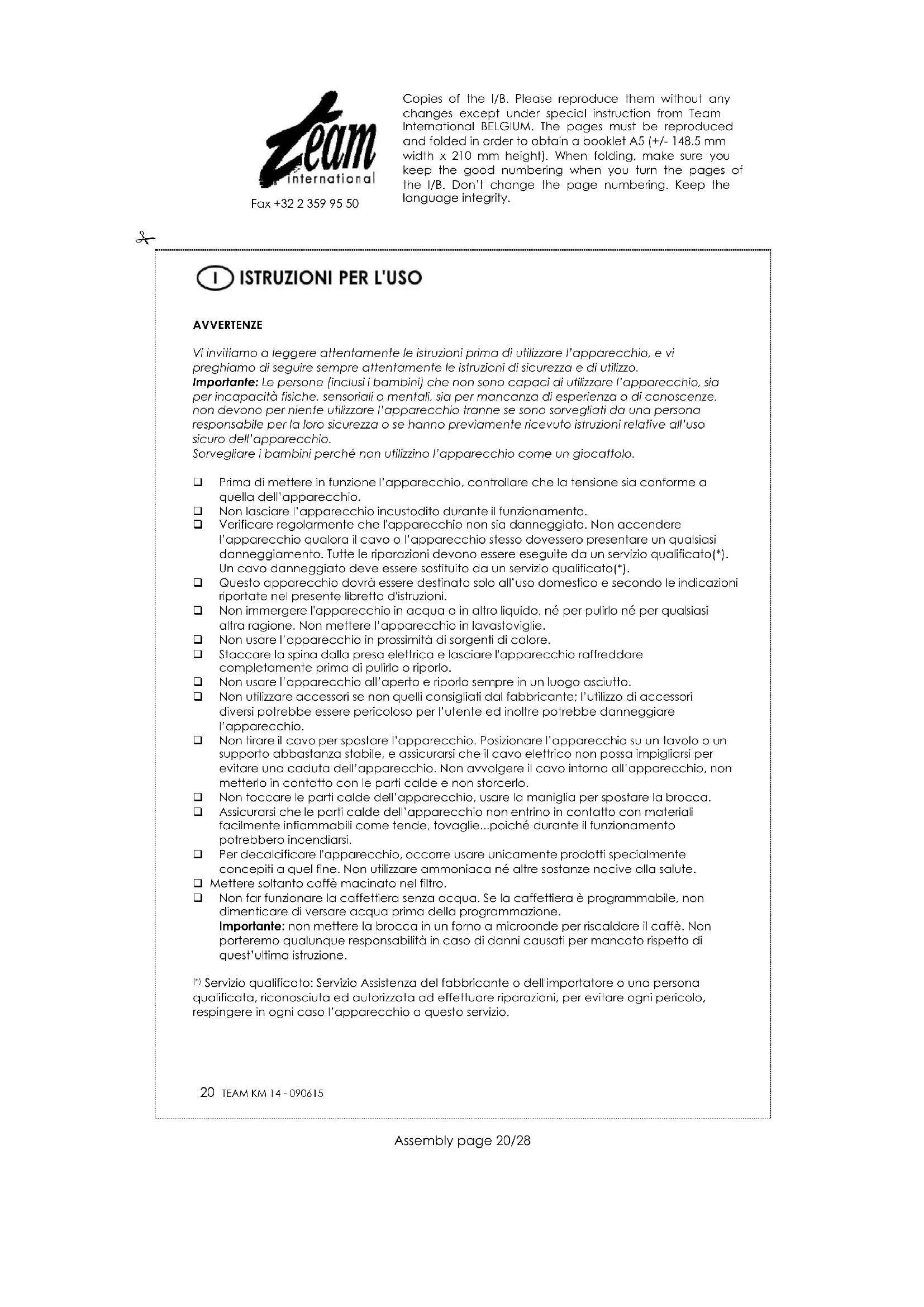 Scarica le istruzioni per il tuo Macchina da caffè in formato PDF gratuitamente! Trova il tuo manuale KM 14 - TEAM e riprendi in mano il tuo dispositivo elettronico. In questa pagina sono pubblicati tutti i documenti necessari per l'utilizzo del tuo dispositivo. KM 14 del marchio TEAM.