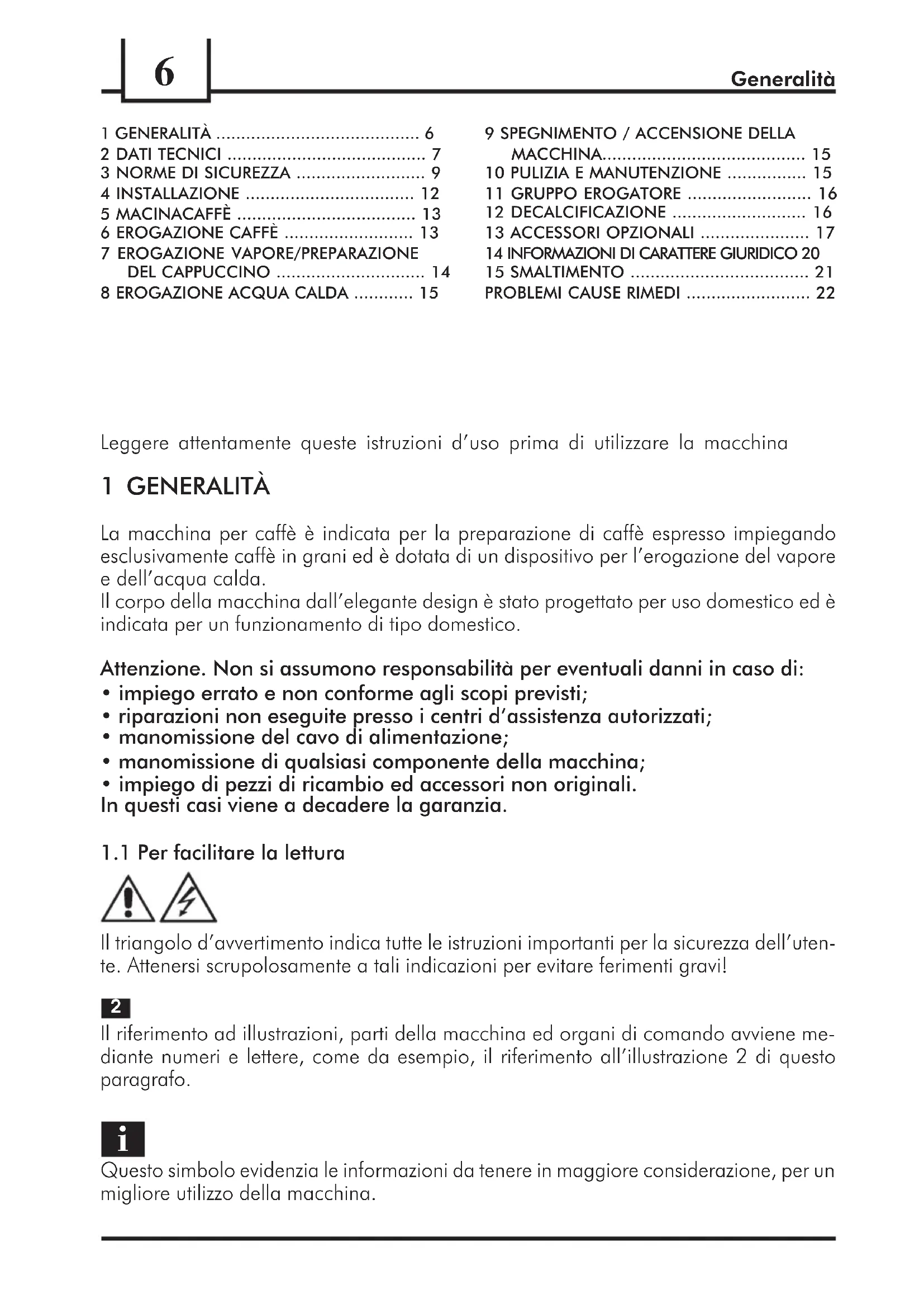 Leggere attentamente queste istruzioni duso prima di utilizzare la macchina 1 GENERALITÀ La macchina per caffè è indicata per la preparazione di caffè espresso impiegando esclusivamente caffè in grani ed è dotata di un dispositivo per lerogazione del vapore e dellacqua calda. Il corpo della macchina dallelegante design è stato progettato per uso domestico ed è indicata per un funzionamento di tipo domestico. Attenzione. Non si assumono responsabilità per eventuali danni in caso di: impiego errato e non conforme agli scopi previsti; riparazioni non eseguite presso i centri dassistenza autorizzati; manomissione del cavo di alimentazione; manomissione di qualsiasi componente della macchina; impiego di pezzi di ricambio ed accessori non originali. In questi casi viene a decadere la garanzia.