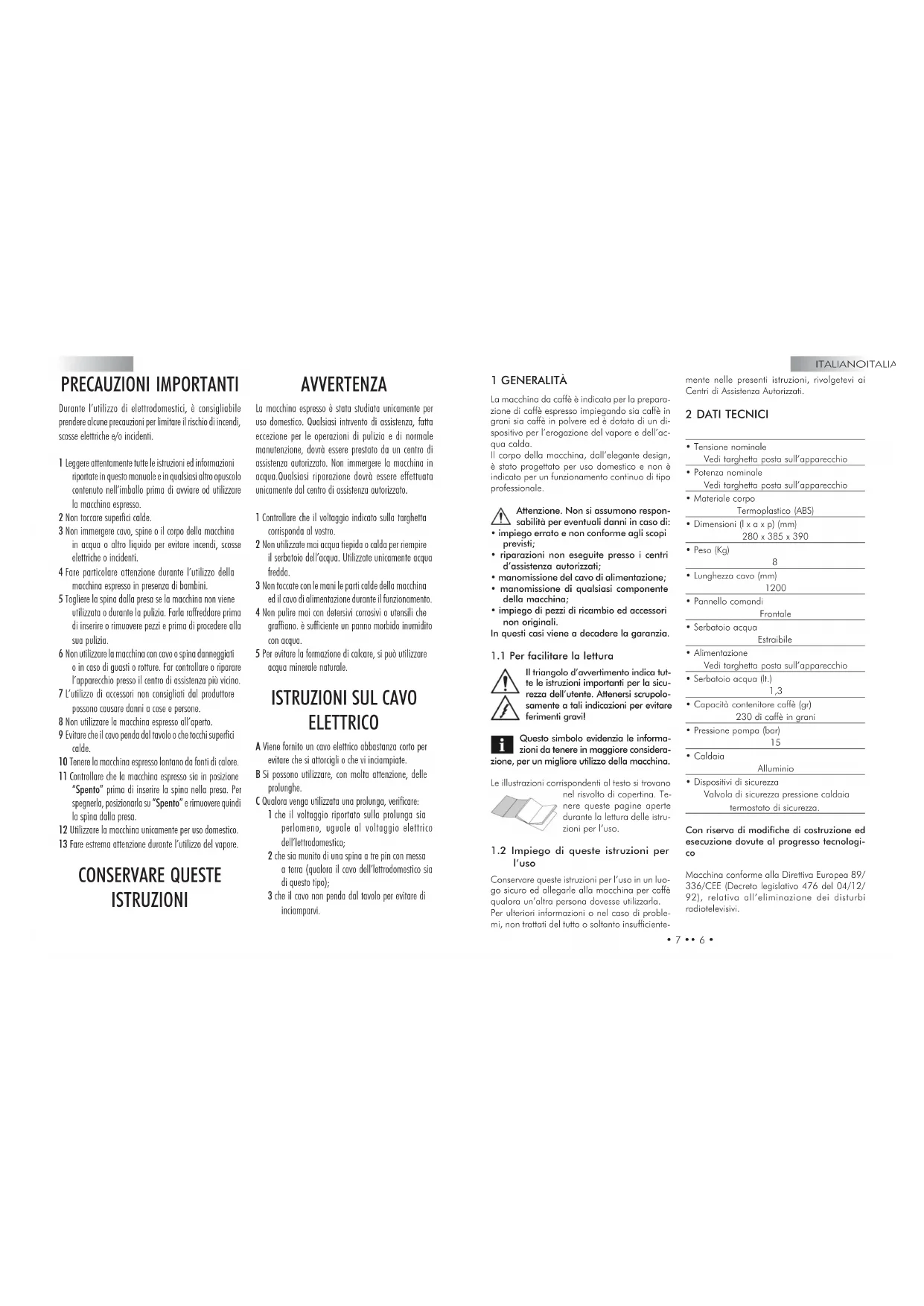 l’uso Conservare queste istruzioni per l’uso in un luo- go sicuro ed allegarle alla macchina per caffè qualora un’altra persona dovesse utilizzarla. Per ulteriori informazioni o nel caso di proble- mi, non trattati del tutto o soltanto insufficiente- PRECAUZIONI IMPORTANTI Durante l’utilizzo di elettrodomestici, è consigliabile prendere alcune precauzioni per limitare il rischio di incendi, scosse elettriche e/o incidenti. 1 Leggere attentamente tutte le istruzioni ed informazioni riportate in questo manuale e in qualsiasi altro opuscolo contenuto nell’imballo prima di avviare od utilizzare la macchina espresso. 2 Non toccare superfici calde. 3 Non immergere cavo, spine o il corpo della macchina in acqua o altro liquido per evitare incendi, scosse elettriche o incidenti. 4 Fare particolare attenzione durante l’utilizzo della macchina espresso in presenza di bambini. 5 Togliere la spina dalla presa se la macchina non viene utilizzata o durante la pulizia. Farla raffreddare prima di inserire o rimuovere pezzi e prima di procedere alla sua pulizia. 6 Non utilizzare la macchina con cavo o spina danneggiati o in caso di guasti o rotture. Far controllare o riparare l’apparecchio presso il centro di assistenza più vicino. 7 L’utilizzo di accessori non consigliati dal produttore possono causare danni a cose e persone. 8 Non utilizzare la macchina espresso all’aperto. 9 Evitare che il cavo penda dal tavolo o che tocchi superfici calde. 10 Tenere la macchina espresso lontano da fonti di calore. 11 Controllare che la macchina espresso sia in posizione “Spento” prima di inserire la spina nella presa. Per spegnerla, posizionarla su “Spento” e rimuovere quindi la spina dalla presa. 12 Utilizzare la macchina unicamente per uso domestico. 13 Fare estrema attenzione durante l’utilizzo del vapore. CONSERVARE QUESTE ISTRUZIONI AVVERTENZA La macchina espresso è stata studiata unicamente per uso domestico. Qualsiasi intrvento di assistenza, fatta eccezione per le operazioni di pulizia e di normale manutenzione, dovrà essere prestato da un centro di assistenza autorizzato. Non immergere la macchina in acqua.Qualsiasi riparazione dovrà essere effettuata unicamente dal centro di assistenza autorizzato. 1 Controllare che il voltaggio indicato sulla targhetta corrisponda al vostro. 2 Non utilizzate mai acqua tiepida o calda per riempire il serbatoio dell’acqua. Utilizzate unicamente acqua fredda. 3 Non toccate con le mani le parti calde della macchina ed il cavo di alimentazione durante il funzionamento. 4 Non pulire mai con detersivi corrosivi o utensili che graffiano. è sufficiente un panno morbido inumidito con acqua. 5 Per evitare la formazione di calcare, si può utilizzare acqua minerale naturale.