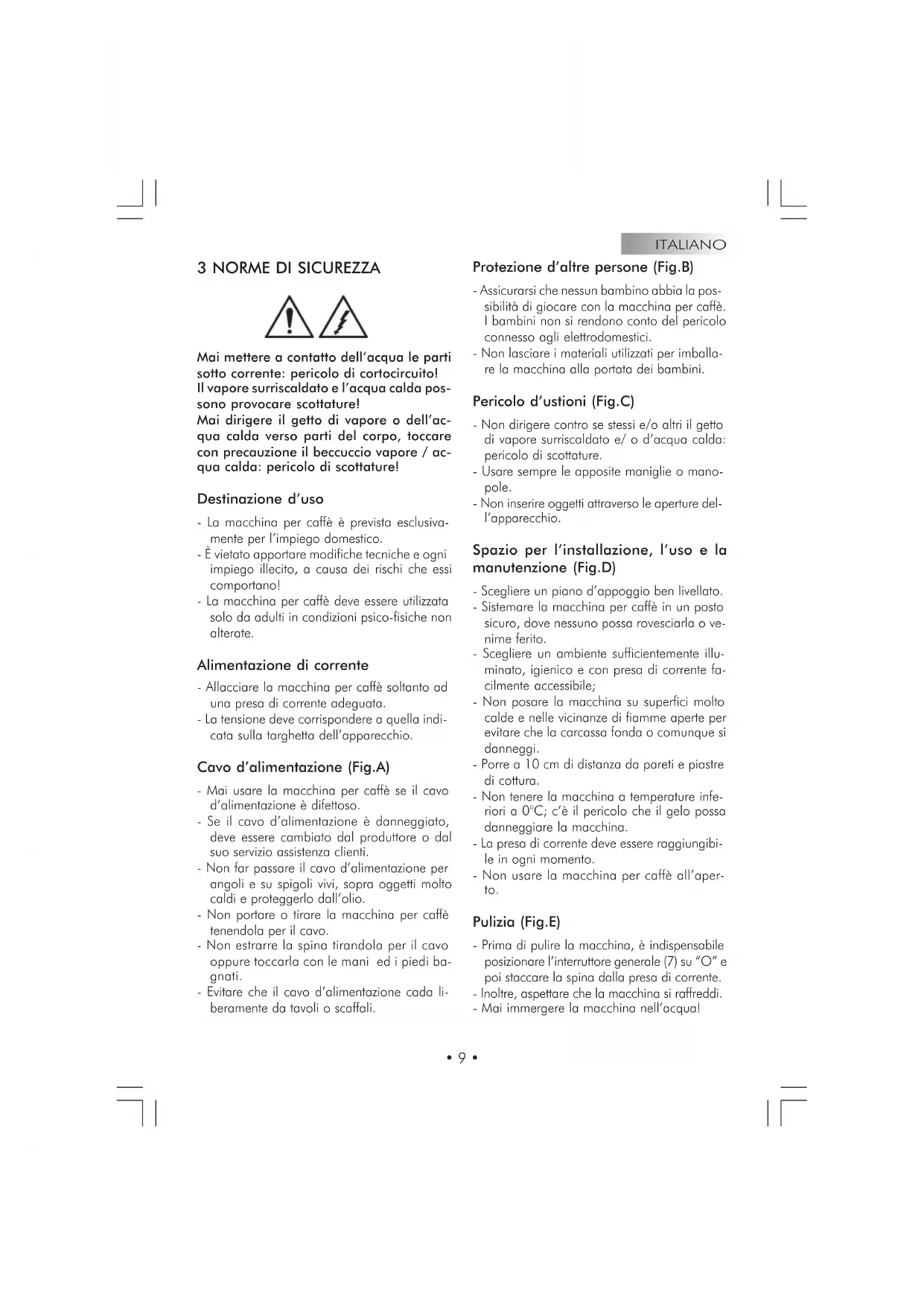 Mai mettere a contatto dell’acqua le parti sotto corrente: pericolo di cortocircuito! Il vapore surriscaldato e l’acqua calda pos- sono provocare scottature! Mai dirigere il getto di vapore o dell’ac- qua calda verso parti del corpo, toccare con precauzione il beccuccio vapore / ac- qua calda: pericolo di scottature! Destinazione d’uso - La macchina per caffè è prevista esclusiva- mente per l’impiego domestico. - È vietato apportare modifiche tecniche e ogni impiego illecito, a causa dei rischi che essi comportano! - La macchina per caffè deve essere utilizzata solo da adulti in condizioni psico-fisiche non alterate. Alimentazione di corrente - Allacciare la macchina per caffè soltanto ad una presa di corrente adeguata. - La tensione deve corrispondere a quella indi- cata sulla targhetta dell’apparecchio. Cavo d’alimentazione (Fig.A) - Mai usare la macchina per caffè se il cavo d’alimentazione è difettoso. - Se il cavo d’alimentazione è danneggiato, deve essere cambiato dal produttore o dal suo servizio assistenza clienti. - Non far passare il cavo d’alimentazione per angoli e su spigoli vivi, sopra oggetti molto caldi e proteggerlo dall’olio. - Non portare o tirare la macchina per caffè tenendola per il cavo. - Non estrarre la spina tirandola per il cavo oppure toccarla con le mani ed i piedi ba- gnati. - Evitare che il cavo d’alimentazione cada li- beramente da tavoli o scaffali. Protezione d’altre persone (Fig.B) - Assicurarsi che nessun bambino abbia la pos- sibilità di giocare con la macchina per caffè. I bambini non si rendono conto del pericolo connesso agli elettrodomestici. - Non lasciare i materiali utilizzati per imballa- re la macchina alla portata dei bambini. Pericolo d’ustioni (Fig.C) - Non dirigere contro se stessi e/o altri il getto di vapore surriscaldato e/ o d’acqua calda: pericolo di scottature. - Usare sempre le apposite maniglie o mano- pole. - Non inserire oggetti attraverso le aperture del- l’apparecchio. Spazio per l’installazione, l’uso e la manutenzione (Fig.D) - Scegliere un piano d’appoggio ben livellato. - Sistemare la macchina per caffè in un posto sicuro, dove nessuno possa rovesciarla o ve- nirne ferito. - Scegliere un ambiente sufficientemente illu- minato, igienico e con presa di corrente fa- cilmente accessibile; - Non posare la macchina su superfici molto calde e nelle vicinanze di fiamme aperte per evitare che la carcassa fonda o comunque si danneggi. - Porre a 10 cm di distanza da pareti e piastre di cottura. - Non tenere la macchina a temperature infe- riori a 0°C; c’è il pericolo che il gelo possa danneggiare la macchina. - La presa di corrente deve essere raggiungibi- le in ogni momento. - Non usare la macchina per caffè all’aper- to. Pulizia (Fig.E) - Prima di pulire la macchina, è indispensabile posizionare l’interruttore generale (7) su “O” e poi staccare la spina dalla presa di corrente. - Inoltre, aspettare che la macchina si raffreddi. - Mai immergere la macchina nell’acqua!ITALIANO