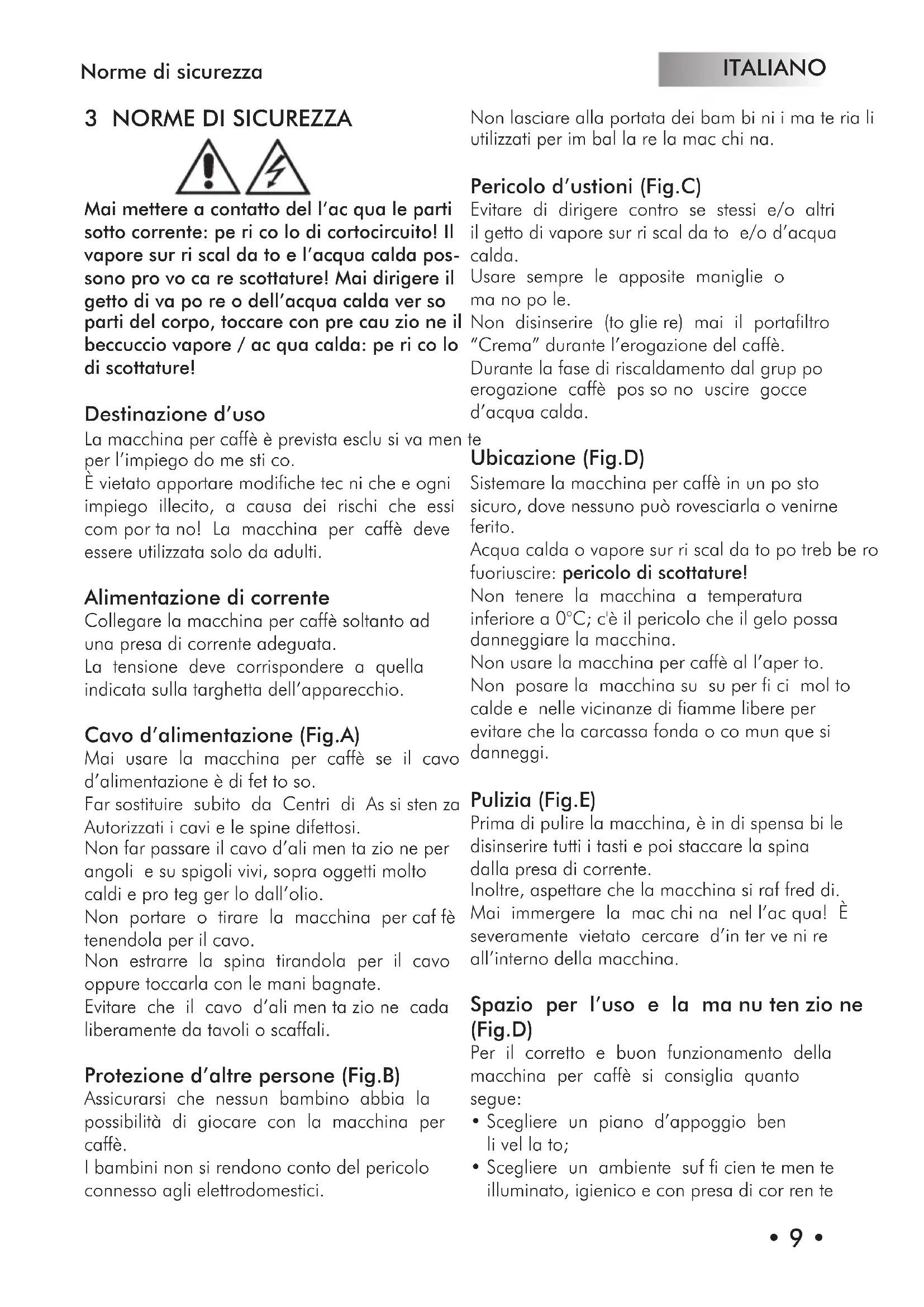 Mai mettere a contatto del l’ac qua le parti sotto corrente: pe ri co lo di cortocircuito! Il vapore sur ri scal da to e l’acqua calda pos- sono pro vo ca re scottature! Mai dirigere il getto di va po re o dell’acqua calda ver so parti del corpo, toccare con pre cau zio ne il beccuccio vapore / ac qua calda: pe ri co lo di scottature! Destinazione d’uso La macchina per caffè è prevista esclu si va men te per l’impiego do me sti co. È vietato apportare modifiche tec ni che e ogni impiego illecito, a causa dei rischi che essi com por ta no! La macchina per caffè deve essere utilizzata solo da adulti. Alimentazione di corrente Collegare la macchina per caffè soltanto ad una presa di corrente adeguata. La tensione deve corrispondere a quella indicata sulla targhetta dell’apparecchio. Cavo d’alimentazione (Fig.A) Mai usare la macchina per caffè se il cavo d’alimentazione è di fet to so. Far sostituire subito da Centri di As si sten za Autorizzati i cavi e le spine difettosi. Non far passare il cavo d’ali men ta zio ne per angoli e su spigoli vivi, sopra oggetti molto caldi e pro teg ger lo dall’olio. Non portare o tirare la macchina per caf fè tenendola per il cavo. Non estrarre la spina tirandola per il cavo oppure toccarla con le mani bagnate. Evitare che il cavo d’ali men ta zio ne cada liberamente da tavoli o scaffali. Protezione d’altre persone (Fig.B) Assicurarsi che nessun bambino abbia la possibilità di giocare con la macchina per caffè. I bambini non si rendono conto del pericolo connesso agli elettrodomestici. Non lasciare alla portata dei bam bi ni i ma te ria li utilizzati per im bal la re la mac chi na. Pericolo d’ustioni (Fig.C) Evitare di dirigere contro se stessi e/o altri il getto di vapore sur ri scal da to e/o d’acqua calda. Usare sempre le apposite maniglie o ma no po le. Non disinserire (to glie re) mai il portafiltro “Crema” durante l’erogazione del caffè. Durante la fase di riscaldamento dal grup po erogazione caffè pos so no uscire gocce d’acqua calda. Ubicazione (Fig.D) Sistemare la macchina per caffè in un po sto sicuro, dove nessuno può rovesciarla o venirne ferito. Acqua calda o vapore sur ri scal da to po treb be ro fuoriuscire: pericolo di scottature! Non tenere la macchina a temperatura inferiore a 0°C; c'è il pericolo che il gelo possa danneggiare la macchina. Non usare la macchina per caffè al l’aper to. Non posare la macchina su su per fi ci mol to calde e nelle vicinanze di fiamme libere per evitare che la carcassa fonda o co mun que si danneggi. Pulizia (Fig.E) Prima di pulire la macchina, è in di spensa bi le disinserire tutti i tasti e poi staccare la spina dalla presa di corrente. Inoltre, aspettare che la macchina si raf fred di. Mai immergere la mac chi na nel l’ac qua! È severamente vietato cercare d’in ter ve ni re all’interno della macchina. Spazio per l’uso e la ma nu ten zio ne (Fig.D) Per il corretto e buon funzionamento della macchina per caffè si consiglia quanto segue: