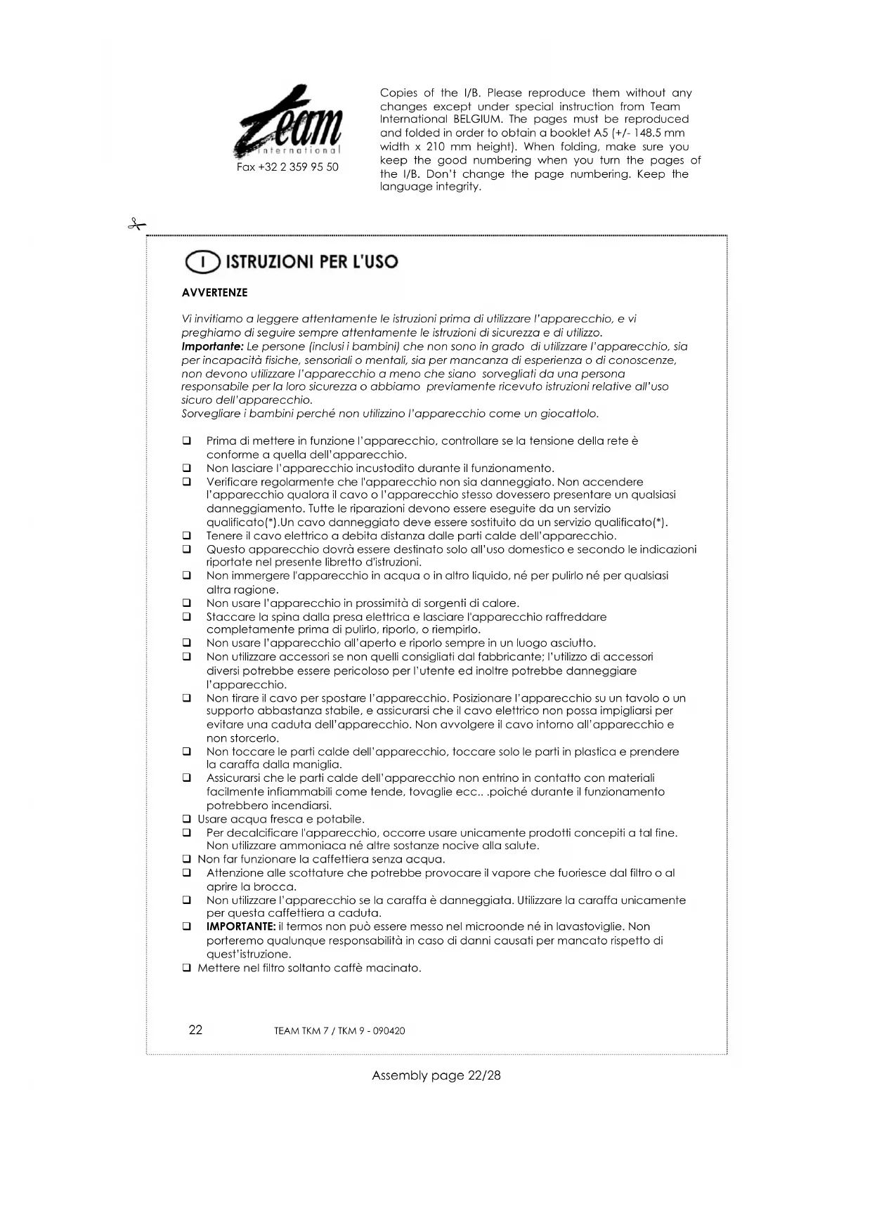 AVVERTENZE Vi invitiamo a leggere attentamente le istruzioni prima di utilizzare l’apparecchio, e vi preghiamo di seguire sempre attentamente le istruzioni di sicurezza e di utilizzo. Importante: Le persone (inclusi i bambini) che non sono in grado di utilizzare l’apparecchio, sia per incapacità fisiche, sensoriali o mentali, sia per mancanza di esperienza o di conoscenze, non devono utilizzare l’apparecchio a meno che siano sorvegliati da una persona responsabile per la loro sicurezza o abbiamo previamente ricevuto istruzioni relative all’uso sicuro dell’apparecchio. Sorvegliare i bambini perché non utilizzino l’apparecchio come un giocattolo. Prima di mettere in funzione l’apparecchio, controllare se la tensione della rete è conforme a quella dell’apparecchio. Non lasciare l’apparecchio incustodito durante il funzionamento. Verificare regolarmente che l'apparecchio non sia danneggiato. Non accendere l’apparecchio qualora il cavo o l’apparecchio stesso dovessero presentare un qualsiasi danneggiamento. Tutte le riparazioni devono essere eseguite da un servizio qualificato(*).Un cavo danneggiato deve essere sostituito da un servizio qualificato(*). Tenere il cavo elettrico a debita distanza dalle parti calde dell’apparecchio. Questo apparecchio dovrà essere destinato solo all’uso domestico e secondo le indicazioni riportate nel presente libretto d'istruzioni. Non immergere l'apparecchio in acqua o in altro liquido, né per pulirlo né per qualsiasi altra ragione. Non usare l’apparecchio in prossimità di sorgenti di calore. Staccare la spina dalla presa elettrica e lasciare l'apparecchio raffreddare completamente prima di pulirlo, riporlo, o riempirlo. Non usare l’apparecchio all’aperto e riporlo sempre in un luogo asciutto. Non utilizzare accessori se non quelli consigliati dal fabbricante; l’utilizzo di accessori diversi potrebbe essere pericoloso per l’utente ed inoltre potrebbe danneggiare l’apparecchio. Non tirare il cavo per spostare l’apparecchio. Posizionare l’apparecchio su un tavolo o un supporto abbastanza stabile, e assicurarsi che il cavo elettrico non possa impigliarsi per evitare una caduta dell’apparecchio. Non avvolgere il cavo intorno all’apparecchio e non storcerlo. Non toccare le parti calde dell’apparecchio, toccare solo le parti in plastica e prendere la caraffa dalla maniglia. Assicurarsi che le parti calde dell’apparecchio non entrino in contatto con materiali facilmente infiammabili come tende, tovaglie ecc.. .poiché durante il funzionamento potrebbero incendiarsi. Usare acqua fresca e potabile. Per decalcificare l'apparecchio, occorre usare unicamente prodotti concepiti a tal fine. Non utilizzare ammoniaca né altre sostanze nocive alla salute. Non far funzionare la caffettiera senza acqua. Attenzione alle scottature che potrebbe provocare il vapore che fuoriesce dal filtro o al aprire la brocca. Non utilizzare l’apparecchio se la caraffa è danneggiata. Utilizzare la caraffa unicamente per questa caffettiera a caduta. IMPORTANTE: il termos non può essere messo nel microonde né in lavastoviglie. Non porteremo qualunque responsabilità in caso di danni causati per mancato rispetto di quest’istruzione. Mettere nel filtro soltanto caffè macinato. Copies of the I/B. Please reproduce them without any changes except under special instruction from Team International BELGIUM. The pages must be reproduced and folded in order to obtain a booklet A5 (+/- 148.5 mm width x 210 mm height). When folding, make sure you keep the good numbering when you turn the pages of the I/B. Don’t change the page numbering. Keep the language integrity.