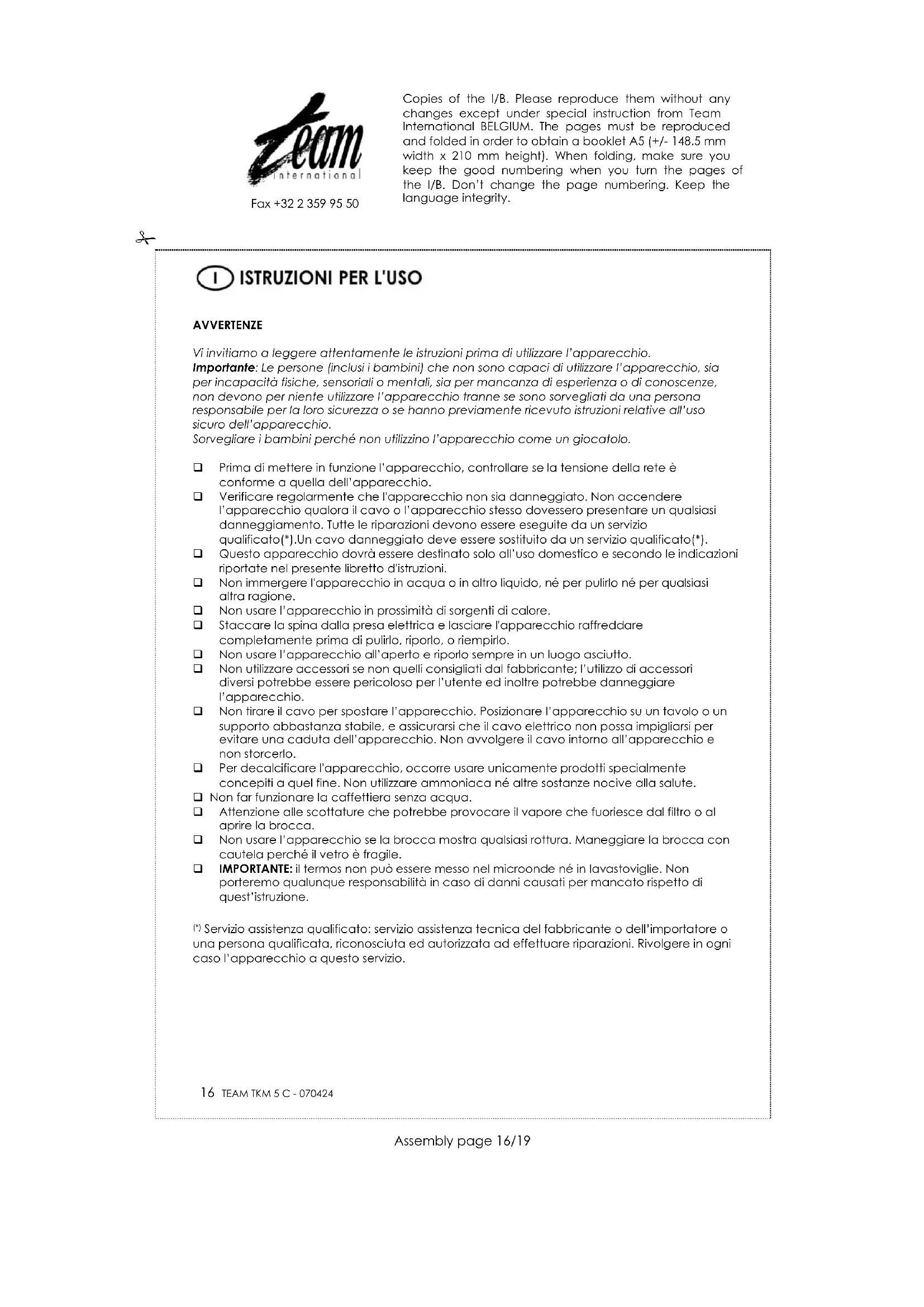 Scarica le istruzioni per il tuo Macchina da caffè in formato PDF gratuitamente! Trova il tuo manuale TKM 5 C - TEAM e riprendi in mano il tuo dispositivo elettronico. In questa pagina sono pubblicati tutti i documenti necessari per l'utilizzo del tuo dispositivo. TKM 5 C del marchio TEAM.