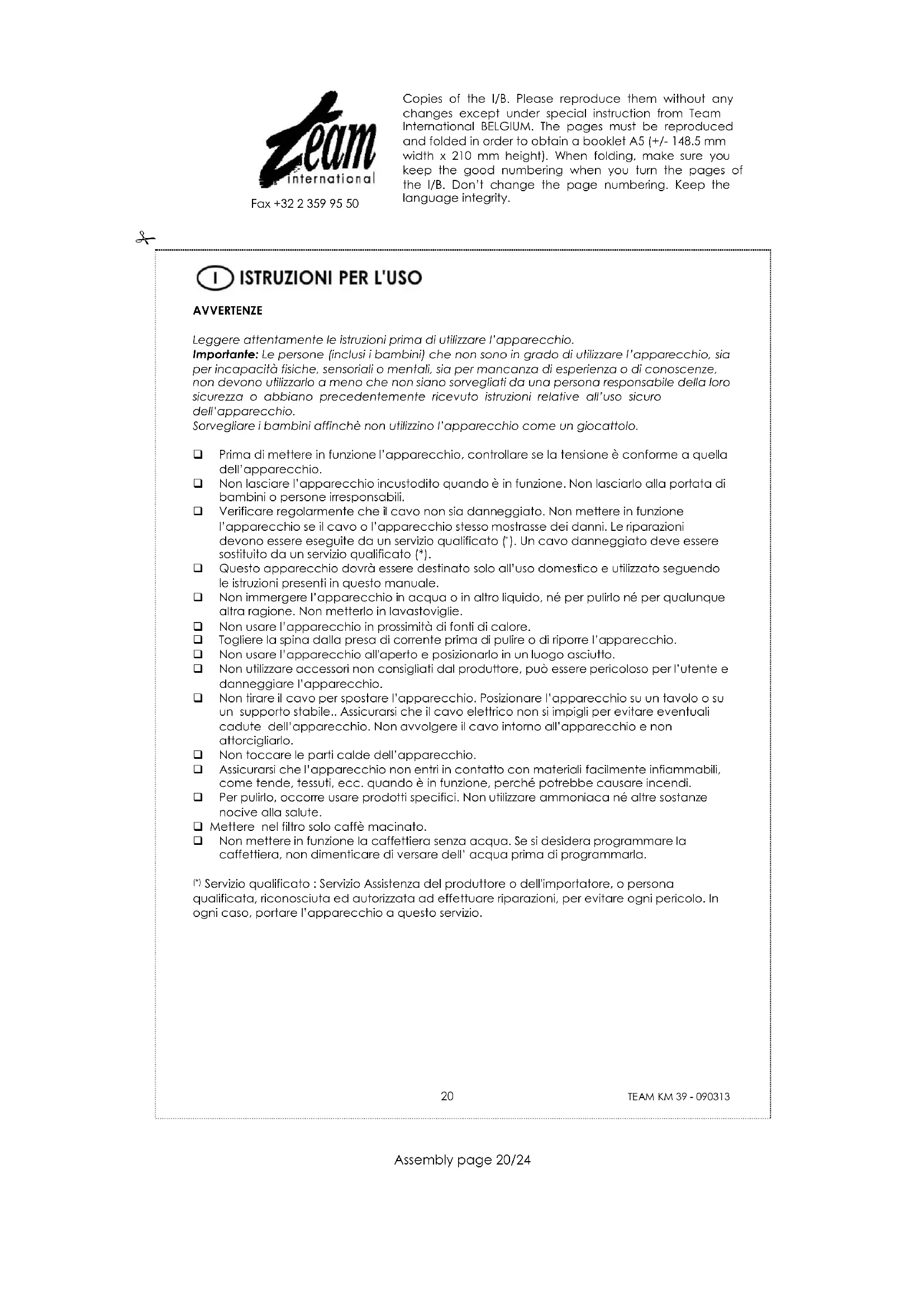 Fax +32 2 359 95 50 sotto controllo. Una costante manutenzione del prodotto ne prolungherà la durata. La garanzia non avrà valore per la sostituzione di un elemento riscaldante pieno di calcare. DIRETTIVA 2002/96/CE PER LO SMALTIMENTO DELLE APPARECCHIATURE ELETTRICHE ED ELETTRONICHE Per preservare l'ambiente e la nostra salute, i vecchi apparecchi elettrici e elettronici non più utilizzati devono essere smaltiti secondo la direttiva sopra citata che impone l'obbligo al produttore, al commerciante e all'utilizzatore di consegnare gli apparecchi ai centri di raccolta specializzati, i quali saranno in grado di smaltire e riciclare i vecchi prodotti come la legge prescrive. Per questa ragione troverete apposto sulla targhetta identificativa o sull'imballaggio il simbolo che indica di non gettare il vecchio apparecchio in pattumiera o nel cassonetto delle immondizie. Per eliminare il vecchio apparecchio, potete consegnarlo al rivenditore il cambio di quello nuovo, o direttamente nei centri di raccolta specializzati messi a disposizione dal vostro comune di residenza. Copies of the I/B. Please reproduce them without any changes except under special instruction from Team International BELGIUM. The pages must be reproduced and folded in order to obtain a booklet A5 (+/- 148.5 mm width x 210 mm height). When folding, make sure you keep the good numbering when you turn the pages of the I/B. Don’t change the page numbering. Keep the language integrity.