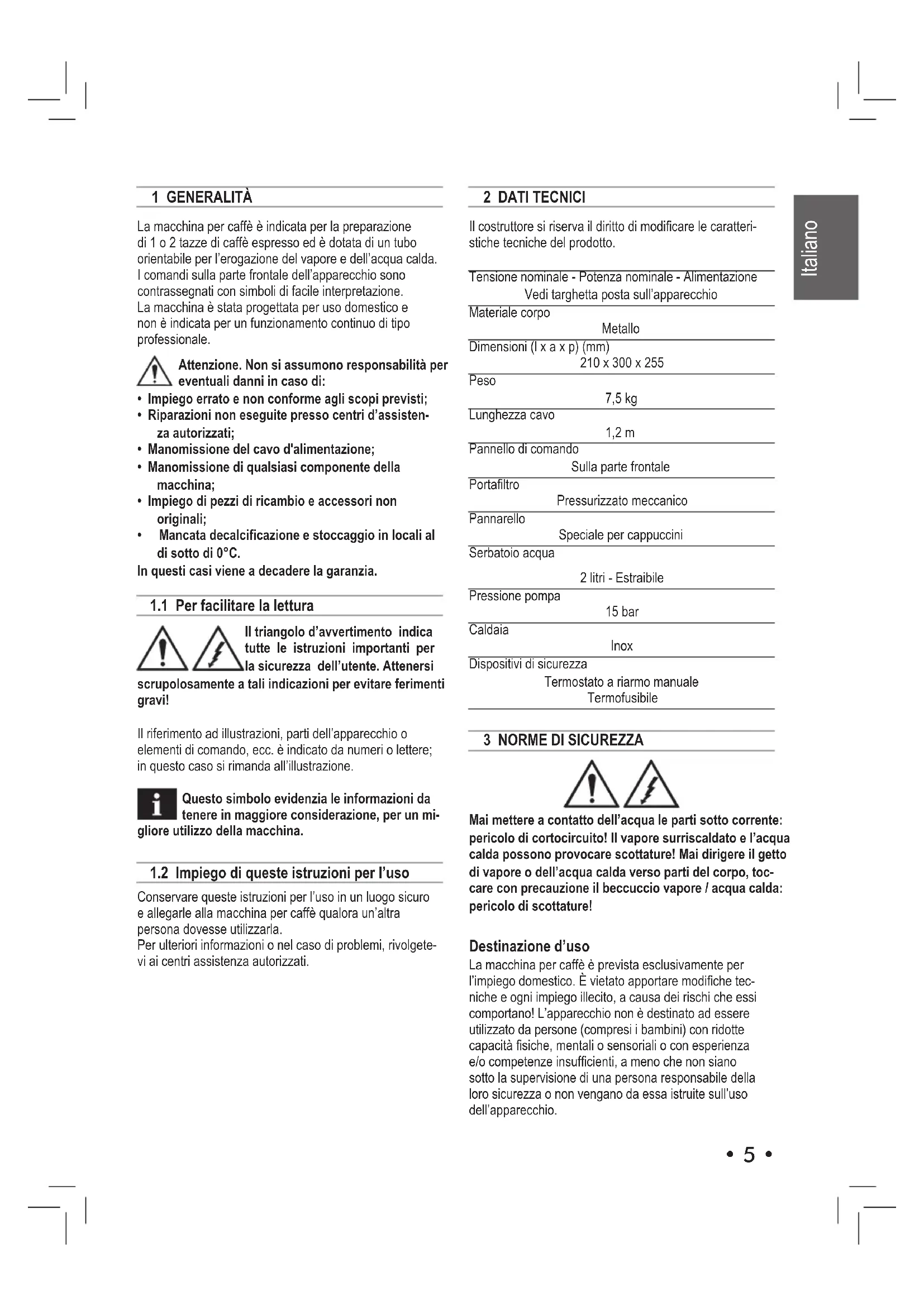 Conservare queste istruzioni per l’uso in un luogo sicuro e allegarle alla macchina per caffè qualora un’altra persona dovesse utilizzarla. Per ulteriori informazioni o nel caso di problemi, rivolgete- vi ai centri assistenza autorizzati. 2 DATI TECNICI Il costruttore si riserva il diritto di modicare le caratteri- stiche tecniche del prodotto. Tensione nominale - Potenza nominale - Alimentazione Vedi targhetta posta sull’apparecchio Materiale corpo Metallo Dimensioni (l x a x p) (mm) 210 x 300 x 255 Peso 7,5 kg Lunghezza cavo 1,2 m Pannello di comando Sulla parte frontale Portaltro Pressurizzato meccanico Pannarello Speciale per cappuccini Serbatoio acqua 2 litri - Estraibile Pressione pompa 15 bar Caldaia Inox Dispositivi di sicurezza Termostato a riarmo manuale Termofusibile