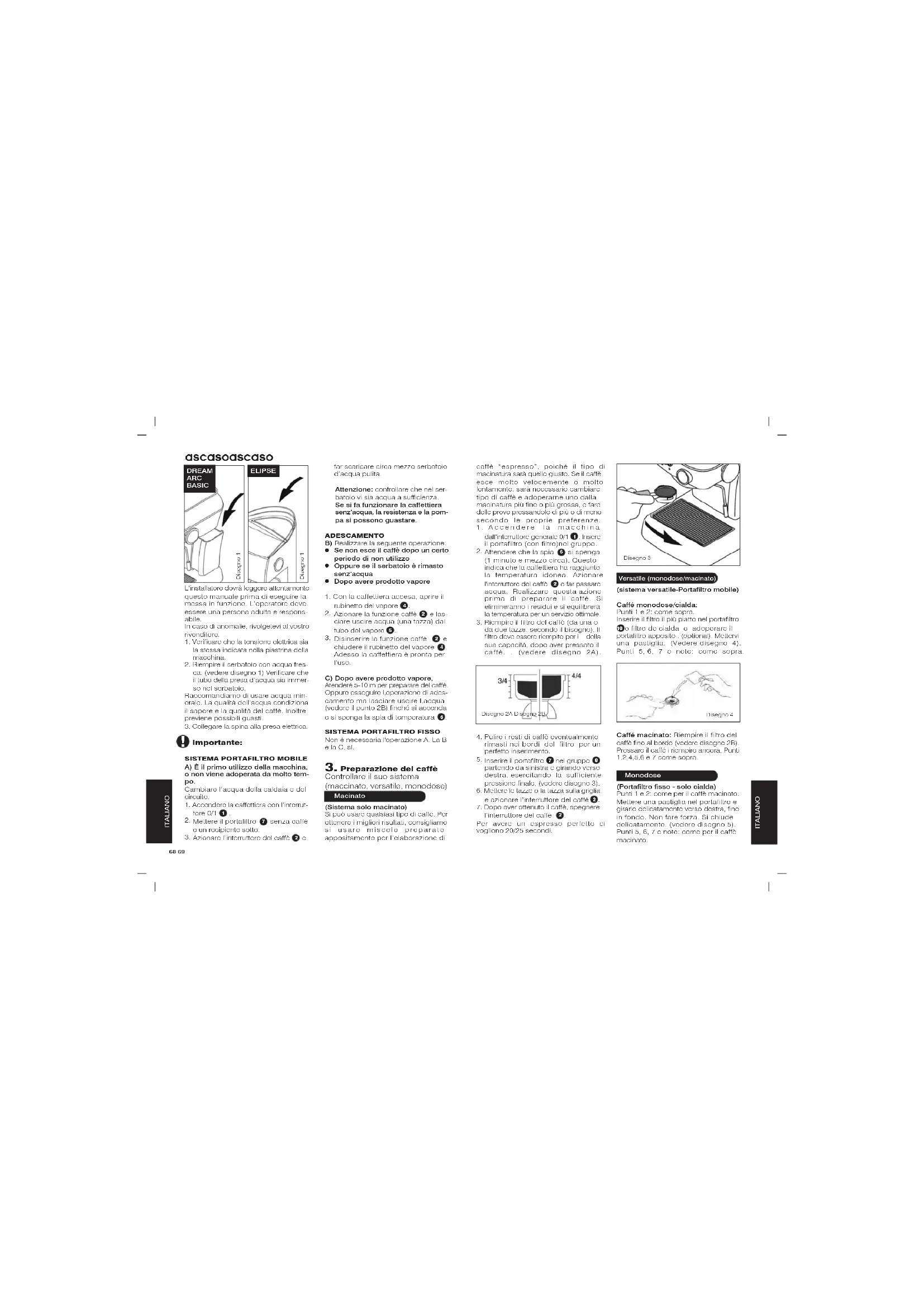 Disegno 4Disegno 2A Disegno 2BDisegno 1 DREAM ARC BASIC ELIPSE Disegno 1Disegno 3Attenzione: Non togliere né girare ilportafiltro mentre sta passando lacqua,poiché in questo momentolapparecchio è sotto pressione.Note:1. Lasciare sempre il portafiltro montatosulla macchina per mantenerlo caldo.In posizione chiusa.Mettere le tazze sullo scaldatazze