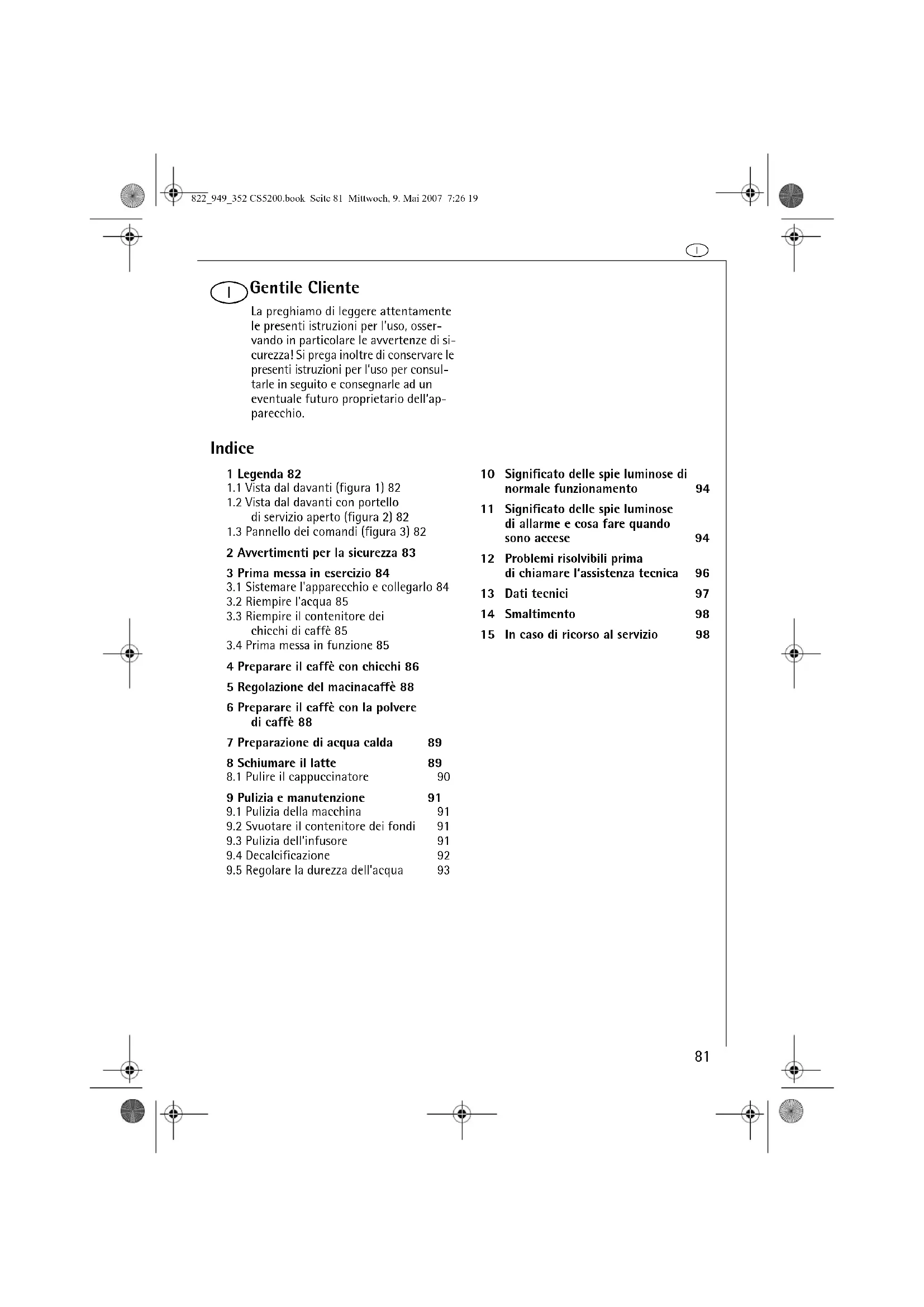 10 Significato delle spie luminose di normale funzionamento 94 11 Significato delle spie luminose di allarme e cosa fare quando sono accese 94 12 Problemi risolvibili prima di chiamare l‘assistenza tecnica 96 13 Dati tecnici 97 14 Smaltimento 98 15 In caso di ricorso al servizio 98 822_949_352 CS5200.book Seite 81 Mittwoch, 9. Mai 2007 7:26 19i