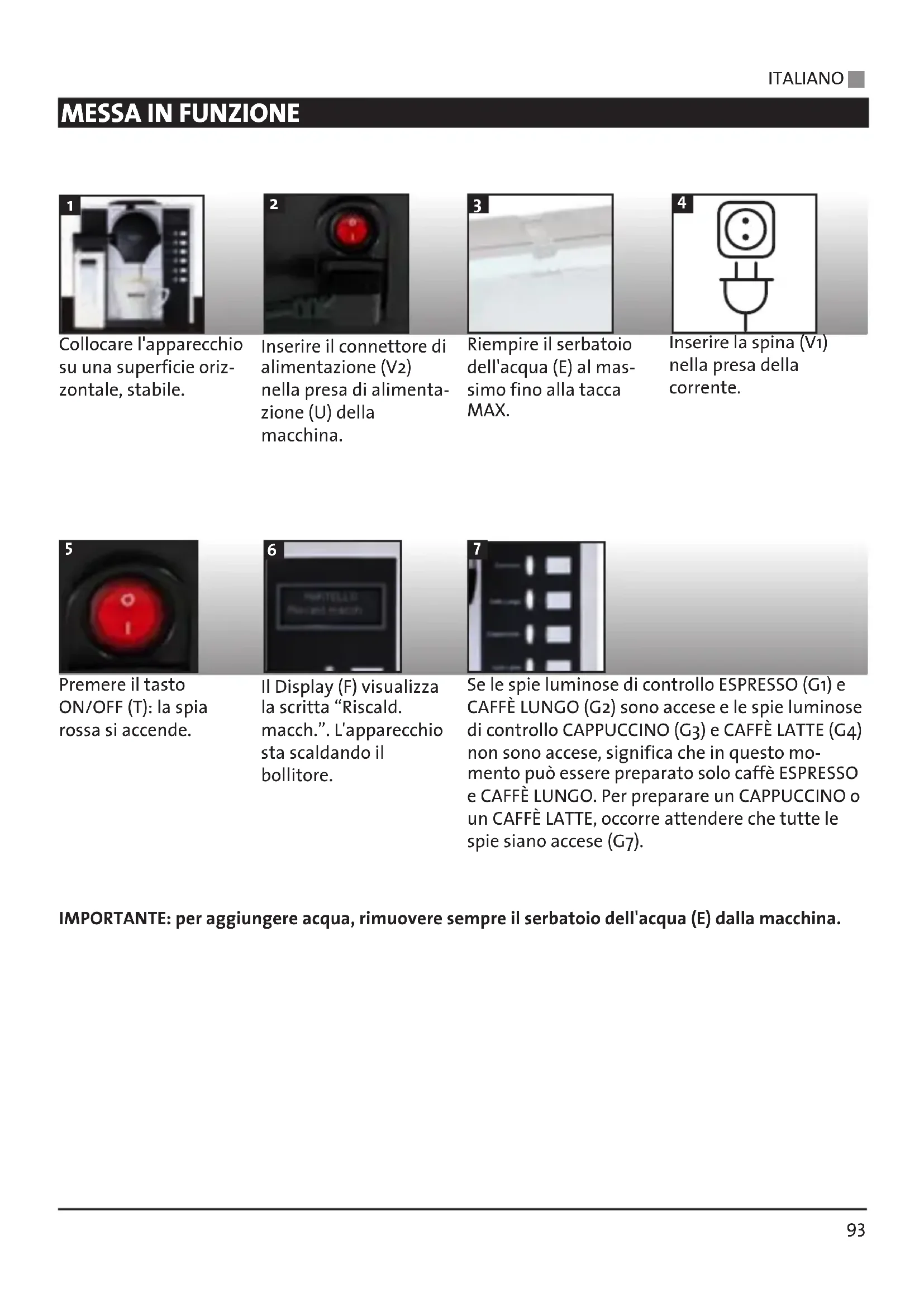 Collocare l'apparecchio su una superficie oriz- zontale, stabile. Inserire il connettore di alimentazione (V2) nella presa di alimenta- zione (U) della macchina. Riempire il serbatoio dell'acqua (E) al mas- simo fino alla tacca MAX. Inserire la spina (V1) nella presa della corrente. Premere il tasto ON/OFF (T): la spia rossa si accende. Il Display (F) visualizza la scritta “Riscald. macch.”. L'apparecchio sta scaldando il bollitore. Se le spie luminose di controllo ESPRESSO (G1) e CAFFÈ LUNGO (G2) sono accese e le spie luminose di controllo CAPPUCCINO (G3) e CAFFÈ LATTE (G4) non sono accese, significa che in questo mo- mento può essere preparato solo caffè ESPRESSO e CAFFÈ LUNGO. Per preparare un CAPPUCCINO o un CAFFÈ LATTE, occorre attendere che tutte le spie siano accese (G7). IMPORTANTE: per aggiungere acqua, rimuovere sempre il serbatoio dell'acqua (E) dalla macchina.
