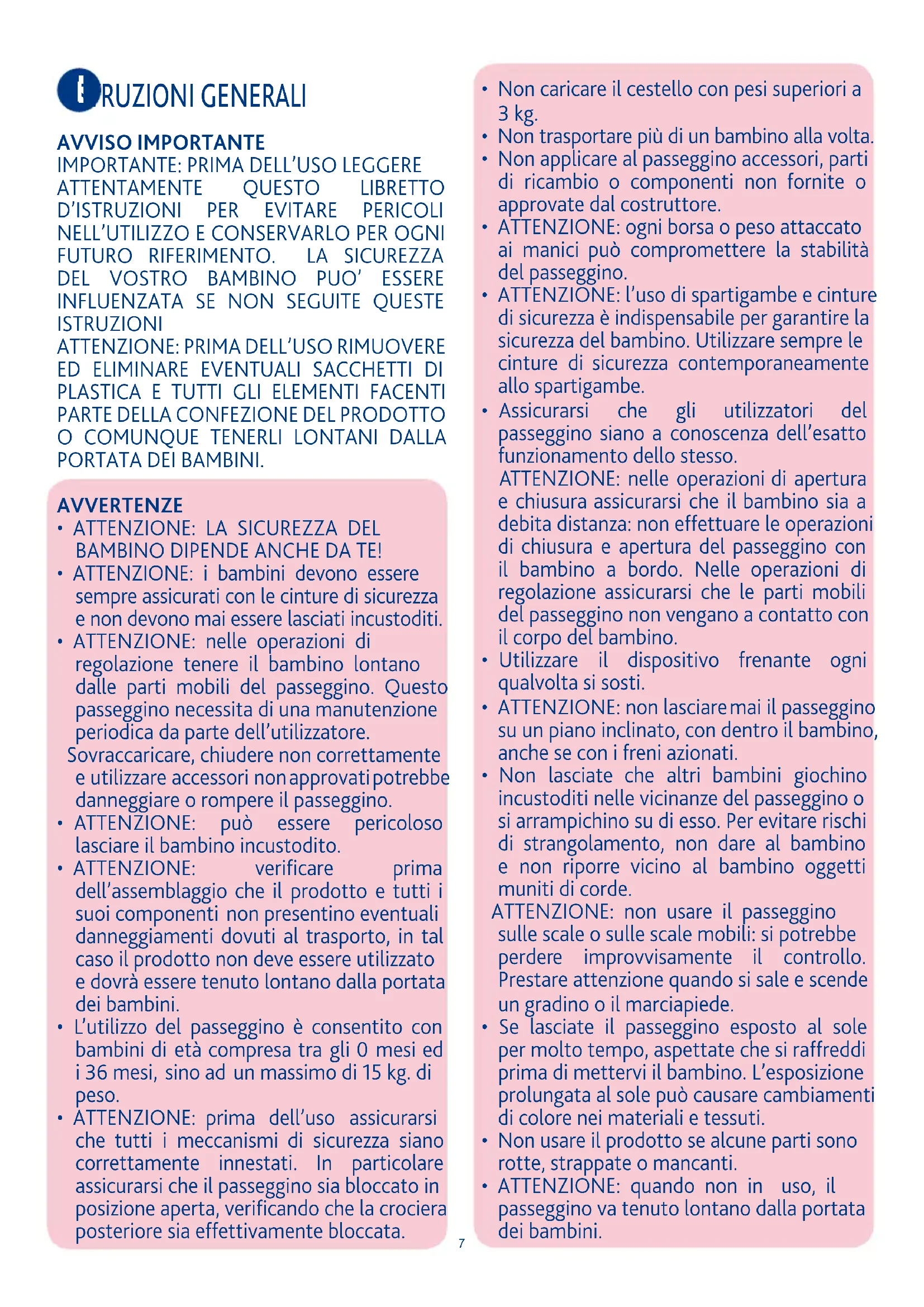 - ATTENZIONE: quando non in uso, il passeggino va tenuto lontano dalla portata dei bambini.