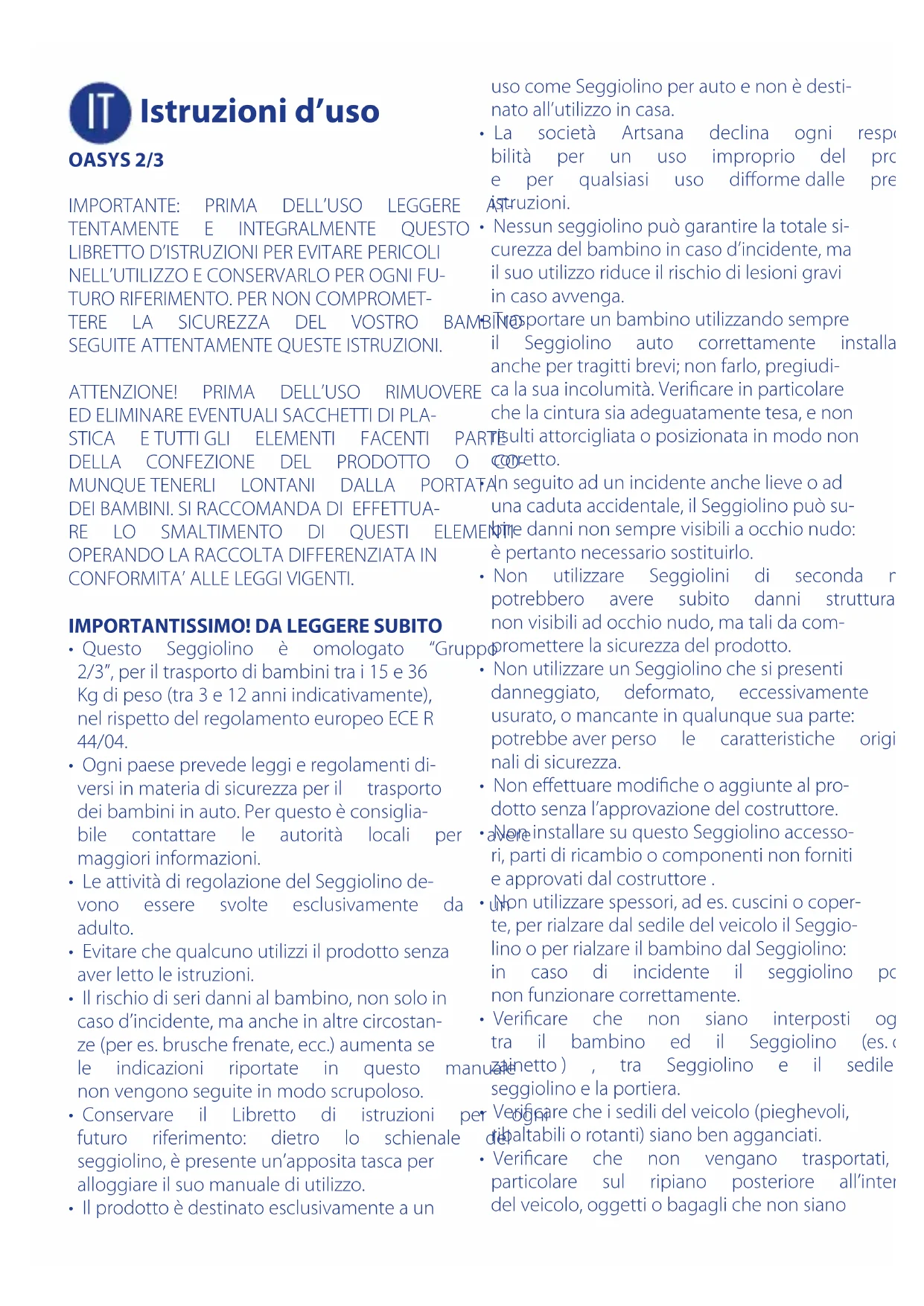 - Nelcasoilveicolosiarimastofermosottoil sole,vericare,primadiaccomodareilbam- binosulSeggiolino,chelediversepartinon sianosurriscaldate:in caso, lasciarlerared- dareprimadifarsedereilbambino,cosìda evitarescottature. AVVISO IMPORTANTE 1.Questoèundispositivodiritenutabambini “Universale”, omologato secondo Regola- mento ECE N°44, emendamenti serie 04. Adatto all’impiego generale nei veicoli e compatibileconlamaggiorparte,manon tutti,isedilidiveicolo. 2.La perfetta compatibilità è più facilmente ottenibile nei casi in cui il costruttore del veicolodichiaranelmanualeveicolarecheil veicoloprevedel’installazionedidispositivi diritenutabambini“Universali”perlafascia d’etàinquestione. 3.Questodispositivodi ritenutaèstatoclas- sicato“Universale”secondocriteridiomo- logazionepiùseveririspettoamodellipre- cedentichenondispongonodelpresente avviso. 4.Adattosolamenteper l’impiegoneiveicoli dotatidicinturadisicurezzaa3punti,stati- caoconarrotolatore,omologatainbaseal RegolamentoUN/ECEN°16oaltristandard equivalenti. 5.Incasodidubbio,contattareilproduttoredel dispositivodiritenutaoppureilrivenditore.