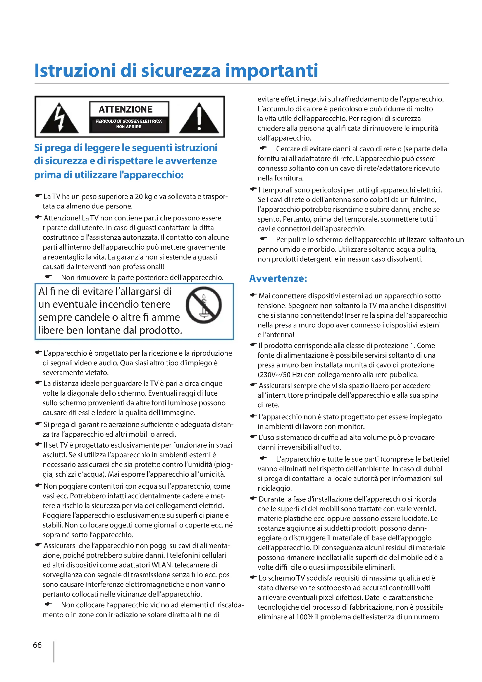Si prega di leggere le seguenti istruzioni di sicurezza e di rispettare le avvertenze prima di utilizzare l'apparecchio: La TV ha un peso superiore a 20 kg e va sollevata e traspor- tata da almeno due persone. Attenzione! La TV non contiene parti che possono essere riparate dall’utente. In caso di guasti contattare la ditta costruttrice o l'assistenza autorizzata. Il contatto con alcune parti all’interno dell’apparecchio può mettere gravemente a repentaglio la vita. La garanzia non si estende a guasti causati da interventi non professionali! Non rimuovere la parte posteriore dell’apparecchio. Al ne di evitare l’allargarsi di un eventuale incendio tenere sempre candele o altre amme libere ben lontane dal prodotto. L’apparecchio è progettato per la ricezione e la riproduzione di segnali video e audio. Qualsiasi altro tipo d'impiego è severamente vietato. La distanza ideale per guardare la TV è pari a circa cinque volte la diagonale dello schermo. Eventuali raggi di luce sullo schermo provenienti da altre fonti luminose possono causare ri essi e ledere la qualità dell’immagine. Si prega di garantire aerazione su ciente e adeguata distan- za tra l’apparecchio ed altri mobili o arredi. Il set TV è progettato esclusivamente per funzionare in spazi asciutti. Se si utilizza l’apparecchio in ambienti esterni è necessario assicurarsi che sia protetto contro l’umidità (piog- gia, schizzi d’acqua). Mai esporre l’apparecchio all’umidità. Non poggiare contenitori con acqua sull’apparecchio, come vasi ecc. Potrebbero infatti accidentalmente cadere e met- tere a rischio la sicurezza per via dei collegamenti elettrici. Poggiare l’apparecchio esclusivamente su super ci piane e stabili. Non collocare oggetti come giornali o coperte ecc. né sopra né sotto l’apparecchio. Assicurarsi che l’apparecchio non poggi su cavi di alimenta- zione, poiché potrebbero subire danni. I telefonini cellulari ed altri dispositivi come adattatori WLAN, telecamere di sorveglianza con segnale di trasmissione senza lo ecc. pos- sono causare interferenze elettromagnetiche e non vanno pertanto collocati nelle vicinanze dell’apparecchio. Non collocare l’apparecchio vicino ad elementi di riscalda- mento o in zone con irradiazione solare diretta al ne di evitare e etti negativi sul ra reddamento dell'apparecchio. L’accumulo di calore è pericoloso e può ridurre di molto la vita utile dell’apparecchio. Per ragioni di sicurezza chiedere alla persona quali cata di rimuovere le impurità dall’apparecchio. Cercare di evitare danni al cavo di rete o (se parte della fornitura) all’adattatore di rete. L’apparecchio può essere connesso soltanto con un cavo di rete/adattatore ricevuto nella fornitura. I temporali sono pericolosi per tutti gli apparecchi elettrici. Se i cavi di rete o dell'antenna sono colpiti da un fulmine, l’apparecchio potrebbe risentirne e subire danni, anche se spento. Pertanto, prima del temporale, sconnettere tutti i cavi e connettori dell’apparecchio. Per pulire lo schermo dell’apparecchio utilizzare soltanto un panno umido e morbido. Utilizzare soltanto acqua pulita, non prodotti detergenti e in nessun caso dissolventi. Avvertenze: Mai connettere dispositivi esterni ad un apparecchio sotto tensione. Spegnere non soltanto la TV ma anche i dispositivi che si stanno connettendo! Inserire la spina dell’apparecchio nella presa a muro dopo aver connesso i dispositivi esterni e l’antenna! Il prodotto corrisponde alla classe di protezione 1. Come fonte di alimentazione è possibile servirsi soltanto di una presa a muro ben installata munita di cavo di protezione (230V~/50 Hz) con collegamento alla rete pubblica. Assicurarsi sempre che vi sia spazio libero per accedere all’interruttore principale dell'apparecchio e alla sua spina di rete. L'apparecchio non è stato progettato per essere impiegato in ambienti di lavoro con monitor. L’uso sistematico di cu e ad alto volume può provocare danni irreversibili all’udito. L’apparecchio e tutte le sue parti (comprese le batterie) vanno eliminati nel rispetto dell’ambiente. In caso di dubbi si prega di contattare la locale autorità per informazioni sul riciclaggio. Durante la fase d’installazione dell’apparecchio si ricorda che le super ci dei mobili sono trattate con varie vernici, materie plastiche ecc. oppure possono essere lucidate. Le sostanze aggiunte ai suddetti prodotti possono dann- eggiare o distruggere il materiale di base dell’appoggio dell’apparecchio. Di conseguenza alcuni residui di materiale possono rimanere incollati alla super cie del mobile ed è a volte di cile o quasi impossibile eliminarli. Lo schermo TV soddisfa requisiti di massima qualità ed è stato diverse volte sottoposto ad accurati controlli volti a rilevare eventuali pixel difettosi. Date le caratteristiche tecnologiche del processo di fabbricazione, non è possibile eliminare al 100% il problema dell’esistenza di un numero67 Italiano Istruzioni di sicurezza importanti esiguo di punti difettosi nello schermo (neanche con le più alte precauzioni e cure in fase di produzione). Questi pixel difettosi non son considerati errore o guasto a livello di condizioni di garanzia, purché il loro numero non superi i limiti de niti dalla norma DIN. Informazioni importanti sull’uso di videogame, computer, sottotitoli ed altre di immagini sse. L’uso intenso di materiale da programmi con immagini sse può causare un “immagine fantasma” permanente sullo schermo LCD (questo fenomeno è a volte impropriamente descritto come “bruciatura dello schermo”). L’immagine fantasma è in questo caso costantemente visibile sullo sfondo dello schermo. Si tratta di un danno parzialmente irreversibile. Per evitare che tale problema si veri chi seguire le seguenti istruzioni: Ridurre l’impostazione della luminosità/contrasto al livello minimo di visualizzazione. Non lasciare che il fermo immagine sia visualizzato a lungo. Evitare