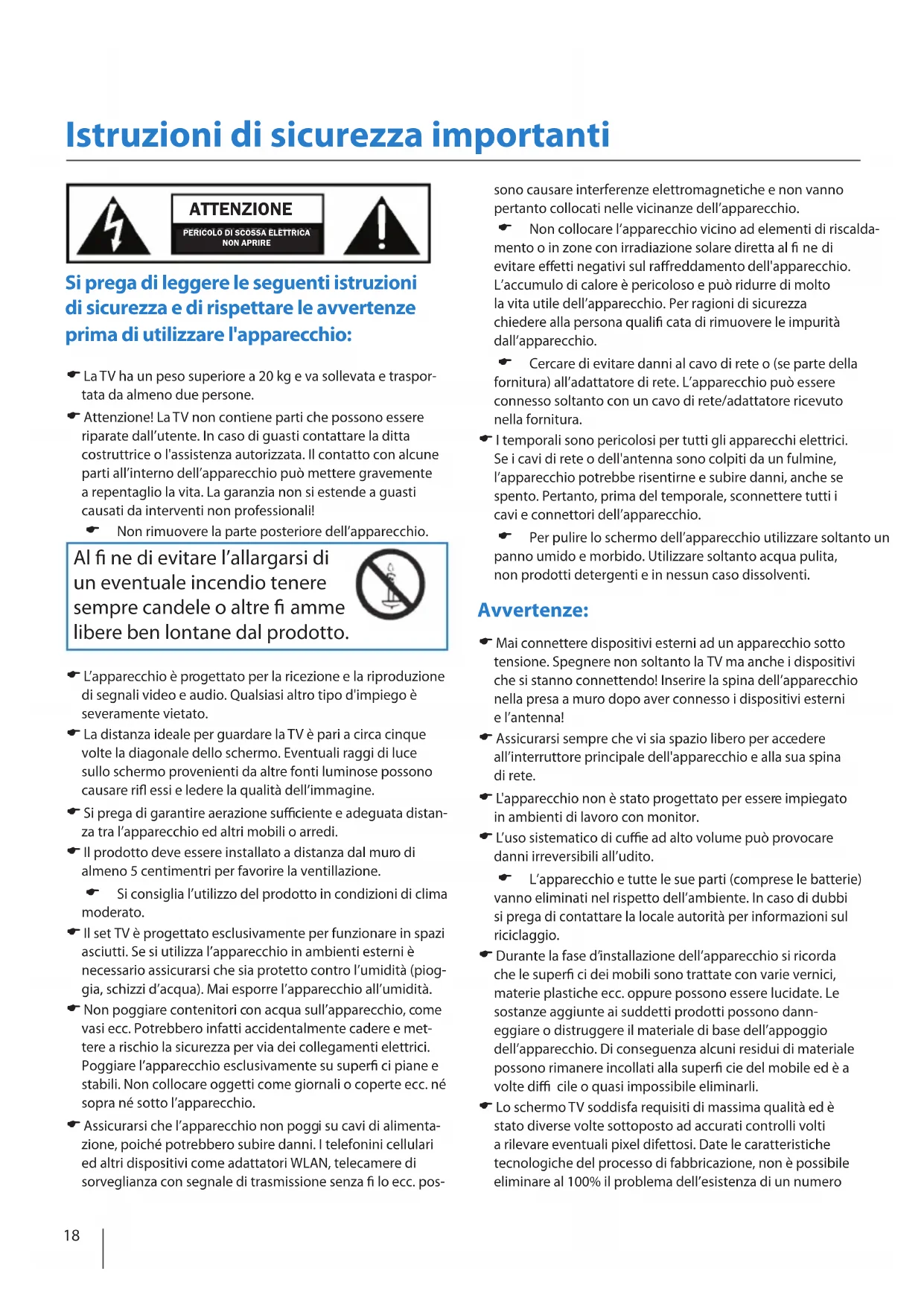 Si prega di leggere le seguenti istruzioni di sicurezza e di rispettare le avvertenze prima di utilizzare l'apparecchio: La TV ha un peso superiore a 20 kg e va sollevata e traspor- tata da almeno due persone. Attenzione! La TV non contiene parti che possono essere riparate dall’utente. In caso di guasti contattare la ditta costruttrice o l'assistenza autorizzata. Il contatto con alcune parti all’interno dell’apparecchio può mettere gravemente a repentaglio la vita. La garanzia non si estende a guasti causati da interventi non professionali! Non rimuovere la parte posteriore dell’apparecchio. Al ne di evitare l’allargarsi di un eventuale incendio tenere sempre candele o altre amme libere ben lontane dal prodotto. L’apparecchio è progettato per la ricezione e la riproduzione di segnali video e audio. Qualsiasi altro tipo d'impiego è severamente vietato. La distanza ideale per guardare la TV è pari a circa cinque volte la diagonale dello schermo. Eventuali raggi di luce sullo schermo provenienti da altre fonti luminose possono causare ri essi e ledere la qualità dell’immagine. Si prega di garantire aerazione su ciente e adeguata distan- za tra l’apparecchio ed altri mobili o arredi. Il prodotto deve essere installato a distanza dal muro di almeno 5 centimentri per favorire la ventillazione. Si consiglia l’utilizzo del prodotto in condizioni di clima moderato. Il set TV è progettato esclusivamente per funzionare in spazi asciutti. Se si utilizza l’apparecchio in ambienti esterni è necessario assicurarsi che sia protetto contro l’umidità (piog- gia, schizzi d’acqua). Mai esporre l’apparecchio all’umidità. Non poggiare contenitori con acqua sull’apparecchio, come vasi ecc. Potrebbero infatti accidentalmente cadere e met- tere a rischio la sicurezza per via dei collegamenti elettrici. Poggiare l’apparecchio esclusivamente su super ci piane e stabili. Non collocare oggetti come giornali o coperte ecc. né sopra né sotto l’apparecchio. Assicurarsi che l’apparecchio non poggi su cavi di alimenta- zione, poiché potrebbero subire danni. I telefonini cellulari ed altri dispositivi come adattatori WLAN, telecamere di sorveglianza con segnale di trasmissione senza lo ecc. pos- sono causare interferenze elettromagnetiche e non vanno pertanto collocati nelle vicinanze dell’apparecchio. Non collocare l’apparecchio vicino ad elementi di riscalda- mento o in zone con irradiazione solare diretta al ne di evitare e etti negativi sul ra reddamento dell'apparecchio. L’accumulo di calore è pericoloso e può ridurre di molto la vita utile dell’apparecchio. Per ragioni di sicurezza chiedere alla persona quali cata di rimuovere le impurità dall’apparecchio. Cercare di evitare danni al cavo di rete o (se parte della fornitura) all’adattatore di rete. L’apparecchio può essere connesso soltanto con un cavo di rete/adattatore ricevuto nella fornitura. I temporali sono pericolosi per tutti gli apparecchi elettrici. Se i cavi di rete o dell'antenna sono colpiti da un fulmine, l’apparecchio potrebbe risentirne e subire danni, anche se spento. Pertanto, prima del temporale, sconnettere tutti i cavi e connettori dell’apparecchio. Per pulire lo schermo dell’apparecchio utilizzare soltanto un panno umido e morbido. Utilizzare soltanto acqua pulita, non prodotti detergenti e in nessun caso dissolventi. Avvertenze: Mai connettere dispositivi esterni ad un apparecchio sotto tensione. Spegnere non soltanto la TV ma anche i dispositivi che si stanno connettendo! Inserire la spina dell’apparecchio nella presa a muro dopo aver connesso i dispositivi esterni e l’antenna! Assicurarsi sempre che vi sia spazio libero per accedere all’interruttore principale dell'apparecchio e alla sua spina di rete. L'apparecchio non è stato progettato per essere impiegato in ambienti di lavoro con monitor. L’uso sistematico di cu e ad alto volume può provocare danni irreversibili all’udito. L’apparecchio e tutte le sue parti (comprese le batterie) vanno eliminati nel rispetto dell’ambiente. In caso di dubbi si prega di contattare la locale autorità per informazioni sul riciclaggio. Durante la fase d’installazione dell’apparecchio si ricorda che le super ci dei mobili sono trattate con varie vernici, materie plastiche ecc. oppure possono essere lucidate. Le sostanze aggiunte ai suddetti prodotti possono dann- eggiare o distruggere il materiale di base dell’appoggio dell’apparecchio. Di conseguenza alcuni residui di materiale possono rimanere incollati alla super cie del mobile ed è a volte di cile o quasi impossibile eliminarli. Lo schermo TV soddisfa requisiti di massima qualità ed è stato diverse volte sottoposto ad accurati controlli volti a rilevare eventuali pixel difettosi. Date le caratteristiche tecnologiche del processo di fabbricazione, non è possibile eliminare al 100% il problema dell’esistenza di un numero19 Italiano Istruzioni di sicurezza importanti esiguo di punti difettosi nello schermo (neanche con le più alte precauzioni e cure in fase di produzione). Questi pixel difettosi non son considerati errore o guasto a livello di condizioni di garanzia, purché il loro numero non superi i limiti de niti dalla norma DIN. Informazioni importanti sull’uso di videogame, computer, sottotitoli ed altre di immagini sse. L’uso intenso di materiale da programmi con immagini sse può causare un “immagine fantasma” permanente sullo schermo LCD (questo fenomeno è a volte impropriamente descritto come “bruciatura dello schermo”). L’immagine fantasma è in questo caso costantemente visibile sullo sfondo dello schermo. Si tratta di un danno parzialmente irreversibile. Per evitare che tale problema si veri chi seguire le seguenti istruzioni: Ridurre l’impostazione della luminosità/contrasto al livello minimo di visualizzazione. Non lasciare che il fermo immagine sia visualizzato a lungo. Evitare: » Orario e gra che teletext, » Menu TV/DV