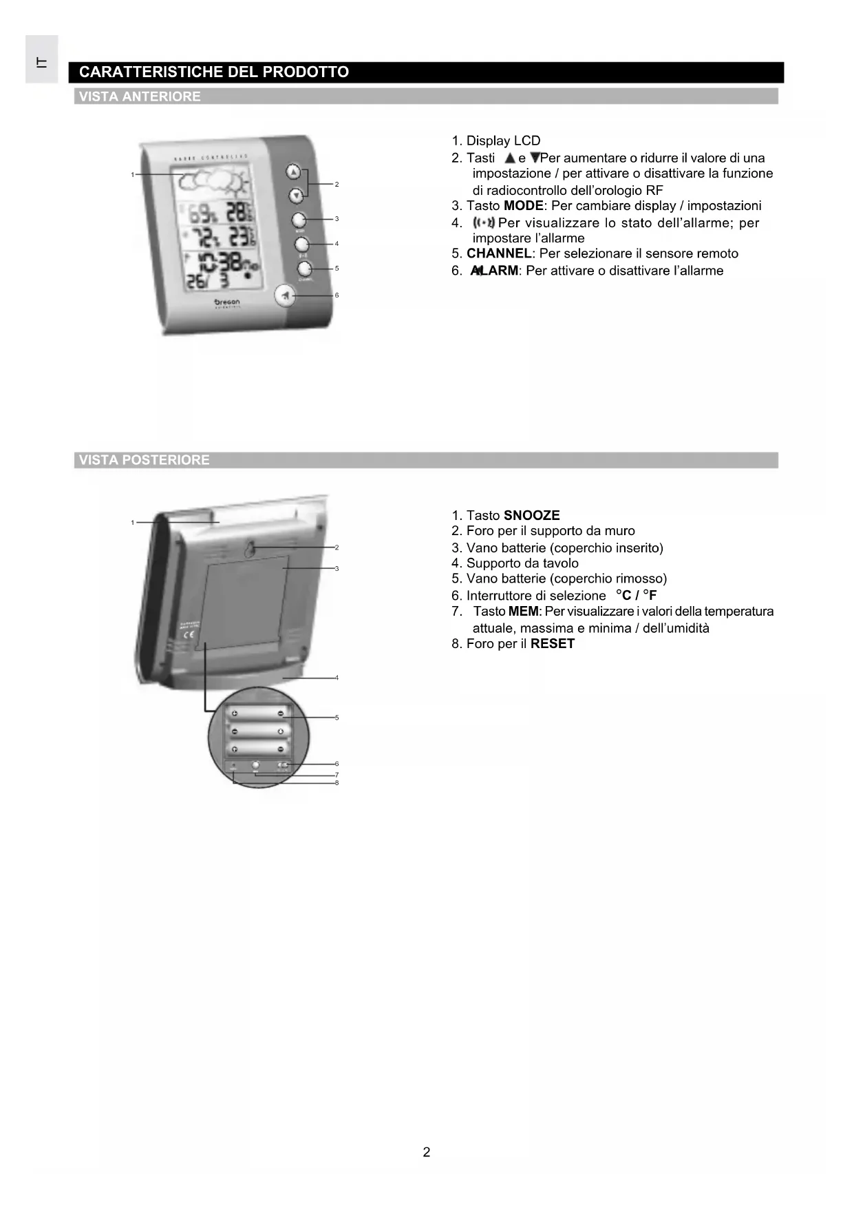 (BAR628HG / BAR628HGU). Questo dispositivo è in grado di fornire l’ora precisa, le previsioni del tempo e di monitorare la temperatura e l’umidità interne ed esterna. Contenuto della confezione: