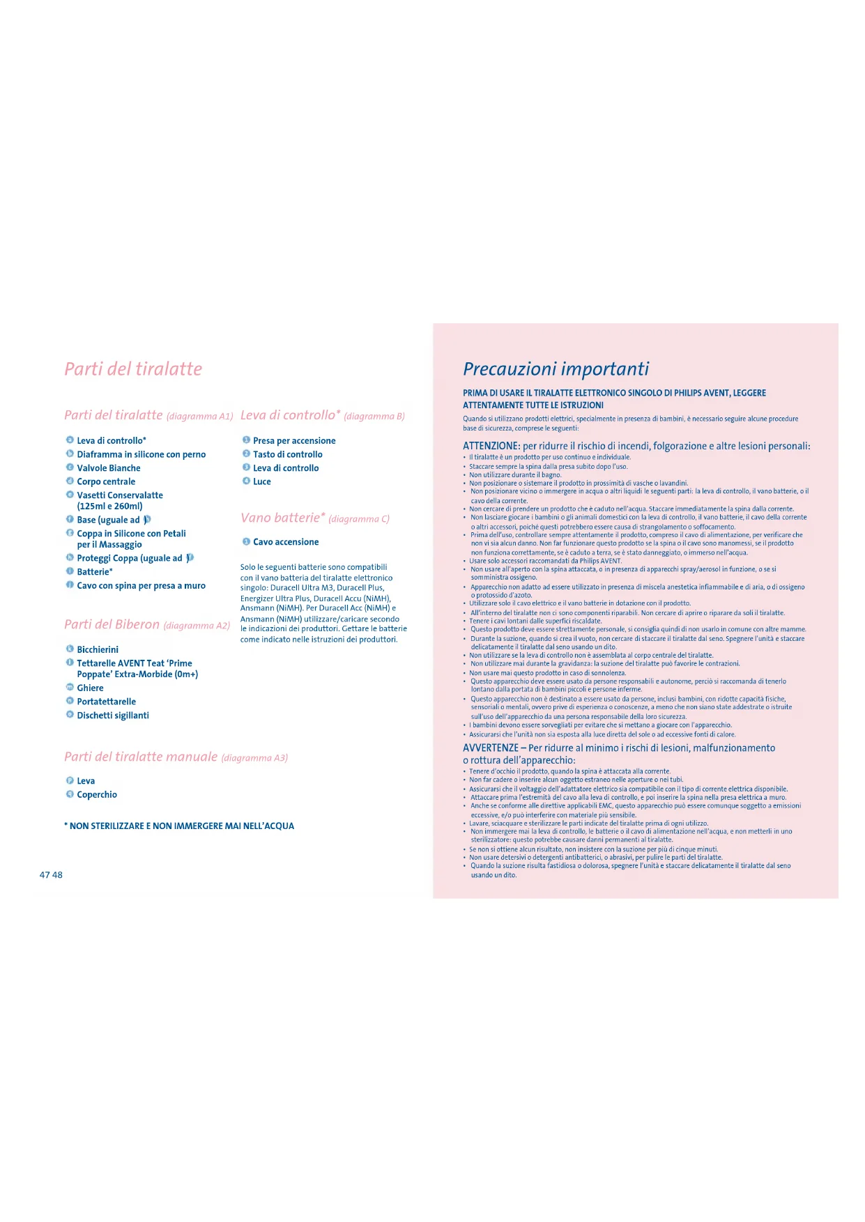 La leva di controllo (a), il vano batterie (i), o il cavo con spina per presa a muro (j). Queste parti NON vengono a contatto con il tuo latte. E’ possibile pulire la leva di controllo, utilizzando un panno morbido. Come lavare e sterilizzare il corpo centrale e gli accessori per la conservazione del latte materno Prima di utilizzare il tiralatte per la prima volta, e tutte le volte che si usa: separare, lavare e sterilizzare tutte le parti che vengono a contatto con il latte. E’ possibile lavare queste parti in lavastoviglie (solo nello scomparto superiore) o con acqua calda e sapone, e poi risciacquarle. Non usare detersivi o detergenti antibatterici, o abrasivi, poiché possono deteriorare la plastica. Per pulire la valvola, sfregarla delicatamente fra le dita con acqua calda e sapone. Non inserire alcun oggetto, potrebbe danneggiare la valvola. Sterilizzare queste parti in uno sterilizzatore a vapore (elettrico, elettronico o per forni a microonde), o facendole bollire per 10 minuti. Come mantenere il tiralatte sterile e protetto in viaggio Dopo aver sterilizzato tutte le parti, inserire la valvola bianca e il diaframma nel corpo centrale del tiralatte. Coprire il corpo centrale (d) e la coppa con petali per il massaggio (g) con la base/proteggi coppa (h), ed avvitare il portatettarella (n) sul corpo centrale (d) al posto del vasetto conservalatte. 49 50Per variare il ritmo di suzione Per variare il ritmo di suzione in qualunque momento, premere nuovamente il tasto di controllo: il tiralatte tornerà alla modalità manuale. La luce sarà di nuovo VERDE e fissa. In questo modo sarà possibile esercitare una suzione manuale fino a raggiungere il livello desiderato. A questo punto, premere il tasto di controllo ancora una volta: il tiralatte elettronico singolo continuerà la suzione secondo il ritmo scelto. Per interrompere la suzione Quando si decide di smettere di usare il tiralatte, premere il tasto di controllo e staccare delicatamente il tiralatte dal seno usando un dito. Per spegnere il tiralatte, tenere premuto per 2 secondi il tasto di controllo fino a che la luce non si spegne. Poi, staccare la spina dalla presa a muro. Se si utilizzano le batterie, disconnettere dalla leva di controllo. Se si dimentica di spegnere il tiralatte, questo si spegnerà automaticamente da solo dopo 3 minuti, per risparmiare l’energia delle batterie. Durata delle batterie Le batterie durano approssimativamente 6 ore. La luce sulla leva di controllo lampeggerà lentamente per avvertire che è il momento di cambiarle. A partire da questo momento ci sarà ancora energia sufficiente per estrarre il latte ancora una volta prima che il tiralatte si spenga, senza il rischio di interruzioni improvvise. Per raccogliere e conservare il latte materno Dopo aver estratto il latte, svitare il vasetto conservalatte (e) dal corpo centrale. Se si utilizza il vasetto conservalatte AVENT, inserire un dischetto sigillante (o) nella ghiera (m) e applicarlo al vasetto conservalatte. Se si utilizza il sistema VIA, svitare l’adattatore e chiudere il vasetto con un coperchio. Per estrarre 60-120ml di latte, in media è necessario esercitare la suzione per circa 10 minuti. Tuttavia questo è solo un esempio, e i tempi variano da persona a persona. Seregolarmentesiraccolgonopiùdi120mldilatteper volta, utilizzare il vasetto conservalatte da 260ml AVENT. Il latte materno può essere conservato in frigorifero o nel congelatore, nei vasetti conservalatte sterilizzati (da 125ml, 260ml, o 330ml, provvisti di dischetti sigillanti) o nei Vasetti VIA pre-sterilizzati. Come usare il tiralatte (vedi diagramma E) Lavarsi accuratamente le mani e detergere il seno. Sedersi comodamente con il busto leggermente inclinato in avanti (utilizzando eventualmente dei cuscini per sostenere la schiena). Assicurarsi di avere un bicchiere d’acqua a portata di mano, poiché durante l’estrazione del latte può venire molta sete. Per iniziare ad estrarre il latte