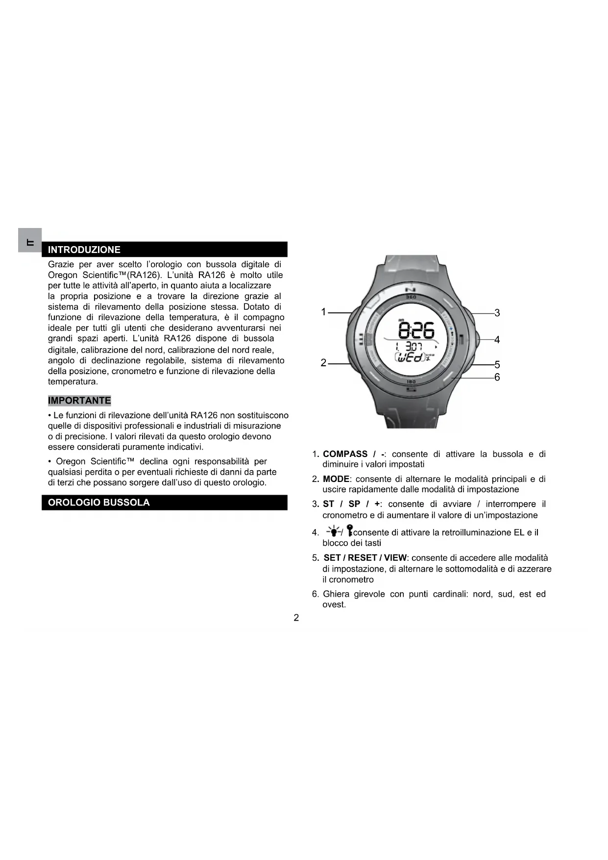 INTRODUZIONE Grazie per aver scelto l’orologio con bussola digitale di Oregon Scientific™(RA126). L’unità RA126 è molto utile per tutte le attività all’aperto, in quanto aiuta a localizzare la propria posizione e a trovare la direzione grazie al sistema di rilevamento della posizione stessa. Dotato di funzione di rilevazione della temperatura, è il compagno ideale per tutti gli utenti che desiderano avventurarsi nei grandi spazi aperti. L’unità RA126 dispone di bussola digitale, calibrazione del nord, calibrazione del nord reale, angolo di declinazione regolabile, sistema di rilevamento della posizione, cronometro e funzione di rilevazione della temperatura. IMPORTANTE