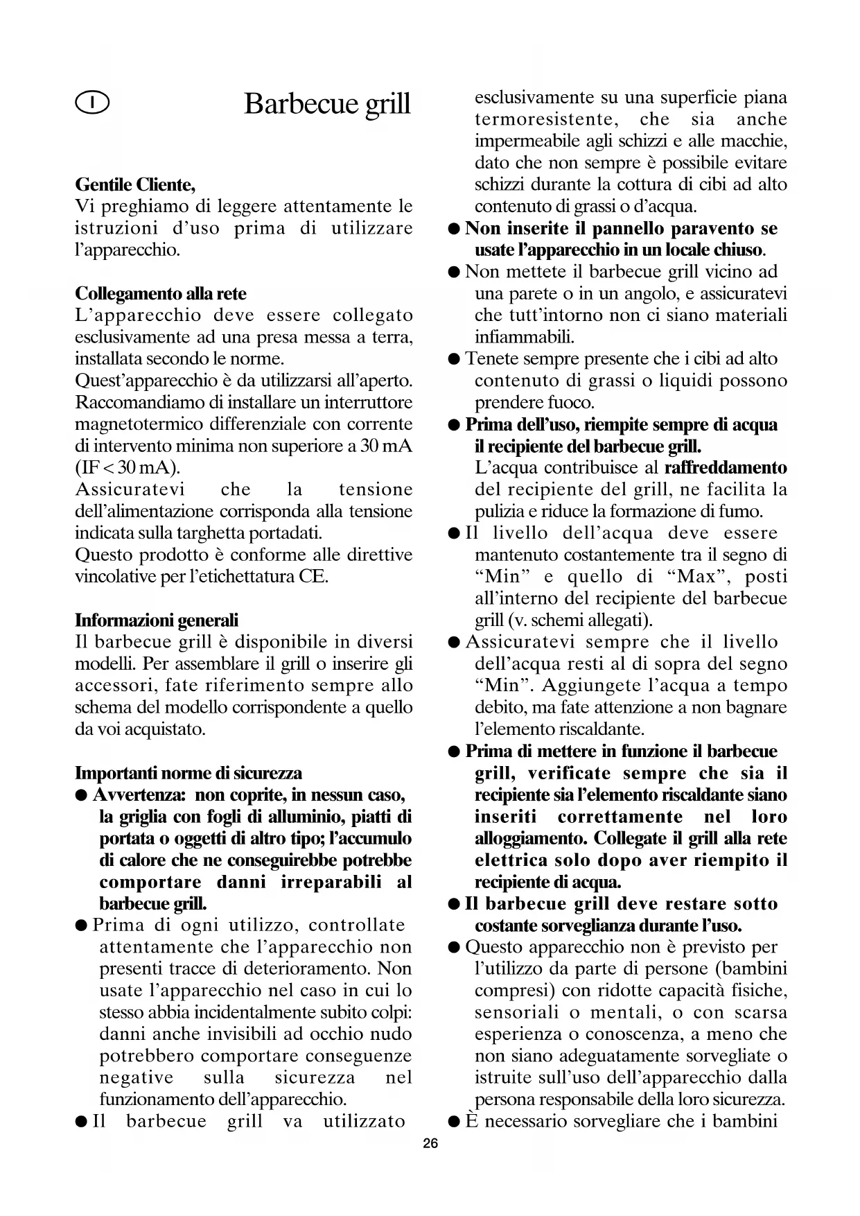 Para los modelos de grill con un plato de grill de aluminio, debe tener en cuenta que el plato perderá color después de haberlo utilizado varias veces. Esto es normal y no interfiere con el funcionamiento correcto del grill. 24Almacenaje Después de su limpieza, el grill se debe guardar dentro de casa en un lugar seco. Eliminación Los electrodomésticos viejos o defectuosos no se deben tirar en la basura de su hogar, sino que deben desecharse en los puntos públicos de reciclaje y recogida. Garantía Este producto está garantizado por un período de dos años, contado a partir de la fecha de compra, contra cualquier defecto en materiales o mano de obra. Esta garantía sólo es válida si el aparato ha sido utilizado siguiendo las instrucciones de uso, sempre que no haya sido modificado, reparado o manipulado por cualquier persona no autorizada o haya sido estropeado como consecuencia de un uso inadecuado del mismo. Naturalmente esta garantía no cubre las averías debidas a uso o desgaste normales, así como aquellas piezas de fácil rotura tales como cristales, piezas cerámicas, etc. Esta garantía no afecta a los derechos legales del consumidor ante la falta de conformidad del producto con el contrato de compraventa. 25Gentile Cliente, Vi preghiamo di leggere attentamente le istruzioni d’uso prima di utilizzare l’apparecchio. Collegamento alla rete L’apparecchio deve essere collegato esclusivamente ad una presa messa a terra, installata secondo le norme. Quest’apparecchio è da utilizzarsi all’aperto. Raccomandiamo di installare un interruttore magnetotermico differenziale con corrente di intervento minima non superiore a 30 mA (IF < 30 mA). Assicuratevi che la tensione dell’alimentazione corrisponda alla tensione indicata sulla targhetta portadati. Questo prodotto è conforme alle direttive vincolative per l’etichettatura CE. Informazioni generali Il barbecue grill è disponibile in diversi modelli. Per assemblare il grill o inserire gli accessori, fate riferimento sempre allo schema del modello corrispondente a quello da voi acquistato. Importanti norme di sicurezza ● Avvertenza: non coprite, in nessun caso, la griglia con fogli di alluminio, piatti di portata o oggetti di altro tipo; l’accumulo di calore che ne conseguirebbe potrebbe comportare danni irreparabili al barbecue grill. ● Prima di ogni utilizzo, controllate attentamente che l’apparecchio non presenti tracce di deterioramento. Non usate l’apparecchio nel caso in cui lo stesso abbia incidentalmente subito colpi: danni anche invisibili ad occhio nudo potrebbero comportare conseguenze negative sulla sicurezza nel funzionamento dell’apparecchio. ● Il barbecue grill va utilizzato esclusivamente su una superficie piana termoresistente, che sia anche impermeabile agli schizzi e alle macchie, dato che non sempre è possibile evitare schizzi durante la cottura di cibi ad alto contenuto di grassi o d’acqua. ● Non inserite il pannello paravento se usate l’apparecchio in un locale chiuso. ● Non mettete il barbecue grill vicino ad una parete o in un angolo, e assicuratevi che tutt’intorno non ci siano materiali infiammabili. ● Tenete sempre presente che i cibi ad alto contenuto di grassi o liquidi possono prendere fuoco. ● Prima dell’uso, riempite sempre di acqua il recipiente del barbecue grill. L’acqua contribuisce al raffreddamento del recipiente del grill, ne facilita la pulizia e riduce la formazione di fumo. ● Il livello dell’acqua deve essere mantenuto costantemente tra il segno di “Min” e quello di “Max”, posti all’interno del recipiente del barbecue grill (v. schemi allegati). ● Assicuratevi sempre che il livello dell’acqua resti al di sopra del segno “Min”. Aggiungete l’acqua a tempo debito, ma fate attenzione a non bagnare l’elemento riscaldante. ● Prima di mettere in funzione il barbecue grill, verificate sempre che sia il recipiente sia l’elemento riscaldante siano inseriti correttamente nel loro alloggiamento. Collegate il grill alla rete elettrica solo dopo aver riempito il recipiente di acqua. ● Il barbecue grill deve restare sotto costante sorveglianza durante l’uso. ● Questo apparecchio non è previsto per l’utilizzo da parte di persone (bambini compresi) con ridotte capacità fisiche, sensoriali o mentali, o con scarsa esperienza o conoscenza, a meno che non siano adeguatamente sorvegliate o istruite sull’uso dell’apparecchio dalla persona responsabile della loro sicurezza. ● È necessario sorvegliare che i bambini