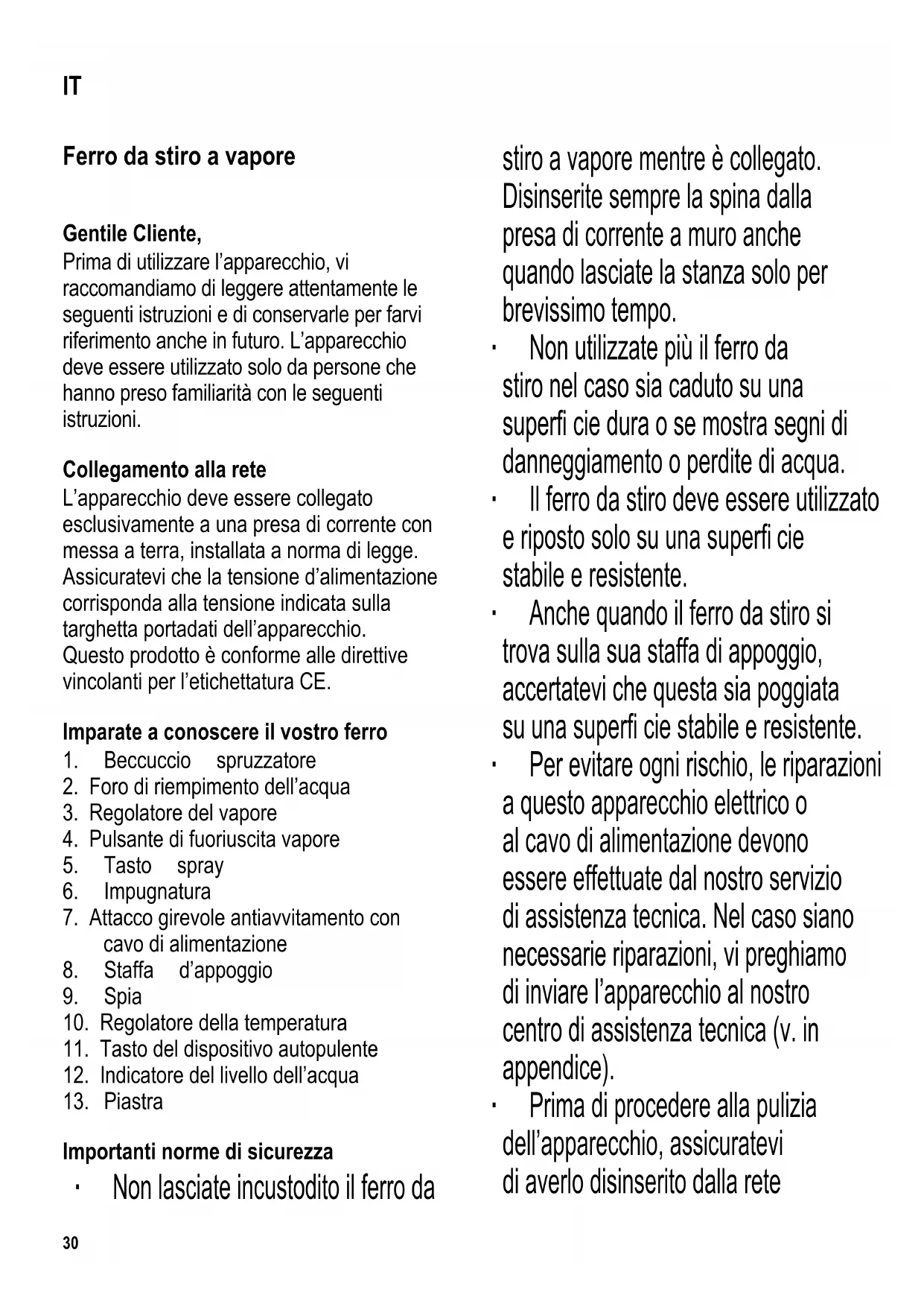 Importanti norme di sicurezza ∙ Non lasciate incustodito il ferro da stiro a vapore mentre è collegato. Disinserite sempre la spina dalla presa di corrente a muro anche quando lasciate la stanza solo per brevissimo tempo. ∙ Non utilizzate più il ferro da stiro nel caso sia caduto su una superfi cie dura o se mostra segni di danneggiamento o perdite di acqua. ∙ Il ferro da stiro deve essere utilizzato e riposto solo su una superfi cie stabile e resistente. ∙ Anche quando il ferro da stiro si trova sulla sua staffa di appoggio, accertatevi che questa sia poggiata su una superfi cie stabile e resistente. ∙ Per evitare ogni rischio, le riparazioni a questo apparecchio elettrico o al cavo di alimentazione devono essere effettuate dal nostro servizio di assistenza tecnica. Nel caso siano necessarie riparazioni, vi preghiamo di inviare l’apparecchio al nostro centro di assistenza tecnica (v. in appendice). ∙ Prima di procedere alla pulizia dell’apparecchio, assicuratevi di averlo disinserito dalla rete IT31 elettrica e che si sia raffreddato completamente. ∙ Per evitare ogni rischio di scossa elettrica, non pulite l’apparecchio con acqua e non immergetelo in acqua. ∙ Prima di riempire o di vuotare il serbatoio dell’acqua disinserite la spina dalla presa di corrente a muro. ∙ Il presente apparecchio può essere usato da bambini (di almeno 8 anni di età) e da persone con ridotte capacità fi siche, sensoriali o mentali, o persone senza particolari esperienze o conoscenze, purché siano sotto sorveglianza o siano state date loro istruzioni sull’uso dell’apparecchio e comprendano pienamente i rischi e le precauzioni di sicurezza che l’apparecchio comporta. ∙ Ai bambini non deve essere consentito di giocare con l’apparecchio. ∙ Ai bambini non deve essere consentito di effettuare operazioni di pulizia o di manutenzione sull’apparecchio a meno che non siano supervisionati da un adulto e siano comunque più grandi di 8 anni di età. ∙ Quando l’apparecchio è acceso o è ancora in fase di raffreddamento dopo l’uso, tenete il ferro da stiro e il cavo di alimentazione fuori della portata di bambini di età inferiore agli 8 anni. ∙ Avvertenza: Tutto il materiale di imballaggio deve essere tenuto fuori della portata dei bambini a causa del rischio potenziale esistente, per esempio di soffocamento. ∙ Non utilizzate in caso sia stata esercitata un’eccessiva forza nel tirare il cavo di alimentazione. Eventuali danni non sempre sono visibili dall’esterno; l’intero apparecchio va controllato da un tecnico qualifi cato prima di essere riutilizzato. ∙ L’apparecchio funziona a temperature altissime. Non toccate nessun elemento dell’apparecchio tranne l’impugnatura. Il contatto con gli elementi caldi quali il corpo dell’apparecchio, la piastra, l’acqua calda e il vapore potrebbe causare delle scottature. Fate attenzione a non indirizzare il getto di vapore sulle persone. Durante l’utilizzo il ferro da stiro a vapore deve essere tenuto esclusivamente per l’impugnatura. ∙ Il ferro da stiro deve poggiare sempre e solo su superfi ci resistenti al calore, e mai vicino a superfi ci calde (per esempio piastre di cottura) o nelle vicinanze di fornelli a fi amma libera a gas. ∙ Evitate che il cavo di alimentazione venga in contatto con le parti calde dell’apparecchio. Non attorcigliate il cavo32 di alimentazione intorno all’apparecchio. ∙ Disinserite sempre la spina dalla presa - dopo l’uso, - in caso di cattivo funzionamento, - prima di pulire l’apparecchio. ∙ Per disinserire la spina dalla presa di corrente, non tirate mai il cavo di alimentazione ma afferrate direttamente la spina. ∙ Nessuna responsabilità verrà assunta in caso di danni risultanti da un uso errato o dalla non conformità alle istruzioni. ∙ Questo apparecchio è studiato per il solo uso domestico o per impieghi simili, come per esempio - negozi, uffi ci e altri ambienti simili di lavoro, - aziende agricole, - clienti di alberghi, motel e stabilimenti simili, - clienti di pensioni “bed-and-breakfast” (letto & colazione). Filtro anticalcare Un fi ltro speciale posto nel serbatoio d’acqua del generatore di vapore addolcisce l’acqua e riduce la formazione di depositi calcarei all’interno della piastra. Riempimento del serbatoio dell’acqua Riempite il serbatoio dell’acqua prima di utilizzare la funzione vapore o il beccuccio spruzzatore. Disinserite la spina dalla presa di corrente a muro prima di riempire il serbatoio. ∙ Sebbene sia possibile utilizzare la normale acqua di rubinetto, per una maggior durata del prodotto consigliamo l’utilizzo di acqua distillata, demineralizzata o decalcifi cata. Nel caso in cui non siate sicuri della durezza dell’acqua nella vostra zona, chiedete informazioni presso l’autorità locale pertinente. ∙ Per evitare sgocciolii di acqua dalla piastra, assicuratevi di aver chiuso il tasto regolatore del vapore. Apritelo solo quando sia stato raggiunto il livello di temperatura richiesto per stirare [secondo quanto indicato sull’apposito tasto regolatore di temperatura]. ∙ Aprite il coperchio del foro di riempimento dell’acqua. ∙ Riempite d’acqua il serbatoio vuoto usando il misurino graduato fornito in dotazione. Non superate il segno “Max”. ∙ Richiudete il foro di riempimento dell’acqua. Dispositivo antisgocciolamento Se la temperatura della piastra non è suffi ciente per la formazione del vapore, il sistema di rifornimento d’acqua verrà bloccato automaticamente per evitare sgocciolii. Informazioni generali per la stiratura Prima di cominciare, controllate sempre se sull’indumento da stirare è presente un’etichetta specifi ca di istruzioni. ∙ Il signifi cato dei simboli di stiratura è il seguente :