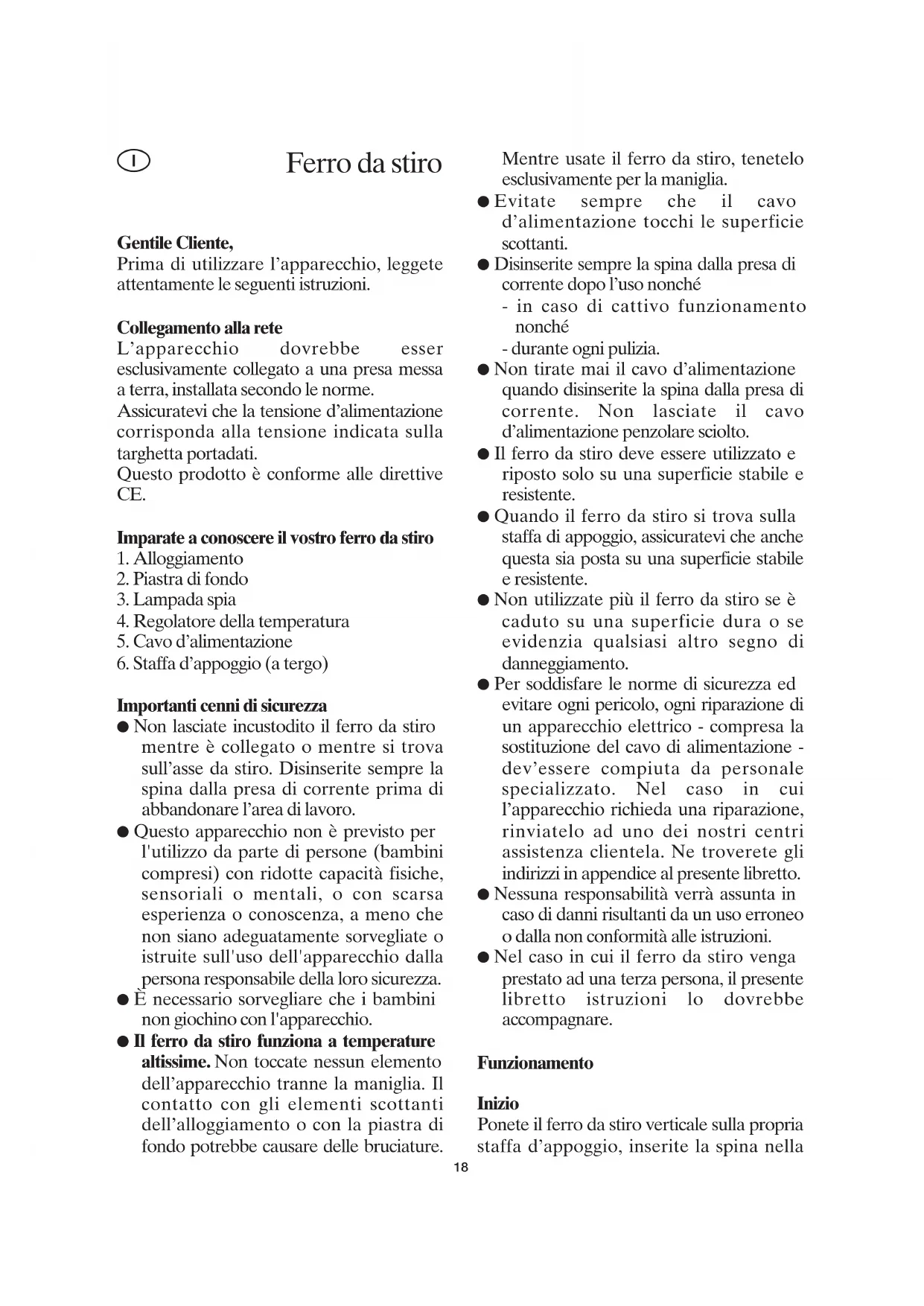 Importanti cenni di sicurezza ● Non lasciate incustodito il ferro da stiro mentre è collegato o mentre si trova sull’asse da stiro. Disinserite sempre la spina dalla presa di corrente prima di abbandonare l’area di lavoro. ● Questo apparecchio non è previsto per l'utilizzo da parte di persone (bambini compresi) con ridotte capacità fisiche, sensoriali o mentali, o con scarsa esperienza o conoscenza, a meno che non siano adeguatamente sorvegliate o istruite sull'uso dell'apparecchio dalla persona responsabile della loro sicurezza. ● È necessario sorvegliare che i bambini non giochino con l'apparecchio. ● Il ferro da stiro funziona a temperature altissime. Non toccate nessun elemento dell’apparecchio tranne la maniglia. Il contatto con gli elementi scottanti dell’alloggiamento o con la piastra di fondo potrebbe causare delle bruciature. Mentre usate il ferro da stiro, tenetelo esclusivamente per la maniglia. ● Evitate sempre che il cavo d’alimentazione tocchi le superficie scottanti. ● Disinserite sempre la spina dalla presa di corrente dopo l’uso nonché - in caso di cattivo funzionamento nonché - durante ogni pulizia. ● Non tirate mai il cavo d’alimentazione quando disinserite la spina dalla presa di corrente. Non lasciate il cavo d’alimentazione penzolare sciolto. ● Il ferro da stiro deve essere utilizzato e riposto solo su una superficie stabile e resistente. ● Quando il ferro da stiro si trova sulla staffa di appoggio, assicuratevi che anche questa sia posta su una superficie stabile e resistente. ● Non utilizzate più il ferro da stiro se è caduto su una superficie dura o se evidenzia qualsiasi altro segno di danneggiamento. ● Per soddisfare le norme di sicurezza ed evitare ogni pericolo, ogni riparazione di un apparecchio elettrico - compresa la sostituzione del cavo di alimentazione - dev’essere compiuta da personale specializzato. Nel caso in cui l’apparecchio richieda una riparazione, rinviatelo ad uno dei nostri centri assistenza clientela. Ne troverete gli indirizzi in appendice al presente libretto. ● Nessuna responsabilità verrà assunta in caso di danni risultanti da un uso erroneo o dalla non conformità alle istruzioni. ● Nel caso in cui il ferro da stiro venga prestato ad una terza persona, il presente libretto istruzioni lo dovrebbe accompagnare. Funzionamento Inizio Ponete il ferro da stiro verticale sulla propria staffa d’appoggio, inserite la spina nella