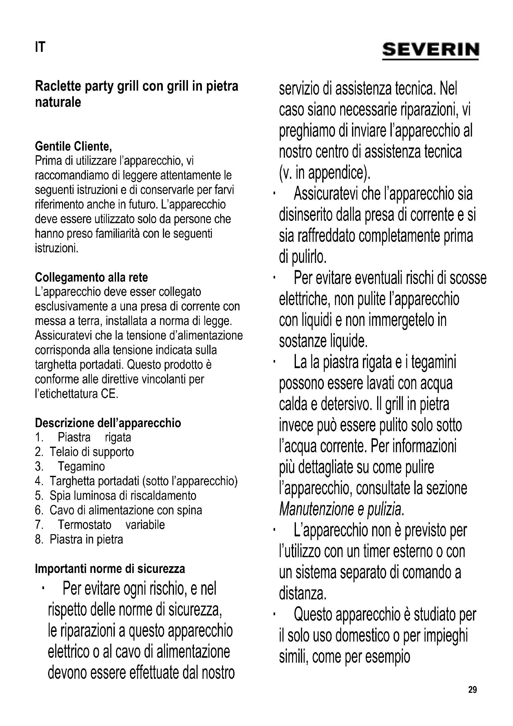 Importanti norme di sicurezza ∙ Per evitare ogni rischio, e nel rispetto delle norme di sicurezza, le riparazioni a questo apparecchio elettrico o al cavo di alimentazione devono essere effettuate dal nostro servizio di assistenza tecnica. Nel caso siano necessarie riparazioni, vi preghiamo di inviare l’apparecchio al nostro centro di assistenza tecnica (v. in appendice). ∙ Assicuratevi che l’apparecchio sia disinserito dalla presa di corrente e si sia raffreddato completamente prima di pulirlo. ∙ Per evitare eventuali rischi di scosse elettriche, non pulite l’apparecchio con liquidi e non immergetelo in sostanze liquide. ∙ La la piastra rigata e i tegamini possono essere lavati con acqua calda e detersivo. Il grill in pietra invece può essere pulito solo sotto l’acqua corrente. Per informazioni più dettagliate su come pulire l’apparecchio, consultate la sezione Manutenzione e pulizia. ∙ L’apparecchio non è previsto per l’utilizzo con un timer esterno o con un sistema separato di comando a distanza. ∙ Questo apparecchio è studiato per il solo uso domestico o per impieghi simili, come per esempio IT30 - in uffi ci e altri ambienti commerciali, - in aziende agricole, - da clienti di alberghi, motel e stabilimenti simili, - da clienti di pensioni “bed-and- breakfast” (letto & colazione). ∙ Il presente apparecchio può essere usato da bambini (di almeno 8 anni di età) e da persone con ridotte capacità fi siche, sensoriali o mentali, o persone senza particolari esperienze o conoscenze, purché siano sotto sorveglianza o siano state date loro istruzioni sull’uso dell’apparecchio e comprendano pienamente i rischi e le precauzioni di sicurezza che l’apparecchio comporta. ∙ Ai bambini non deve essere consentito di giocare con l’apparecchio. ∙ Ai bambini non deve essere consentito di effettuare operazioni di pulizia o di manutenzione sull’apparecchio a meno che non siano supervisionati da un adulto e siano comunque più grandi di 8 anni di età. ∙ L’apparecchio e il cavo di alimentazione devono essere tenuti sempre fuori della portata di bambini di età inferiore agli 8 anni. ∙ Avvertenza: Tutto il materiale di imballaggio deve essere tenuto fuori della portata dei bambini a causa del rischio potenziale esistente, per esempio di soffocamento. ∙ Prima di mettere in uso l’apparecchio, è necessario controllare attentamente che il corpo principale, compreso il cavo di alimentazione e ogni accessorio inserito, non presentino guasti o difetti. Se per esempio fosse caduto battendo su una superfi cie dura, o se è stata usata una forza eccessiva nel tirare il cavo di alimentazione, l’apparecchio non va più usato: danni anche invisibili ad occhio nudo potrebbero comportare conseguenze negative sulla sicurezza nel funzionamento dell’apparecchio. ∙ Il cavo di alimentazione non deve toccare le parti dell’apparecchio soggette a riscaldarsi. ∙ Avvertenza: Esiste il pericolo di procurarsi ustioni. Le superfi ci esterne dell’apparecchio, le piastre di grigliatura e i tegamini diventano molto caldi durante il funzionamento. ∙ Non lasciate l’apparecchio incustodito durante l’uso. ∙ Durante il funzionamento, l’apparecchio deve essere installato su una superfi cie resistente al calore, impermeabile agli spruzzi e antimacchia: non è sempre possibile evitare schizzi durante la cottura di cibi ad alto tenore di grasso o di sostanze liquide. ∙ Non mettete il grill vicino a una parete o in31 un angolo e assicuratevi che tutt’intorno non ci siano materiali infi ammabili. ∙ Prima dell’uso, sistemate la piastra in pietra e la piastra rigata sull’apparecchio, sopra la resistenza. ∙ Attenzione: Non utilizzate l’apparecchio all’aperto. ∙ Disinserite sempre la spina dalla presa - dopo l’uso, - in caso di cattivo funzionamento - prima di pulire l’apparecchio. ∙ Per disinserire la spina dalla presa di corrente, non tirate mai il cavo di alimentazione, ma afferrate direttamente la spina. ∙ Questo apparecchio va adoperato esclusivamente con gli accessori forniti dal fabbricante. ∙ Lasciate sempre all’apparecchio il tempo di raffreddarsi prima di rimuovere la piastra in pietra e la piastra rigata e prima di pulire o conservare l’apparecchio. ∙ Nessuna responsabilità verrà assunta in caso di danni risultanti da un uso errato o dalla non conformità alle istruzioni. Funzionamento Primo utilizzo Eliminate completamente tutto il materiale di imballaggio. Prima di accendere l’apparecchio per la prima volta, pulite la griglia in pietra, la griglia rigata e i tegamini con un panno umido. Vi consigliamo di far riscaldare l’apparecchio e i tegamini per circa 10 minuti senza aggiungere alimenti, per eliminare il tipico odore che emana un grill alla sua prima accensione. Potrebbe comunque alzarsi un leggero fumo: è preferibile aerare bene il locale durante quest’operazione. Piastra in pietra ∙ Sistemate la pietra sull’apparecchio, sopra la resistenza, con la parte levigata rivolta verso l’alto. La parte centrale più spessa della pietra deve poggiare sui due binari del telaio per poter essere sostenuto correttamente in posizione. ∙ Avvertenza: evitate di mettere la pietra fredda sulla resistenza già calda. ∙ La pietra può essere usata per preparare ortaggi, fettine di carne, fi letti di pesce e altro. ∙ La pietra è un materiale assolutamente naturale. È possibile che presenti piccole incrinature causate dalla normale espansione e contrazione del materiale durante le fasi di riscaldamento e di raffreddamento o che acquisti una colorazione più scura: ciò è del tutto normale e non comporta nessun effetto dannoso. ∙ Non mettete mai sulla pietra alimenti congelati o che contengono aceto (p. es. cetriolini sottaceto o senape). Piastra rigata Prima di accendere l’apparecchio, sistemate sull’apparecchio, sopra la resistenza, la piastra con il lato rigato rivolto verso l’alto e controllate che le sc