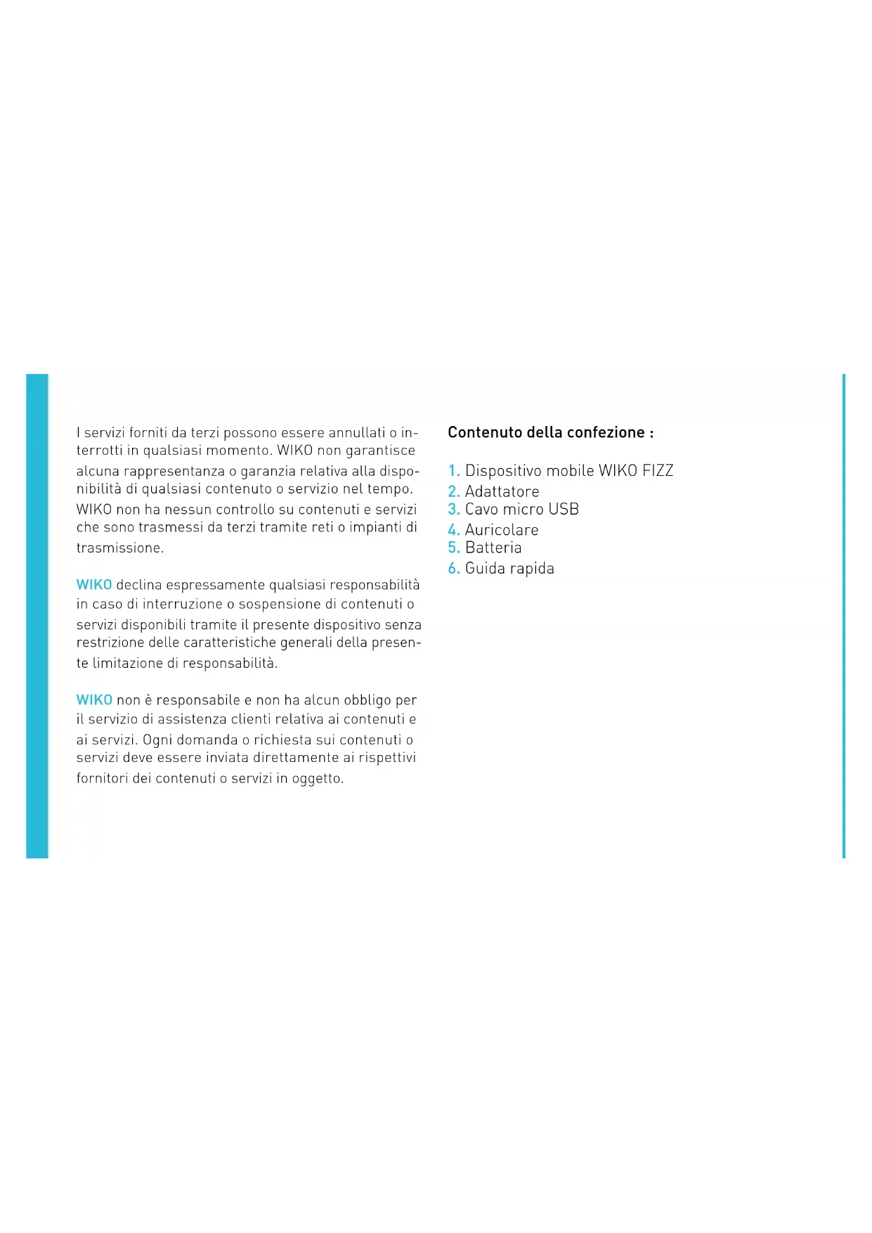 Laurent DAHAN / CEO (Name and signature of the authorised official) We, WIKO SAS - 1, rue Capitaine Dessemond - 13007 - Marseilles - FRANCE, here by declare that the FIZZ mobile phone complies with the standards and provisions of the Directives. The procedure for the Statement of Compliance, set out in Article 10.5 of Directive 1999/5/EC, was conducted under the supervision of the following organisation: PHOENIX TESTLAB GmbH, Königswinkel 10 D-32825 Blomberg, Germany www.phoenix-testlab.de Phone +49(0)5235-9500-0 / Fax +49(0)5235-9500-10 The full text of the device’s Statement of Compliance is available on written request to the following address : WIKO SAS - 1, rue Capitaine Dessemond - 13007 - Marseilles - FRANCEWIKO SAS 1, rue Capitaine Dessemond 13007 Marseille FRANCE www.wikomobile.com Prolonged listening to the music player at full power may damage the user’s hearing.Il contenuto del presente manuale potrebbe differire dal prodotto o dal software fornito dal gestore telefonico. Guida rapidaCONGRATULAZIONI ! Hai appena acquistato un dispositivo mobile WIKO FIZZ. Nella presente guida sono elencate le informazioni re- lative all’uso del tuo smartphone allo scopo di aiutarti a familiarizzare con l’universo WIkO. Copyright © 2014 WIKO www.wikomobile.com Non è consentito trasferire, riprodurre e diffondere in nessun caso le informazioni contenute nel presente manuale in qualsiasi forma o senza avere preventiva- mente ottenuto il consenso scritto di WIkO. Marchi commerciali WIKO è un marchio depositato di WIkO. Nota WIKO si riserva il diritto di modificare in qualsiasi mo- mento le informazioni contenute nella presente guida. Il presente manuale è realizzato con la massima attenzione, tuttavia tutte le informazioni e le racco- mandazioni che vi sono descritte non rappresentano nessuna garanzia. Limitazione di responsabilità Tutti i servizi e i contenuti accessibili tramite questo apparecchio sono di proprietà esclusiva di terzi e per- tanto protetti dalle leggi in vigore in materia (diritto d’autore, brevetto, licenza e altre leggi sulla proprietà intellettuale). Questi servizi sono riservati per uso personale e non per un uso commerciale. Non è pos- sibile utilizzare questi contenuti o servizi senza farne richiesta scritta al proprietario del contenuto. Non è possibile copiare, pubblicare, trasferire, vendere o sfruttare con qualsiasi supporto i contenuti o i servizi modificati tramite il presente dispositivo o di crearne opere derivate.I sERVIZI E I CONTENUTI DI TERZI sONO FORNITI «TALI QUALI». WIkO NON GARANTIsCE I CONTE- NUTI O I sERVIZI COsI FORNITI, EsPLICITAMENTE O IMPLICITAMENTE, PER NEssUNO sCOPO. WIkO RIFIUTA ALTREsÌ LE GARANZIE DI COMMERCIABILI- TÀ O IDONEITÀ PER UNO sCOPO sPECIFICO. WIkO NON GARANTIsCE L’ACCURATEZZA, LA VALIDITÀ, LA LEGALITÀ O LA COMPLETEZZA DEI CONTENUTI O sERVIZI FORNITI DAL PREsENTE DIsPOsITIVO. WIkO NON sARÀ REsPONsABILE IN CAsO DI NEGLIGEN- ZA, IN CONTRATTO O TORTO, PER DANNI DIRETTI, INDIRETTI O FORTUITI, PER GLI ONORARI LEGALI, LE sPEsE O QUALsIAsI ALTRO DANNO RIsULTANTE DALL’UTILIZZO DEI CONTENUTI O sERVIZI DA PAR- TE DELL’UTENTE O DI TERZI ANCHE sE LA sOCIETA’ WIkO È sTATA INFORMATA DELLA POssIBILITÀ DI EVENTUALI PROBLEMI. POICHÉ ALCUNI PAEsI NON AUTORIZZANO L’EsCLUsIONE DELLE GARANZIE IM- PLICITE O LA LIMITAZIONE DEI DIRITTI LEGALI DEL CONsUMATORE, È POssIBILE CHE QUEsTE EsCLU- sIONI E LIMITAZIONI NON sIANO APPLICABILI.I servizi forniti da terzi possono essere annullati o in- terrotti in qualsiasi momento. WIKO non garantisce alcuna rappresentanza o garanzia relativa alla dispo- nibilità di qualsiasi contenuto o servizio nel tempo. WIKO non ha nessun controllo su contenuti e servizi che sono trasmessi da terzi tramite reti o impianti di trasmissione. WIKO declina espressamente qualsiasi responsabilità in caso di interruzione o sospensione di contenuti o servizi disponibili tramite il presente dispositivo senza restrizione delle caratteristiche generali della presen- te limitazione di responsabilità. WIKO non è responsabile e non ha alcun obbligo per il servizio di assistenza clienti relativa ai contenuti e ai servizi. Ogni domanda o richiesta sui contenuti o servizi deve essere inviata direttamente ai rispettivi fornitori dei contenuti o servizi in oggetto. Contenuto della confezione :