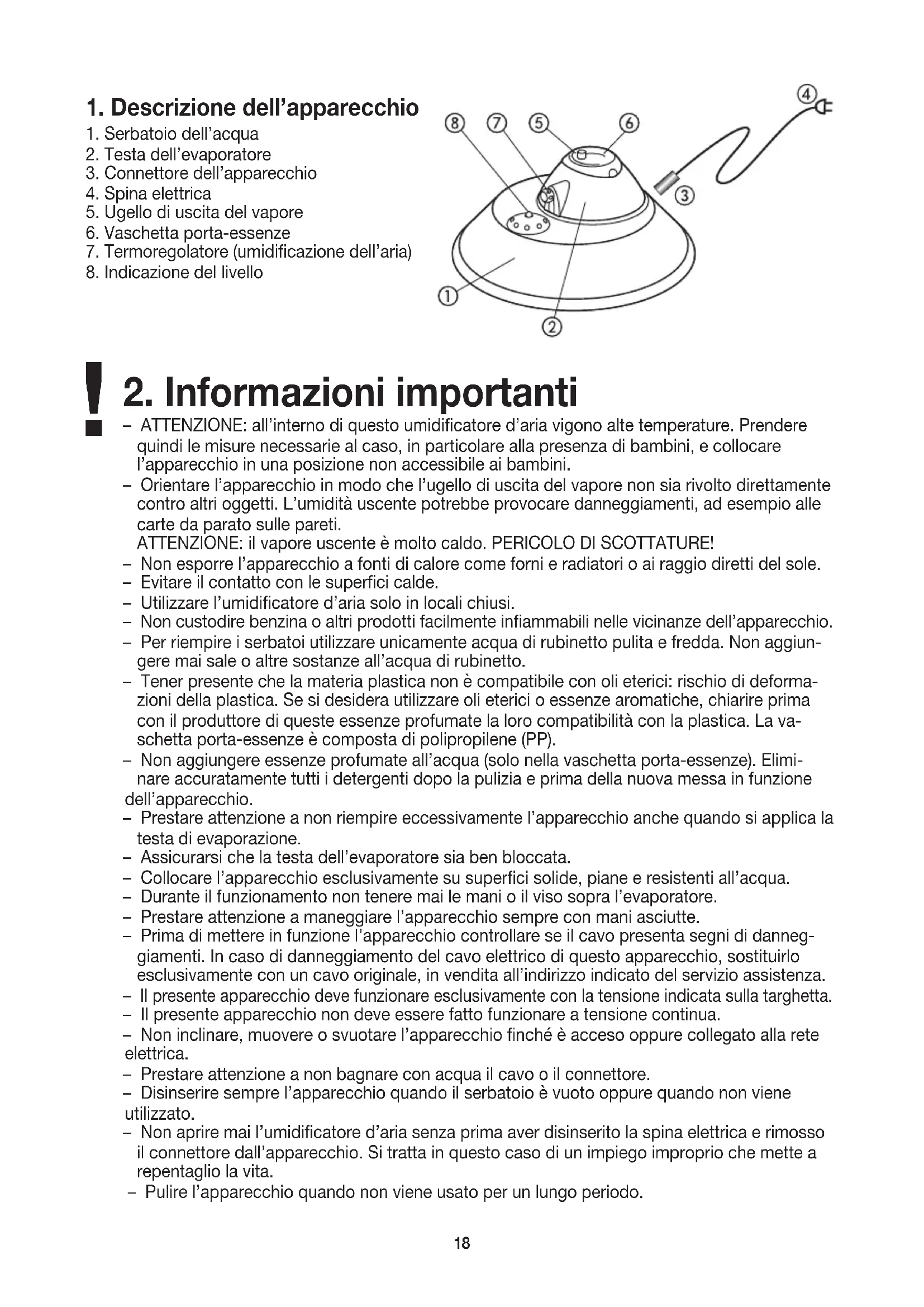 – ATTENZIONE: all’interno di questo umidificatore d’aria vigono alte temperature. Prendere quindi le misure necessarie al caso, in particolare alla presenza di bambini, e collocare l’apparecchio in una posizione non accessibile ai bambini. – Orientare l’apparecchio in modo che l’ugello di uscita del vapore non sia rivolto direttamente contro altri oggetti. L’umidità uscente potrebbe provocare danneggiamenti, ad esempio alle carte da parato sulle pareti. ATTENZIONE: il vapore uscente è molto caldo. PERICOLO DI SCOTTATURE! – Non esporre l’apparecchio a fonti di calore come forni e radiatori o ai raggio diretti del sole. – Evitare il contatto con le superfici calde. – Utilizzare l’umidificatore d’aria solo in locali chiusi. – Non custodire benzina o altri prodotti facilmente infiammabili nelle vicinanze dell’apparecchio. – Per riempire i serbatoi utilizzare unicamente acqua di rubinetto pulita e fredda. Non aggiun- gere mai sale o altre sostanze all’acqua di rubinetto. – Tener presente che la materia plastica non è compatibile con oli eterici: rischio di deforma- zioni della plastica. Se si desidera utilizzare oli eterici o essenze aromatiche, chiarire prima con il produttore di queste essenze profumate la loro compatibilità con la plastica. La va- schetta porta-essenze è composta di polipropilene (PP). – Non aggiungere essenze profumate all’acqua (solo nella vaschetta porta-essenze). Elimi- nare accuratamente tutti i detergenti dopo la pulizia e prima della nuova messa in funzione dell’apparecchio. – Prestare attenzione a non riempire eccessivamente l’apparecchio anche quando si applica la testa di evaporazione. – Assicurarsi che la testa dell’evaporatore sia ben bloccata. – Collocare l’apparecchio esclusivamente su superfici solide, piane e resistenti all’acqua. – Durante il funzionamento non tenere mai le mani o il viso sopra l’evaporatore. – Prestare attenzione a maneggiare l’apparecchio sempre con mani asciutte. – Prima di mettere in funzione l’apparecchio controllare se il cavo presenta segni di danneg- giamenti. In caso di danneggiamento del cavo elettrico di questo apparecchio, sostituirlo esclusivamente con un cavo originale, in vendita all’indirizzo indicato del servizio assistenza. – Il presente apparecchio deve funzionare esclusivamente con la tensione indicata sulla targhetta. – Il presente apparecchio non deve essere fatto funzionare a tensione continua. – Non inclinare, muovere o svuotare l’apparecchio finché è acceso oppure collegato alla rete elettrica. – Prestare attenzione a non bagnare con acqua il cavo o il connettore. – Disinserire sempre l’apparecchio quando il serbatoio è vuoto oppure quando non viene utilizzato. – Non aprire mai l’umidificatore d’aria senza prima aver disinserito la spina elettrica e rimosso il connettore dall’apparecchio. Si tratta in questo caso di un impiego improprio che mette a repentaglio la vita. – Pulire l’apparecchio quando non viene usato per un lungo periodo. !19 – Sconnettere la spina elettrica prima di iniziare qualunque intervento di pulizia. – Pulire l’apparecchio solo nel modo indicato (vedere punto 4). – Le riparazioni di apparecchi elettrici devono essere effettuate esclusivamente da personale qualificato. Riparazioni eseguite non correttamente o inadeguate possono creare gravi peri- coli per l’utente. – In caso di utilizzo improprio o non conforme alle presenti istruzioni d’uso sussiste il pericolo d’incendio!
