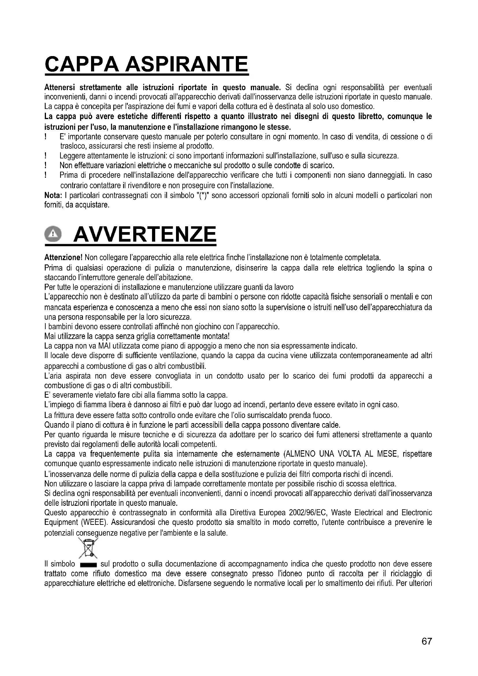 - EMC: EN 55014-1; CISPR 14-1; EN 55014-2; CISPR 14-2; CEI/EN 61000-3-2; CEI/EN 61000-3-3. Suggerimenti per un corretto utilizzo al fine di ridurre l’impatto ambientale: Quando iniziate a cucinare, accendere la cappa alla velocità minima, lasciandola accesa per alcuni minuti anche dopo il termine della cottura. Aumentare la velocità solo in caso di grandi quantità di fumo e vapore, utilizzando la funzione booster solo in casi estremi. Per mantenere ben efficiente il sistema di riduzione degli odori, sostituire, quando è necessario, il/i filtro/i carbone. Per mantenere ben efficiente il filtro del grasso, pulirlo in caso di necessità. Per ottimizzare l’efficienza e minimizzare i rumori, utilizzare il diametro massimo del sistema di canalizzazione indicato in questo manuale. ATTENZIONE! La mancata installazione di viti e dispositivi di fissaggio in conformità di queste istruzioni può comportare rischi di natura elettrica. UTILIZZAZIONE La cappa è realizzata per essere utilizzata in versione aspirante ad evacuazione esterna o filtrante a ricircolo interno. Versione aspirante I vapori vengono evacuati verso l’esterno tramite un tubo di scarico fissato alla flangia di raccordo. Il diametro del tubo di scarico deve essere equivalente al diametro dell'anello di connessione. Attenzione! Il tubo di evacuazione non è fornito e va acquistato. Nella parte orizzontale, il tubo deve avere una leggera inclinazione verso l’alto (10° circa) in modo da poter trasportare l’aria verso l’esterno più facilmente. Se la cappa è provvista di filtri al carbone, questi devono essere tolti. Collegare la cappa a tubi e fori di scarico a parete con diametro equivalente all'uscita d'aria (flangia di raccordo). L'utilizzo di tubi e fori di scarico a parete con diametro inferiore determinerà una diminuizione delle prestazioni di aspirazione ed un drastico aumento della rumorosità. Si declina perciò ogni responsabilità in merito. ! Usare un condotto lungo il minimo indispensabile. ! Usare un condotto con minor numero di curve possibile (angolo massimo della curva: 90°). ! Evitare cambiamenti drastici di sezione del condotto. ! Usare un condotto con l’interno più liscio possibile. ! Il materiale del condotto deve essere approvato normativamente. Versione filtrante L’aria aspirata verrà sgrassata e deodorata prima di essere riconvogliata nella stanza. Per utilizzare la cappa in questa versione è necessario installare un sistema di filtraggio aggiuntivo a base di carboni attivi.69 INSTALLAZIONE La distanza minima fra la superficie di supporto dei recipienti sul dispositivo di cottura e la parte più bassa della cappa da cucina deve essere non inferiore a 45cm in caso di cucine elettriche e di 50cm in caso di cucine a gas o miste. Se le istruzioni di installazione del dispositivo di cottura a gas specificano una distanza maggiore, bisogna tenerne conto. Collegamento Elettrico La tensione di rete deve corrispondere alla tensione riportata sull’etichetta caratteristiche situata all’interno della cappa. Se provvista di spina allacciare la cappa ad una presa conforme alle norme vigenti posta in zona accessibile anche dopo l’installazione. Se sprovvista di spina (collegamento diretto alla rete) o la spina non è posta in zona accessibile, anche dopo installazione, applicare un interruttore bipolare a norma che assicuri la disconnessione completa della rete nelle condizioni della categoria di sovratensione III, conformemente alle regole di installazione. Attenzione! Prima di ricollegare il circuito della cappa all’alimentazione di rete e di verificarne il corretto funzionamento, controllare sempre che il cavo di rete sia stato montato correttamente. La cappa è provvista di un cavo alimentazione speciale; in caso di danneggiamento del cavo, richiederlo al servizio assistenza tecnica. Montaggio Prodotto dal peso eccessivo, la movimentazione e installazione della cappa deve essere fatta da almeno due o più persone. Prima di iniziare con l'installazione: