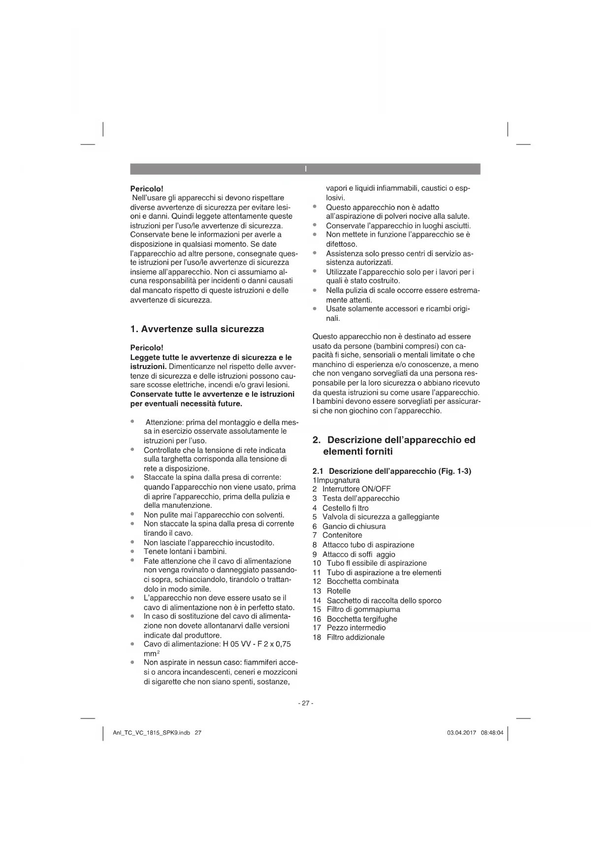 1 Impugnatura 2 Interruttore ON/OFF 3 Testa dell’apparecchio 4 Cestello fi ltro 5 Valvola di sicurezza a galleggiante 6 Gancio di chiusura 7 Contenitore 8 Attacco tubo di aspirazione 9 Attacco di soffi aggio 10 Tubo fl essibile di aspirazione 11 Tubo di aspirazione a tre elementi 12 Bocchetta combinata 13 Rotelle 14 Sacchetto di raccolta dello sporco 15 Filtro di gommapiuma 16 Bocchetta tergifughe 17 Pezzo intermedio 18 Filtro addizionale Anl_TC_VC_1815_SPK9.indb 27Anl_TC_VC_1815_SPK9.indb 27 03.04.2017 08:48:0403.04.2017 08:48:04I
