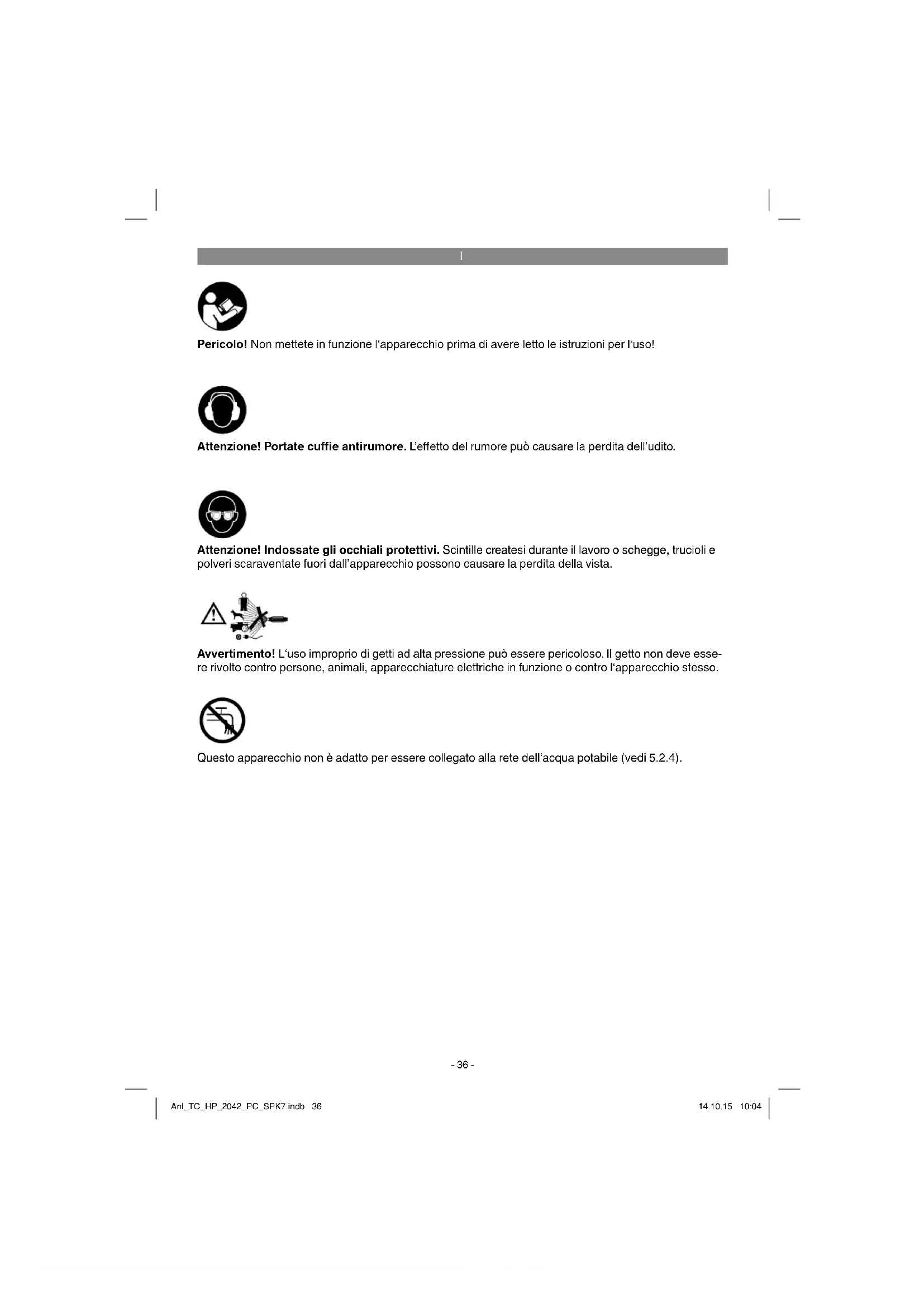 Attenzione! Portate cuffi e antirumore. L’e ff etto del rumore può causare la perdita dell’udito. Attenzione! Indossate gli occhiali protettivi. Scintille createsi durante il lavoro o schegge, trucioli e polveri scaraventate fuori dall’apparecchio possono causare la perdita della vista. Pericolo! Non mettete in funzione l‘apparecchio prima di avere letto le istruzioni per l‘uso! Avvertimento! L‘uso improprio di getti ad alta pressione può essere pericoloso. Il getto non deve esse- re rivolto contro persone, animali, apparecchiature elettriche in funzione o contro l‘apparecchio stesso. Questo apparecchio non è adatto per essere collegato alla rete dell‘acqua potabile (vedi 5.2.4). Anl_TC_HP_2042_PC_SPK7.indb 36Anl_TC_HP_2042_PC_SPK7.indb 36 14.10.15 10:0414.10.15 10:04I