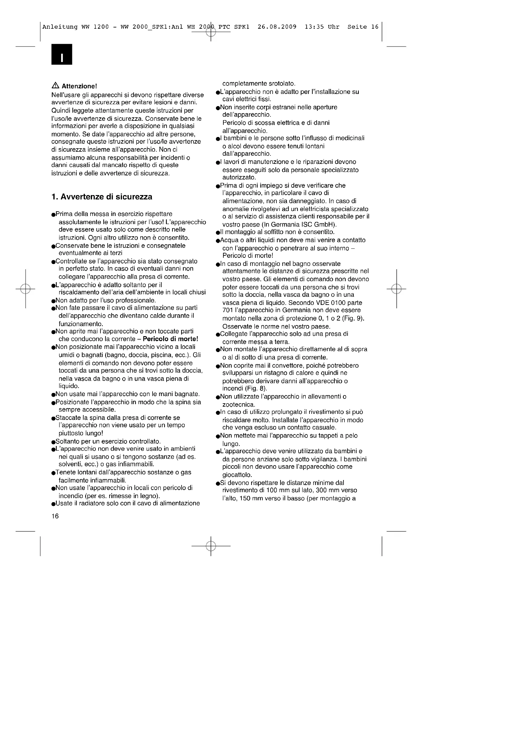 Prima della messa in esercizio rispettare assolutamente le istruzioni per lʼuso! Lʼapparecchio deve essere usato solo come descritto nelle istruzioni. Ogni altro utilizzo non è consentito. Conservate bene le istruzioni e consegnatele eventualmente ai terzi Controllate se lʼapparecchio sia stato consegnato in perfetto stato. In caso di eventuali danni non collegare lʼapparecchio alla presa di corrente. Lʼapparecchio è adatto soltanto per il riscaldamento dellʼaria dellʼambiente in locali chiusi Non adatto per lʼuso professionale. Non fate passare il cavo di alimentazione su parti dellʼapparecchio che diventano calde durante il funzionamento. Non aprite mai lʼapparecchio e non toccate parti che conducono la corrente – Pericolo di morte! Non posizionate mai lʼapparecchio vicino a locali umidi o bagnati (bagno, doccia, piscina, ecc.). Gli elementi di comando non devono poter essere toccati da una persona che si trovi sotto la doccia, nella vasca da bagno o in una vasca piena di liquido. Non usate mai lʼapparecchio con le mani bagnate. Posizionate lʼapparecchio in modo che la spina sia sempre accessibile. Staccate la spina dalla presa di corrente se lʼapparecchio non viene usato per un tempo piuttosto lungo! Soltanto per un esercizio controllato. Lʼapparecchio non deve venire usato in ambienti nei quali si usano o si tengono sostanze (ad es. solventi, ecc.) o gas infiammabili. Tenete lontani dallʼapparecchio sostanze o gas facilmente infiammabili. Non usate lʼapparecchio in locali con pericolo di incendio (per es. rimesse in legno). Usate il radiatore solo con il cavo di alimentazione completamente srotolato. Lʼapparecchio non è adatto per lʼinstallazione su cavi elettrici fissi. Non inserite corpi estranei nelle aperture dellʼapparecchio. Pericolo di scossa elettrica e di danni allʼapparecchio. I bambini e le persone sotto lʼinflusso di medicinali o alcol devono essere tenuti lontani dallʼapparecchio. I lavori di manutenzione e le riparazioni devono essere eseguiti solo da personale specializzato autorizzato. Prima di ogni impiego si deve verificare che lʼapparecchio, in particolare il cavo di alimentazione, non sia danneggiato. In caso di anomalie rivolgetevi ad un elettricista specializzato o al servizio di assistenza clienti responsabile per il vostro paese (In Germania ISC GmbH). Il montaggio al soffitto non è consentito. Acqua o altri liquidi non deve mai venire a contatto con lʼapparecchio o penetrare al suo interno – Pericolo di morte! In caso di montaggio nel bagno osservate attentamente le distanze di sicurezza prescritte nel vostro paese. Gli elementi di comando non devono poter essere toccati da una persona che si trovi sotto la doccia, nella vasca da bagno o in una vasca piena di liquido. Secondo VDE 0100 parte 701 lʼapparecchio in Germania non deve essere montato nella zona di protezione 0, 1 o 2 (Fig. 9). Osservate le norme nel vostro paese. Collegate lʼapparecchio solo ad una presa di corrente messa a terra. Non montate lʼapparecchio direttamente al di sopra o al di sotto di una presa di corrente. Non coprite mai il convettore, poiché potrebbero svilupparsi un ristagno di calore e quindi ne potrebbero derivare danni allʼapparecchio o incendi (Fig. 8). Non utilizzate lʼapparecchio in allevamenti o zootecnica. In caso di utilizzo prolungato il rivestimento si può riscaldare molto. Installate lʼapparecchio in modo che venga escluso un contatto casuale. Non mettete mai lʼapparecchio su tappeti a pelo lungo. Lʼapparecchio deve venire utilizzato da bambini e da persone anziane solo sotto vigilanza. I bambini piccoli non devono usare lʼapparecchio come giocattolo. Si devono rispettare le distanze minime dal rivestimento di 100 mm sul lato, 300 mm verso lʼalto, 150 mm verso il basso (per montaggio a Anleitung WW 1200 - WW 2000_SPK1:Anl WH 2000 PTC SPK1 26.08.2009 13:35 Uhr Seite 1617