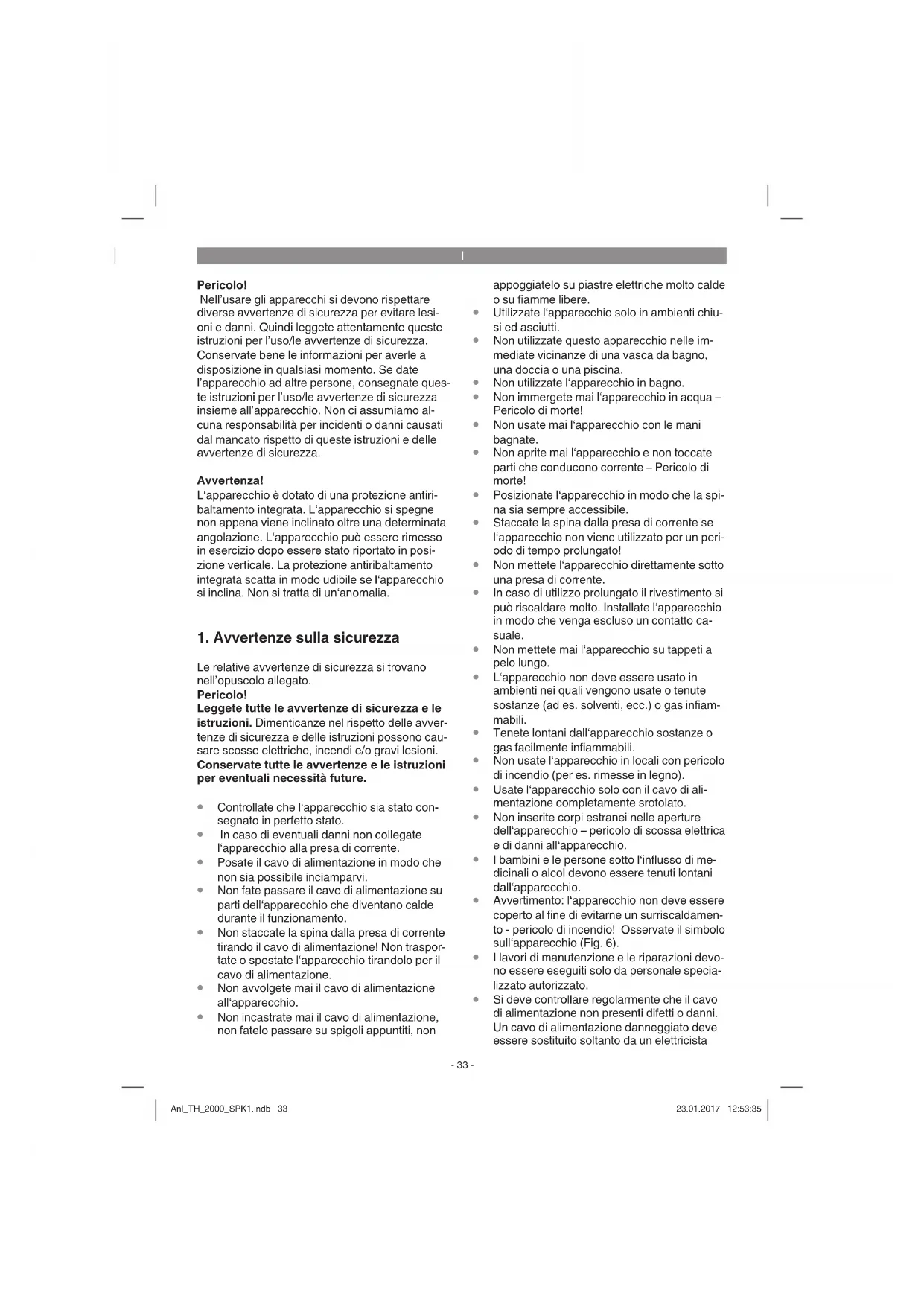 Pericolo! Nell’usare gli apparecchi si devono rispettare diverse avvertenze di sicurezza per evitare lesi- oni e danni. Quindi leggete attentamente queste istruzioni per l’uso/le avvertenze di sicurezza. Conservate bene le informazioni per averle a disposizione in qualsiasi momento. Se date l’apparecchio ad altre persone, consegnate ques- te istruzioni per l’uso/le avvertenze di sicurezza insieme all’apparecchio. Non ci assumiamo al- cuna responsabilità per incidenti o danni causati dal mancato rispetto di queste istruzioni e delle avvertenze di sicurezza. Avvertenza! L‘apparecchio è dotato di una protezione antiri- baltamento integrata. L‘apparecchio si spegne non appena viene inclinato oltre una determinata angolazione. L‘apparecchio può essere rimesso in esercizio dopo essere stato riportato in posi- zione verticale. La protezione antiribaltamento integrata scatta in modo udibile se l‘apparecchio si inclina. Non si tratta di un‘anomalia.