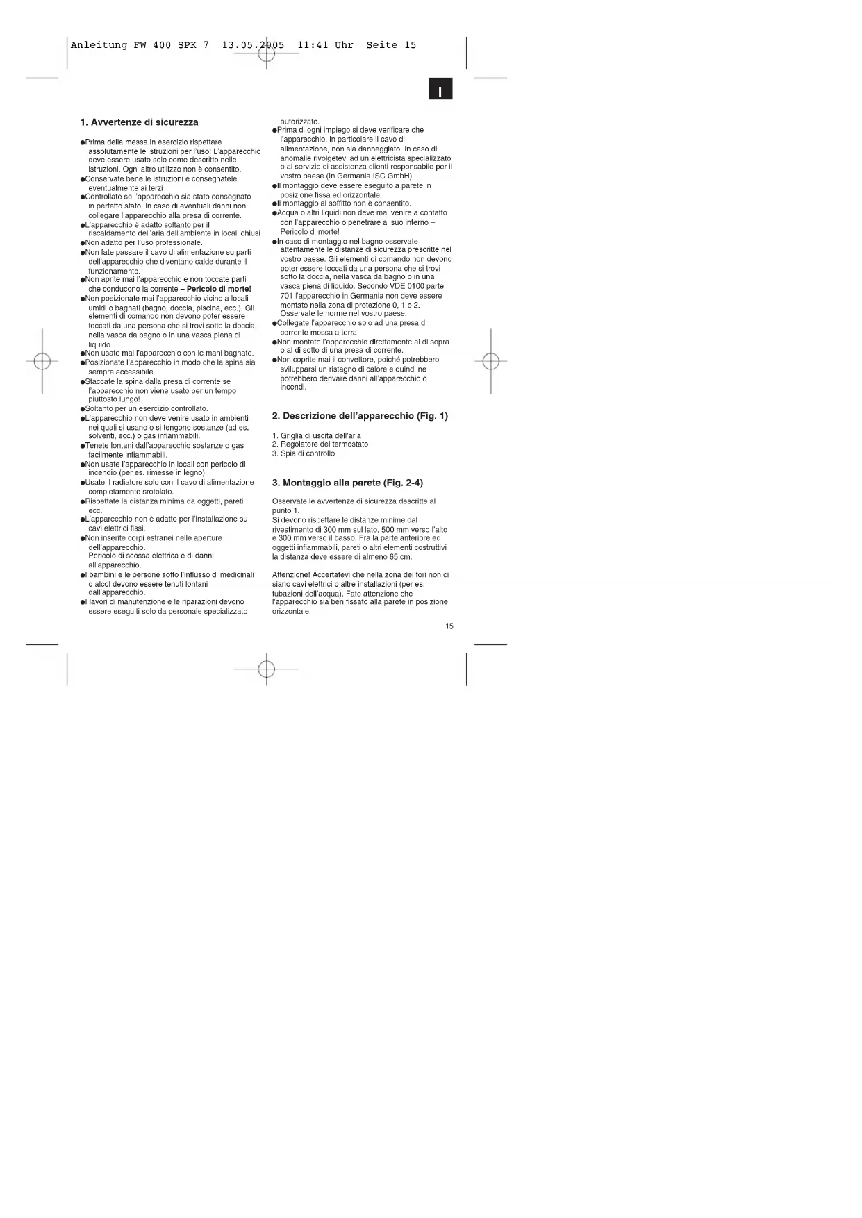 앬 Prima della messa in esercizio rispettare assolutamente le istruzioni per l’uso! L’apparecchio deve essere usato solo come descritto nelle istruzioni. Ogni altro utilizzo non è consentito. 앬 Conservate bene le istruzioni e consegnatele eventualmente ai terzi 앬 Controllate se l’apparecchio sia stato consegnato in perfetto stato. In caso di eventuali danni non collegare l’apparecchio alla presa di corrente. 앬 L’apparecchio è adatto soltanto per il riscaldamento dell’aria dell’ambiente in locali chiusi 앬 Non adatto per l’uso professionale. 앬 Non fate passare il cavo di alimentazione su parti dell’apparecchio che diventano calde durante il funzionamento. 앬 Non aprite mai l’apparecchio e non toccate parti che conducono la corrente – Pericolo di morte! 앬 Non posizionate mai l’apparecchio vicino a locali umidi o bagnati (bagno, doccia, piscina, ecc.). Gli elementi di comando non devono poter essere toccati da una persona che si trovi sotto la doccia, nella vasca da bagno o in una vasca piena di liquido. 앬 Non usate mai l’apparecchio con le mani bagnate. 앬 Posizionate l’apparecchio in modo che la spina sia sempre accessibile. 앬 Staccate la spina dalla presa di corrente se l’apparecchio non viene usato per un tempo piuttosto lungo! 앬 Soltanto per un esercizio controllato. 앬 L’apparecchio non deve venire usato in ambienti nei quali si usano o si tengono sostanze (ad es. solventi, ecc.) o gas infiammabili. 앬 Tenete lontani dall’apparecchio sostanze o gas facilmente infiammabili. 앬 Non usate l’apparecchio in locali con pericolo di incendio (per es. rimesse in legno). 앬 Usate il radiatore solo con il cavo di alimentazione completamente srotolato. 앬 Rispettate la distanza minima da oggetti, pareti ecc. 앬 L’apparecchio non è adatto per l’installazione su cavi elettrici fissi. 앬 Non inserite corpi estranei nelle aperture dell’apparecchio. Pericolo di scossa elettrica e di danni all’apparecchio. 앬 I bambini e le persone sotto l’influsso di medicinali o alcol devono essere tenuti lontani dall’apparecchio. 앬 I lavori di manutenzione e le riparazioni devono essere eseguiti solo da personale specializzato autorizzato. 앬 Prima di ogni impiego si deve verificare che l’apparecchio, in particolare il cavo di alimentazione, non sia danneggiato. In caso di anomalie rivolgetevi ad un elettricista specializzato o al servizio di assistenza clienti responsabile per il vostro paese (In Germania ISC GmbH). 앬 Il montaggio deve essere eseguito a parete in posizione fissa ed orizzontale. 앬 Il montaggio al soffitto non è consentito. 앬 Acqua o altri liquidi non deve mai venire a contatto con l’apparecchio o penetrare al suo interno – Pericolo di morte! 앬 In caso di montaggio nel bagno osservate attentamente le distanze di sicurezza prescritte nel vostro paese. Gli elementi di comando non devono poter essere toccati da una persona che si trovi sotto la doccia, nella vasca da bagno o in una vasca piena di liquido. Secondo VDE 0100 parte 701 l’apparecchio in Germania non deve essere montato nella zona di protezione 0, 1 o 2. Osservate le norme nel vostro paese. 앬 Collegate l’apparecchio solo ad una presa di corrente messa a terra. 앬 Non montate l’apparecchio direttamente al di sopra o al di sotto di una presa di corrente. 앬 Non coprite mai il convettore, poiché potrebbero svilupparsi un ristagno di calore e quindi ne potrebbero derivare danni all’apparecchio o incendi.